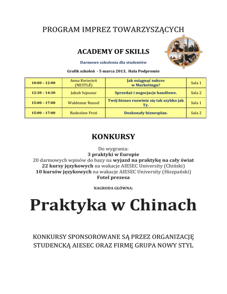 PROGRAM IMPREZ TOWARZYSZĄCYCH ACADEMY OF SKILLS Darmowe szkolenia dla studentów Grafik szkoleń - 5 marca 2013, Hala Podpromie 10:00 – 12:00 Anna Kwiecień (NESTLÉ) Jak osiągnąć sukces w Marketingu? Sala 1 12:30 – 14:30 Jakub Szpunar Sprzedaż i negocjacje handlowe. Sala 2 15:00 – 17:00 Waldemar Ruszel Twój biznes rozwinie się tak szybko jak Ty. Sala 1 15:00 – 17:00 Radosław Froń Doskonały biznesplan. Sala 2 KONKURSY Do wygrania: 3 praktyki w Europie 20 darmowych wpisów do bazy na wyjazd na praktykę na cały świat 22 kursy językowych na wakacje AIESEC University (Chiński) 10 kursów językowych na wakacje AIESEC University (Hiszpański) Fotel prezesa NAGRODA GŁÓWNA: Praktyka w Chinach KONKURSY SPONSOROWANE SĄ PRZEZ ORGANIZACJĘ STUDENCKĄ AIESEC ORAZ FIRMĘ GRUPA NOWY STYL