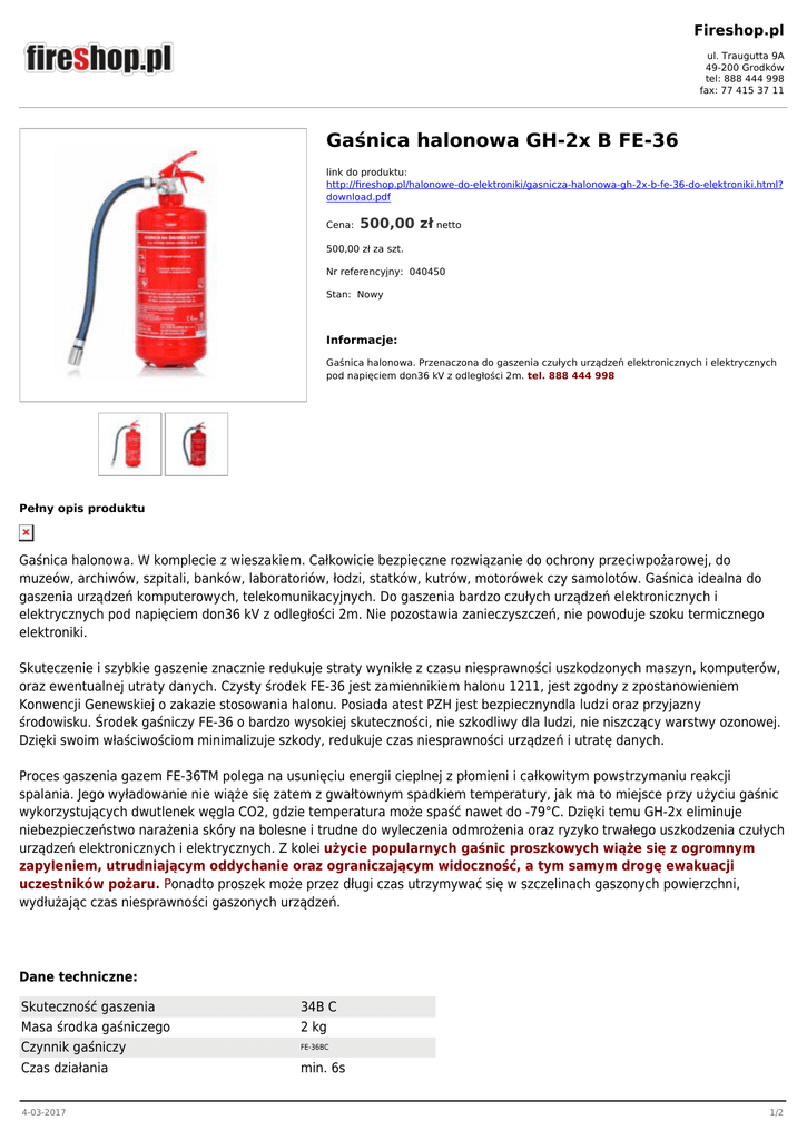 Fireshop.pl ul. Traugutta 9A 49-200 Grodków tel: 888 444 998 fax: 77 415 37 11 Gaśnica halonowa GH-2x B FE-36 link do produktu: http://fireshop.pl/halonowe-do-elektroniki/gasnicza-halonowa-gh-2x-b-fe-36-do-elektroniki.html? download.pdf Cena: 500,00 zł netto 500,00 zł za szt. Nr referencyjny: 040450 Stan: Nowy Informacje: Gaśnica halonowa. Przenaczona do gaszenia czułych urządzeń elektronicznych i elektrycznych pod napięciem don36 kV z odległości 2m. tel. 888 444 998 Pełny opis produktu Gaśnica halonowa. W komplecie z wieszakiem. Całkowicie bezpieczne rozwiązanie do ochrony przeciwpożarowej, do muzeów, archiwów, szpitali, banków, laboratoriów, łodzi, statków, kutrów, motorówek czy samolotów. Gaśnica idealna do gaszenia urządzeń komputerowych, telekomunikacyjnych. Do gaszenia bardzo czułych urządzeń elektronicznych i elektrycznych pod napięciem don36 kV z odległości 2m. Nie pozostawia zanieczyszczeń, nie powoduje szoku termicznego elektroniki. Skuteczenie i szybkie gaszenie znacznie redukuje straty wynikłe z czasu niesprawności uszkodzonych maszyn, komputerów, oraz ewentualnej utraty danych. Czysty środek FE-36 jest zamiennikiem halonu 1211, jest zgodny z zpostanowieniem Konwencji Genewskiej o zakazie stosowania halonu. Posiada atest PZH jest bezpiecznyndla ludzi oraz przyjazny środowisku. Środek gaśniczy FE-36 o bardzo wysokiej skuteczności, nie szkodliwy dla ludzi, nie niszczący warstwy ozonowej. Dzięki swoim właściwościom minimalizuje szkody, redukuje czas niesprawności urządzeń i utratę danych. Proces gaszenia gazem FE-36TM polega na usunięciu energii cieplnej z płomieni i całkowitym powstrzymaniu reakcji spalania. Jego wyładowanie nie wiąże się zatem z gwałtownym spadkiem temperatury, jak ma to miejsce przy użyciu gaśnic wykorzystujących dwutlenek węgla CO2, gdzie temperatura może spaść nawet do -79°C. Dzięki temu GH-2x eliminuje niebezpieczeństwo narażenia skóry na bolesne i trudne do wyleczenia odmrożenia oraz ryzyko trwałego uszkodzenia czułych urządzeń elektronicznych i elektrycznych. Z kolei użycie popularnych gaśnic proszkowych wiąże się z ogromnym zapyleniem, utrudniającym oddychanie oraz ograniczającym widoczność, a tym samym drogę ewakuacji uczestników pożaru. Ponadto proszek może przez długi czas utrzymywać się w szczelinach gaszonych powierzchni, wydłużając czas niesprawności gaszonych urządzeń. Dane techniczne: Skuteczność gaszenia Masa środka gaśniczego Czynnik gaśniczy Czas działania 4-03-2017 34B C 2 kg FE-36BC min. 6s 1/2 Ciśnienie robocze 10 bar Zakres temperatur stosowania -20oC / +60oC 4,5 kg 36 000 V Azot N2 28 bar Masa całkowita Maks. napięcie gaszonego urządz. Czynnik napędowy Cisnienie próbne zbiornika Wymiary: Wysokość Średnica zbiornika 325 mm 110mm Jedyna na polskim rynku gaśnica ze środkiem gaśniczym FE-36, zamiennikiem halonu 1211. Zalety: - gaszenie nie powoduje zniszczeń gaszonego przedmiotu - nie pozostawia zanieczyszczeń - nie niszczy dokumentów, przedmiotów wartościowych obrazów itp. - idealny do gaszenia elektroniki komputerowej Certyfikaty i atesty: Środek gaśniczy FE-36 posiada Atest Państwowego Zakładu Higieny NrnPZH/HT-2363/2010 Według opinii Biura Ochrony Warstwy Ozonowejnśrodek gaśniczy FE-36 nie należy do grupy substancji kontrolowanych Protokołem Montrealskim. Opinia techniczna Stacji Ratownictwa Górniczego PRODUKT POSIADA ŚWIADECTWO DOPUSZCZENIA NR0572/2009 wydane przez CNBOP oraz ZNAK CE. Zalecenia: Zgodnie z rozporządzeniem o ochronie przeciwpożarowej sprawność gaśnicy należy sprawdzać, nie rzadziej niż co 12 miesięcy. Gwarancja 3 lata, pod warunkiem corocznych przeglądów w autoryzowanym punkcie. Serwis gaśnic wykonują Autoryzowane przez producenta zakłady serwisowe na terenie całego kraju. Zadzwoń do doradcy tel. 888 444 998 Powiązane produkty Znak 12 Gaśnica F01 4,50 zł Szafka na gaśnice... 79,90 zł Pianka - przylepi... 5,90 zł Instrukcja PPOZ a... 3,90 zł Czujka - detektor... 39,90 zł Apteczka z wyposa... 49,00 zł 4-03-2017 Instrukcja PPOZ g... 5,95 zł 2/2