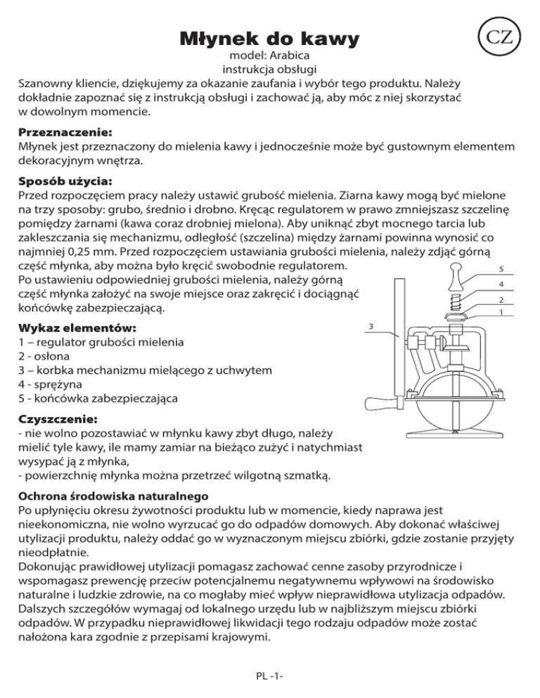 Młynek do kawy model: Arabica instrukcja obsługi Szanowny kliencie, dziękujemy za okazanie zaufania i wybór tego produktu. Należy dokładnie zapoznać się z instrukcją obsługi i zachować ją, aby móc z niej skorzystać w dowolnym momencie. CZ Przeznaczenie: Młynek jest przeznaczony do mielenia kawy i jednocześnie może być gustownym elementem dekoracyjnym wnętrza. Sposób użycia: Przed rozpoczęciem pracy należy ustawić grubość mielenia. Ziarna kawy mogą być mielone na trzy sposoby: grubo, średnio i drobno. Kręcąc regulatorem w prawo zmniejszasz szczelinę pomiędzy żarnami (kawa coraz drobniej mielona). Aby uniknąć zbyt mocnego tarcia lub zakleszczania się mechanizmu, odległość (szczelina) między żarnami powinna wynosić co najmniej 0,25 mm. Przed rozpoczęciem ustawiania grubości mielenia, należy zdjąć górną część młynka, aby można było kręcić swobodnie regulatorem. 5 Po ustawieniu odpowiedniej grubości mielenia, należy górną 4 część młynka założyć na swoje miejsce oraz zakręcić i dociągnąć 2 końcówkę zabezpieczającą. 1 Wykaz elementów: 1 – regulator grubości mielenia 2 - osłona 3 – korbka mechanizmu mielącego z uchwytem 4 - sprężyna 5 - końcówka zabezpieczająca 3 Czyszczenie: - nie wolno pozostawiać w młynku kawy zbyt długo, należy mielić tyle kawy, ile mamy zamiar na bieżąco zużyć i natychmiast wysypać ją z młynka, - powierzchnię młynka można przetrzeć wilgotną szmatką. Ochrona środowiska naturalnego Po upłynięciu okresu żywotności produktu lub w momencie, kiedy naprawa jest nieekonomiczna, nie wolno wyrzucać go do odpadów domowych. Aby dokonać właściwej utylizacji produktu, należy oddać go w wyznaczonym miejscu zbiórki, gdzie zostanie przyjęty nieodpłatnie. Dokonując prawidłowej utylizacji pomagasz zachować cenne zasoby przyrodnicze i wspomagasz prewencję przeciw potencjalnemu negatywnemu wpływowi na środowisko naturalne i ludzkie zdrowie, na co mogłaby mieć wpływ nieprawidłowa utylizacja odpadów. Dalszych szczegółów wymagaj od lokalnego urzędu lub w najbliższym miejscu zbiórki odpadów. W przypadku nieprawidłowej likwidacji tego rodzaju odpadów może zostać nałożona kara zgodnie z przepisami krajowymi. PL -1- Serwis Jeżeli po zakupieniu produktu stwierdzisz, że jest on uszkodzony, skontaktuj się ze sprzedawcą. Używając produktu należy przestrzegać zasad zawartych w załączonej instrukcji obsługi. Reklamacja nie będzie uznana, jeżeli nie stosowano się do wskazówek zawartych w instrukcji obsługi. Gwarancja nie obejmuje: - naturalnego zużycia elementów pracujących produktu w trakcie jego normalnego użytkowania, - czynności serwisowych związanych ze standardową konserwacją produktu (np. czyszczenie, wymiana elementów zużywających się podczas normalnego użytkowania), - usterek spowodowanych wpływem warunków zewnętrznych (np. warunki atmosferyczne, zapylenie, nieodpowiednie użytkowanie itp.), - uszkodzeń mechanicznych powstałych w związku z upadkiem produktu, uderzenia nim itp., - uszkodzeń powstałych w wyniku niewłaściwego posługiwania się produktem, używania produktu w sposób nie zgodny z instrukcją obsługi, przeciążania go, używania nieodpowiednich lub nieoryginalnych części zamiennych, wykorzystywania nieoryginalnych akcesoriów bądź narzędzi itp., - uszkodzeń spowodowanych używaniem nieoryginalnych zasilaczy lub używaniem oryginalnego zasilacza w połączeniu z innym produktem. Należy zawsze zachowywać zgodność w ramach jednego produktu. Za uszkodzenia mechaniczne reklamowanego produktu powstałe w wyniku nieprawidłowo zabezpieczenia transportowanego przedmiotu odpowiada jego właściciel. Producent zastrzega sobie prawo do wprowadzania ewentualnych zmian w instrukcji obsługi i nie odpowiada za błędy powstałe w druku. Ilustracje i opisy mogą odbiegać od rzeczywistości w zależności od modelu produktu. PL -2-