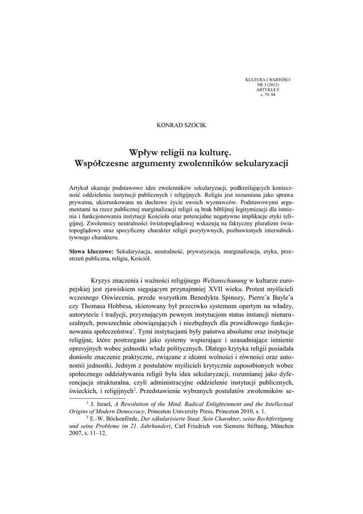 KULTURA I WARTOŚCI NR 3 (2012) ARTYKUŁY s. 79–94 KONRAD SZOCIK Wpływ religii na kulturę. Współczesne argumenty zwolenników sekularyzacji Artykuł ukazuje podstawowe idee zwolenników sekularyzacji, podkreślających konieczność oddzielenia instytucji publicznych i religijnych. Religia jest rozumiana jako sprawa prywatna, ukierunkowana na duchowe życie swoich wyznawców. Podstawowymi argumentami na rzecz publicznej marginalizacji religii są brak biblijnej legitymizacji dla istnienia i funkcjonowania instytucji Kościoła oraz potencjalne negatywne implikacje etyki religijnej. Zwolennicy neutralności światopoglądowej wskazują na faktyczny pluralizm światopoglądowy oraz specyficzny charakter religii pozytywnych, pozbawionych intersubiektywnego charakteru. Słowa kluczowe: Sekularyzacja, neutralność, prywatyzacja, marginalizacja, etyka, przestrzeń publiczna, religia, Kościół. Kryzys znaczenia i ważności religijnego Weltanschauung w kulturze europejskiej jest zjawiskiem sięgającym przynajmniej XVII wieku. Protest myślicieli wczesnego Oświecenia, przede wszystkim Benedykta Spinozy, Pierre’a Bayle’a czy Thomasa Hobbesa, skierowany był przeciwko systemom opartym na władzy, autorytecie i tradycji, przyznającym pewnym instytucjom status instancji nienaruszalnych, powszechnie obowiązujących i niezbędnych dla prawidłowego funkcjonowania społeczeństwa1. Tymi instytucjami były państwa absolutne oraz instytucje religijne, które postrzegano jako systemy wspierające i uzasadniające istnienie opresyjnych wobec jednostki władz politycznych. Dlatego krytyka religii posiadała doniosłe znaczenie praktyczne, związane z ideami wolności i równości oraz autonomii jednostki. Jednym z postulatów myślicieli krytycznie usposobionych wobec społecznego oddziaływania religii była idea sekularyzacji, rozumianej jako dyferencjacja strukturalna, czyli administracyjne oddzielenie instytucji publicznych, świeckich, i religijnych 2. Przedstawienie wybranych postulatów zwolenników se1 J. Israel, A Rewolution of the Mind. Radical Enlightenment and the Intellectual Origins of Modern Democracy, Princeton University Press, Princeton 2010, s. 1. 2 E.-W. Böckenförde, Der säkularisierte Staat. Sein Charakter, seine Rechtfertigung und seine Probleme im 21. Jahrhundert, Carl Friedrich von Siemens Stiftung, München 2007, s. 11–12. KONRAD SZOCIK – WPŁYW RELIGII NA KULTURĘ. WYBRANE ARGUMENTY... kularyzacji politycznej, wraz z towarzyszącą im problematyką etyczną, stanowi przedmiot tego artykułu. GENEZA SEKULARYZACJI Sekularyzacja jest procesem wieloetapowym, obejmującym zarówno idee filozoficzne, jak również struktury społeczne. Dlatego stanowi obiekt analiz różnych dyscyplin, przede wszystkim socjologii i filozofii. Przedmiotem naszego zainteresowania jest wyłącznie płaszczyzna filozoficzna, skoncentrowana na próbie dostrzeżenia nadrzędnych idei odpowiadających za pojawienie się i rozwój tego zjawiska. Niewątpliwie warunkiem niezbędnym dla propagacji idei jest istnienie określonego stanu społecznego i ekonomicznego, którego brak może prowadzić do istnienia dysonansu między sferą idei i projektów filozoficznych, a praktyką społeczną3. Przykładem takiego rozdźwięku jest sytuacja siedemnastowiecznej Europy, która znała radykalne i nowatorskie idee dzięki pracom Benedykta Barucha Spinozy, Rene Descartesa, Pierre’a Bayle’a czy Thomasa Hobbesa, ale uległa rewolucyjnym przekształceniom dopiero w drugiej połowie XVIII wieku, przede wszystkim za sprawą społecznego i ekonomicznego rozwoju francuskiej burżuazji i modyfikacji społecznej świadomości, m. in. wskutek rozwoju nauki i techniki czy protestanckiego Weltanschauung. Wydaje się, że rozwój idei racjonalnych i krytycznych wobec tradycyjnego porządku religijnego nie byłby możliwy bez szybkiego rozwoju standardu życia i stopnia industrializacji, a w konsekwencji, bez przejścia od społeczności o charakterze rolniczym do społeczności przemysłowych. Te zmiany spowodowały modyfikację koncepcji metafizycznych, ograniczając niezbędność i ważność roli przypisywanej wcześniej Bogu 4. Sekularyzacja obejmuje zespół idei, oznaczających wycofanie się instytucji religijnych z aspektów przestrzeni społecznej i kulturowej dotychczas kierowanych, czy zdominowanych, przez te instytucje; oznacza wyzwolenie się instytucji politycznych, kulturowych, naukowych i innych spod władzy i wpływu instytucji religijnych; wreszcie, sekularyzacja to wyrugowanie treści i idei religijnych ze wszystkim aspektów ludzkiej kultury, obejmującej filozofię, sztukę, rozrywkę, naukę, itp5. Tym terminem oznaczano zarówno wyzwolenie się człowieka spod wpływu religii, jak również, w religijnym użyciu tego terminu, wskazywano na „dechrystianizację” i „poganizację” kultury6. Sekularyzacja, w skrócie, oznacza zastąpienie kultury, instytucji, Weltanschauung religijnego i teistycznego analogicznymi komponentami świeckimi, zarówno na płaszczyźnie politycznej, jak kulturowej i 3 P. L. Berger, Święty baldachim. Elementy socjologicznej teorii religii, tłum. W. Kurdziel, Zakład Wydawniczy Nomos, Kraków 1997, s. 154. 4 P. Norris, R. Inglehart, Sacrum i profanum. Religia i polityka na świecie, tłum. R. Babińska, Zakład Wydawniczy Nomos, Kraków 2006, s. 48–50. 5 F. Adamski, Secolarizzazione della cultura. Interpretazioni teoriche e conseguenze pratiche, [w:] Rassegna di Pedagogia. Pädagogische Umschau, 4 Ottobre. Dicembre 1985, [s. n.], Pisa 1985, s. 252. 80 KONRAD SZOCIK – WPŁYW RELIGII NA KULTURĘ. WYBRANE ARGUMENTY... dotyczącej wszystkich aspektów Weltanschauung7. Interesujący nas rozdział Kościoła od państwa jest także formą sekularyzacji, podobnie jak sekularyzacja świadomości, przejawiająca się w interpretowaniu świata w kategoriach a – religijnych8. Emile Durkheim, Thomas Luckmann, Peter Berger czy Talcott Parsons wskazują – 