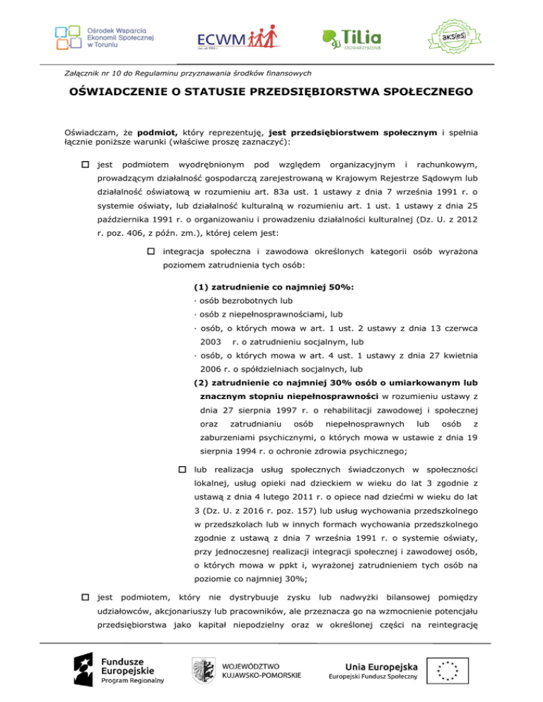Załącznik nr 10 do Regulaminu przyznawania środków finansowych OŚWIADCZENIE O STATUSIE PRZEDSIĘBIORSTWA SPOŁECZNEGO Oświadczam, że podmiot, który reprezentuję, jest przedsiębiorstwem społecznym i spełnia łącznie poniższe warunki (właściwe proszę zaznaczyć): □ jest podmiotem wyodrębnionym pod względem organizacyjnym i rachunkowym, prowadzącym działalność gospodarczą zarejestrowaną w Krajowym Rejestrze Sądowym lub działalność oświatową w rozumieniu art. 83a ust. 1 ustawy z dnia 7 września 1991 r. o systemie oświaty, lub działalność kulturalną w rozumieniu art. 1 ust. 1 ustawy z dnia 25 października 1991 r. o organizowaniu i prowadzeniu działalności kulturalnej (Dz. U. z 2012 r. poz. 406, z późn. zm.), której celem jest: □ integracja społeczna i zawodowa określonych kategorii osób wyrażona poziomem zatrudnienia tych osób: (1) zatrudnienie co najmniej 50%: · osób bezrobotnych lub · osób z niepełnosprawnościami, lub · osób, o których mowa w art. 1 ust. 2 ustawy z dnia 13 czerwca 2003 r. o zatrudnieniu socjalnym, lub · osób, o których mowa w art. 4 ust. 1 ustawy z dnia 27 kwietnia 2006 r. o spółdzielniach socjalnych, lub (2) zatrudnienie co najmniej 30% osób o umiarkowanym lub znacznym stopniu niepełnosprawności w rozumieniu ustawy z dnia 27 sierpnia 1997 r. o rehabilitacji zawodowej i społecznej oraz zatrudnianiu osób niepełnosprawnych lub osób z zaburzeniami psychicznymi, o których mowa w ustawie z dnia 19 sierpnia 1994 r. o ochronie zdrowia psychicznego; □ lub realizacja usług społecznych świadczonych w społeczności lokalnej, usług opieki nad dzieckiem w wieku do lat 3 zgodnie z ustawą z dnia 4 lutego 2011 r. o opiece nad dziećmi w wieku do lat 3 (Dz. U. z 2016 r. poz. 157) lub usług wychowania przedszkolnego w przedszkolach lub w innych formach wychowania przedszkolnego zgodnie z ustawą z dnia 7 września 1991 r. o systemie oświaty, przy jednoczesnej realizacji integracji społecznej i zawodowej osób, o których mowa w ppkt i, wyrażonej zatrudnieniem tych osób na poziomie co najmniej 30%; □ jest podmiotem, który nie dystrybuuje zysku lub nadwyżki bilansowej pomiędzy udziałowców, akcjonariuszy lub pracowników, ale przeznacza go na wzmocnienie potencjału przedsiębiorstwa jako kapitał niepodzielny oraz w określonej części na reintegrację zawodową i społeczną lub na działalność pożytku publicznego prowadzoną na rzecz społeczności lokalnej, w której działa przedsiębiorstwo; □ jest zarządzany na zasadach demokratycznych, co oznacza, że struktura zarządzania przedsiębiorstwami społecznymi lub ich struktura własnościowa opiera się na współzarządzaniu w przypadku spółdzielni, akcjonariacie pracowniczym lub zasadach partycypacji pracowników, co podmiot określa w swoim statucie lub innym dokumencie założycielskim; □ wynagrodzenia kadry zarządzającej są ograniczone limitami tj. nie przekraczają wartości, o której mowa w art. 9 ust. 1 pkt 2 ustawy z dnia 24 kwietnia 2003 r. o działalności pożytku publicznego i o wolontariacie; □ zatrudnia w oparciu o umowę o pracę, spółdzielczą umowę o pracę lub umowę cywilnoprawną co najmniej trzy osoby, przy zachowaniu proporcji zatrudnienia określonych w lit. a. Miejscowość, data Czytelny podpis osoby upoważnionej do reprezentacji podmiotu