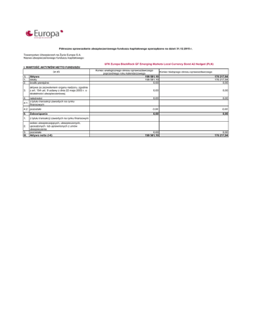 Półroczne sprawozdanie ubezpieczeniowego funduszu kapitałowego sporządzone na dzień 31.12.2015 r. Towarzystwo Ubezpieczeń na Życie Europa S.A. Nazwa ubezpieczeniowego funduszu kapitałowego: UFK Europa BlackRock GF Emerging Markets Local Currency Bond A2 Hedged (PLN) I. WARTOŚĆ AKTYWÓW NETTO FUNDUSZU (w zł) I. 1. 2. Aktywa lokaty środki pieniężne 3. aktywa za zezwoleniem organu nadzoru, zgodnie z art. 154 ust. 9 ustawy z dnia 22 maja 2003 r. o działalności ubezpieczeniowej 4. 4.1. należności z tytułu transakcji zawartych na rynku finansowym 4.2. pozostałe II. Zobowiązania 1. z tytułu transakcji zawartych na rynku finansowym 2. 3. III. wobec ubezpieczających, ubezpieczonych, uposażonych lub uprawnionych z umów ubezpieczenia pozostałe Aktywa netto (I-II) Koniec analogicznego okresu sprawozdawczego Koniec bieżącego okresu sprawozdawczego poprzedniego roku kalendarzowego 198 581,19 176 217,94 198 581,19 176 217,94 0,00 0,00 0,00 0,00 0,00 0,00 0,00 0,00 0,00 0,00 0,00 198 581,19 0,00 176 217,94 Półroczne sprawozdanie ubezpieczeniowego funduszu kapitałowego sporządzone na dzień 31.12.2015 r. Towarzystwo Ubezpieczeń na Życie Europa S.A. Nazwa ubezpieczeniowego funduszu kapitałowego: UFK Europa BlackRock GF Emerging Markets Local Currency Bond A2 Hedged (PLN) II. ZMIANY AKTYWÓW NETTO FUNDUSZU (w zł) A. Aktywa netto funduszu na początek okresu sprawozdawczego B. Stan netto z działalności operacyjnej (I-II) I. 1. Zwiększenia funduszu tytułem składek zwiększających wartość funduszu pozostałe przychody pozostałe zwiększenia Zmniejszenia funduszu tytułem wykupu tytułem wypłat pozostałych świadczeń ubezpieczeniowych tytułem opłaty za ryzyko ubezpieczeniowe oraz innych opłat potrącanych z fuduszu tytułem zwrotu składek ubezpieczeniowych tytułem opłat za zarządzanie funduszem oraz innych opłat tytułem administrowania funduszem pozostałe koszty 2. 3. II. 1. 2. 3. 4. 5. 6. 7. Analogiczny okres sprawozdawczy poprzedniego roku kalendarzowego Bieżący okres sprawozdawczy 0,00 198 581,19 217 537,48 317 683,28 4 034,13 83 235,57 317 683,28 83 235,57 100 145,80 98 717,94 79 201,44 77 289,86 27,97 37,45 1 399,89 1 874,13 -18 956,29 -26 397,38 198 581,19 176 217,94 pozostałe zmniejszenia C. Wynik netto z działalności inwestycyjnej D. Aktywa netto funduszu na koniec okresu sprawozdawczego Półroczne sprawozdanie ubezpieczeniowego funduszu kapitałowego sporządzone na dzień 31.12.2015 r. Towarzystwo Ubezpieczeń na Życie Europa S.A. Nazwa ubezpieczeniowego funduszu kapitałowego: III I. 1. 2. II. 1. 2. 3. 4. UFK Europa BlackRock GF Emerging Markets Local Currency Bond A2 Hedged (PLN) LICZBA I WARTOŚĆ JEDNOSTEK ROZRACHUNKOWYCH Analogiczny okres sprawozdawczy poprzedniego roku (w zł) Bieżący okres sprawozdawczy kalendarzowego Liczba jednostek rozrachunkowych: 0,0000 20 222,1179 na początek okresu sprawozdawczego 20 222,1179 20 804,9489 na koniec okresu sprawozdawczego Wartość jednostki rozrachunkowej (w zł): 0,00 9,82 na początek okresu sprawozdawczego minimalna wartość jednostki rozrachunkowej w 9,47 8,31 okresie sprawozdawczym maksymalna wartość jednostki rozrachunkowej w 10,91 9,94 okresie sprawozdawczym 9,82 8,47 na koniec okresu sprawozdawczego Półroczne sprawozdanie ubezpieczeniowego funduszu kapitałowego sporządzone na dzień 31.12.2015 r. Towarzystwo Ubezpieczeń na Życie Europa S.A. Nazwa ubezpieczeniowego funduszu kapitałowego: UFK Europa BlackRock GF Emerging Markets Local Currency Bond A2 Hedged (PLN) IV I. 1. 2. ZESTAWIENIE AKTYWÓW NETTO FUNDUSZU (w zł) Lokaty (suma 1-12) papiery wartościowe emitowane, poręczone lub gwarantowane przez Skarb Państwa lub organizacje międzynarodowe, których członkiem jest Rzeczpospolita Polska obligacje emitowane lub poręczone przez jednostki samorządu terytorialnego lub związki jednostek samorządu terytorialnego Wartość bilansowa (w zł) Udział w aktywach netto funduszu (w %) 176 217,94 100,00% 0,00 0,00% 0,00% 3. Inne dłużne papiery wartościowe o stałej stopie dochodu 0,00 4. 5. 6. akcje udziały jednostki uczestnictwa lub certyfikaty inwestycyjne w funduszach inwestycyjnych instrumenty pochodne, o ile służą zmniejszeniu ryzyka związanego z innymi aktywami stanowiącymi pokrycie rezerw techniczno-ubezpieczeniowych inne papiery wartościowe o zmiennej stopie dochodu pożyczki nieruchomości depozyty bankowe pozostałe lokaty Aktywa za zezwoleniem organu nadzoru, zgodnie z art.. 154 ust.9 ustawy z dnia 22 maja 2003 r. o działalności ubezpieczeniowej Środki pieniężne Należności Zobowiązania Aktywa netto (w tym) krajowe zagraniczne - kraje UE zagraniczne - kraje poza UE 0,00 0,00% 0,00% 176 217,94 100,00% 0,00 0,00% 7. 8. 9. 10. 11. 12. II. III. IV V. VI. 1. 2. 3. 0,00% 0,00 0,00 0,00% 0,00% 0,00% 0,00% 0,00% 0,00 0,00 0,00 0,00 176 217,94 0,00 176 217,94 0,00 0,00% 0,00% 0,00% 0,00% 100,00% 0,00% 100,00% 0,00% 0,00