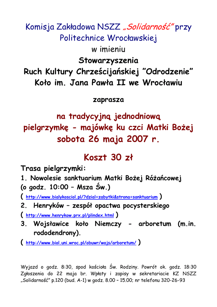 Komisja Zakładowa NSZZ „Solidarność” przy Politechnice Wrocławskiej w imieniu Stowarzyszenia Ruch Kultury Chrześcijańskiej ”Odrodzenie” Koło im. Jana Pawła II we Wrocławiu zaprasza na tradycyjną jednodniową pielgrzymkę - majówkę ku czci Matki Bożej sobota 26 maja 2007 r. Koszt 30 zł Trasa pielgrzymki: 1. Nowolesie sanktuarium Matki Bożej Różańcowej (o godz. 10:00 – Msza Św.) ( http://www.bialykosciol.pl/?dzial=zabytki&strona=sanktuarium ) 2. Henryków – zespół opactwa pocysterskiego ( http://www.henrykow.prx.pl/plindex.html ) 3. Wojsławice koło Niemczy - arboretum (m.in. rododendrony). ( http://www.biol.uni.wroc.pl/obuwr/wojs/arboretum/ ) Wyjazd o godz. 8:30, spod kościoła Św. Rodziny. Powrót ok. godz. 18:30 Zgłoszenia do 22 maja br. Wpłaty i zapisy w sekretariacie KZ NSZZ „Solidarność” p.120 (bud. A-1) w godz. 8.00 – 15.00; nr telefonu 320-26-93 Wiceprzewodnicząca KZ NSZZ „Solidarność” przy Politechnice Wrocławskiej Jadwiga Szymonik