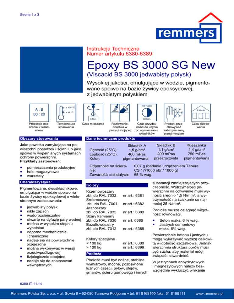 Strona 1 z 3 Instrukcja Techniczna Numer artykułu 6380-6389 Epoxy BS 3000 SG New (Viscacid BS 3000 jedwabisty połysk) Wysokiej jakości, emulgujące w wodzie, pigmentowane spoiwo na bazie żywicy epoksydowej, z jedwabistym połyskiem Proporcja mieszania 2 składników Temperatura stosowania Obszary stosowania Jako powłoka zamykająca na powierzchni posadzek i ścian lub jako spoiwo w wypełnianych systemach ochrony powierzchni. Przykłady zastosowań: pomieszczenia produkcyjne hale magazynowe warsztaty Charakterystyka: Pigmentowane, dwuskładnikowe, emulgujące w wodzie spoiwo na bazie żywicy epoksydowej o wielostronnym zastosowaniu: jedwabisty połysk nikły zapach wodorozcieńczalne otwarte na dyfuzję pary wodnej można w wysokim stopniu wypełniać odporne mechanicznie i chemicznie nadaje się na powierzchnie przejezdne można wykonywać w wersji przeciwpoślizgowej fizjologicznie obojętne nadaje się do zastosowań wewnętrznych Czas mieszania Rozlewanie, obróbka w pozycji stojącej Czas przydatności do użycia po wymieszaniu składników Produkt przechowywać zabezpieczony przed mrozem Czas składowania Dane techniczne produktu Gęstość (25°C): Lepkość (25°C): Kolor: Składnik A 1,5 g/cm³ 400 mPas pigmentowana Odporność na ścieranie: Zawartość ciał stałych: Kolory specjalne < 100 kg > 100 kg Mieszanka 1,4 g/cm³ 750 mPas pigmentowana 0,07 g (badanie urządzeniem Tabera CS 17/1000 obr./ 1000 g) 65 % wag. Kolory Krzemowoszary zbl. do RAL 7032, Srebrnoszary zbl. do RAL 7001, Jasnoszary zbl. do RAL 7035 Szary kamienny zbl. do RAL 7030 Bazaltowoszary zbl. do RAL 7012 Składnik B 1,1 g/cm³ 200 mPas przezroczysta nr art.: 6381 nr art.: 6382 nr art.: 6383 nr art. 6386 nr art.: 6389 nr art.: 6380 nr art.: 6399 Podłoża Podłoże musi być nośne, stabilne wymiarowo, mocne, pozbawione luźnych części, pyłów, olejów, smarów, ścieru gumowego i innych substancji zmniejszających przyczepność. Wytrzymałość powierzchni na odrywanie musi wynosić średnio 1,5 N/mm², a wytrzymałość na ściskanie co najmniej 25 N/mm². Podłoża muszą osiągnąć wilgotność równowagi. Beton maks. 6 % wag. Jastrych cementowy maks. 6% wag. Powierzchnie betonu i jastrychu mogą wykazywać wyższą całkowitą wilgotność szczątkową. Jednak wierzchnia struktura porów musi być sucha, aby materiał mógł związać i stwardnieć. W jastrychach anhydrytowych i magnezytowych należy bezwzględnie wykluczyć wnikanie 6380 IT 11.14 Remmers Polska Sp. z o.o. • ul. Sowia 8 • 62-080 Tarnowo Podgórne • tel. 61 8168100 faks: 61 8168111 www.remmers.pl Strona 2 z 3 wilgoci z elementów budowlanych lub z gruntu. Okładziny ceramiczne, stare powłoki, masy wyrównujące i asfalt lany wewnątrz budynków (AS IC 10) należy sprawdzić pod kątem przydatności do pokrycia, ewentualnie należy wykonać powierzchnię próbną. Przygotowanie podłoża Podłoże należy przygotować odpowiednią metodą, np. śrutowania lub szlifowania tarczą diamentową w taki sposób, aby spełniało przedstawione wymagania. Wyłomy i ubytki w podłożu należy wypełnić używając systemu zapraw Remmers PCC lub zapraw epoksydowych firmy Remmers a następnie zagruntować. Warstwa wyrównująca: Jako opcjonalną warstwę wyrównującą lub zasypywaną należy zastosować Epoxy BS 4000. Zamknięcie powierzchni: Epoxy BS 3000 SG rozprowadza się z reguły na przygotowanej powierzchni za pomocą rakli gumowej i wałkuje wałkiem do epoksydów. Zużycie jest uzależnione od stanu podłoża i wynosi ok. 0,20 0,25 kg/m² na każdą warstwę. Czasy przerw technologicznych Proporcje mieszania Przerwy pomiędzy poszczególnymi etapami prac powinny w temp. 20°C wynosić co najmniej 16 godzin, a maksymalnie 48 godzin. Podany czas w przypadku wyższych temperatur ulega skróceniu, a w niższych temperaturach i przy większych grubościach warstw wydłuża się. Podczas schnięcia należy zadbać o dobrą wentylację, aby odparowująca woda była odprowadzana na zewnątrz. Nakładanie warstw o niejednolitej grubości oraz zbyt słaba wentylacja mogą prowadzić do różnic w połysku powłoki. Ewentualnie posadzkę należy podzielić na wiele małych pól. 80 : 20 części wagowych. Temperatura stosowania Przygotowanie preparatu Do żywicy (składnik A) dodać całą ilość utwardzacza (składnik B). Następnie masę wymieszać za pomocą wolnoobrotowego mieszadła (OK. 300 - 400 obr./min.), przelać do innego pojemnika i jeszcze raz dobrze wymieszać. W temperaturze 20°C i przy wilgotności względnej powietrza 60% ok. 30 minut Wyższe temperatury skracają, niższe wydłużają dopuszczalny czas przetrzymywania zmieszanej masy w pojemniku. Temperatura materiału, otaczającego powietrza i podłoża powinna wynosić co najmniej 8 °C, a maksymalnie 30 °C. Wilgotność względna powietrza nie może przekraczać 80%. Temperatura podłoża musi być o co najmniej 3°C wyższa od temperatury punktu rosy. Wskazówki wykonawcze Czas schnięcia Czas przydatności do stosowania po wymieszaniu Podczas pracy należy nosić odpowiednie środki ochrony indywidualnej (patrz niżej). Gruntowanie: W przypadku niewielkich obciążeń mechanicznych jako warstwę gruntującą lub sczepną należy zastosować Remmers Epoxy BS 2000 New. Zużycie jest uzależnione od właściwości podłoża i wynosi ok. 0,15 - 0,20 kg/m² na jedną warstwę. W temperaturze 20°C i przy wilgotności względnej powietrza 60%: można chodzić po 1 dniu, obciążać mechanicznie po 3 dniach. Powłoka jest całkowicie stwardniała po 7 dniach. W niskich temperaturach czasy te są odpowiednio dłuższe. Wskazówki szczególne Wszystkie wyżej wymienione badania wykonano w warunkach laboratoryjnych (20 °C), na kolorach standardowych. Przy stosowaniu na placu budowy można uzyskać wartości nieznacznie różniące się od podanych w instrukcji technicznej. Typową cechą systemu jest lekka struktura powierzchni powłoki. Z doświadczenia wiadomo, że 