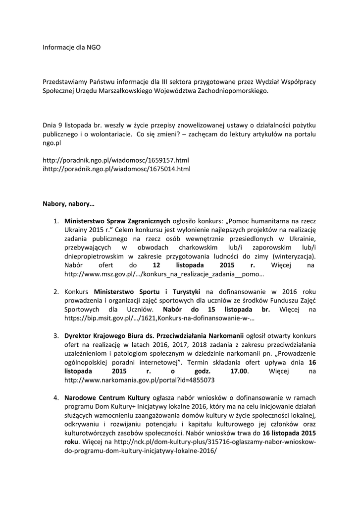 Informacje dla NGO Przedstawiamy Państwu informacje dla III sektora przygotowane przez Wydział Współpracy Społecznej Urzędu Marszałkowskiego Województwa Zachodniopomorskiego. Dnia 9 listopada br. weszły w życie przepisy znowelizowanej ustawy o działalności pożytku publicznego i o wolontariacie. Co się zmieni? – zachęcam do lektury artykułów na portalu ngo.pl http://poradnik.ngo.pl/wiadomosc/1659157.html ihttp://poradnik.ngo.pl/wiadomosc/1675014.html Nabory, nabory… 1. Ministerstwo Spraw Zagranicznych ogłosiło konkurs: „Pomoc humanitarna na rzecz Ukrainy 2015 r.” Celem konkursu jest wyłonienie najlepszych projektów na realizację zadania publicznego na rzecz osób wewnętrznie przesiedlonych w Ukrainie, przebywających w obwodach charkowskim lub/i zaporowskim lub/i dniepropietrowskim w zakresie przygotowania ludności do zimy (winteryzacja). Nabór ofert do 12 listopada 2015 r. Więcej na http://www.msz.gov.pl/…/konkurs_na_realizacje_zadania__pomo… 2. Konkurs Ministerstwo Sportu i Turystyki na dofinansowanie w 2016 roku prowadzenia i organizacji zajęć sportowych dla uczniów ze środków Funduszu Zajęć Sportowych dla Uczniów. Nabór do 15 listopada br. Więcej na https://bip.msit.gov.pl/…/1621,Konkurs-na-dofinansowanie-w-… 3. Dyrektor Krajowego Biura ds. Przeciwdziałania Narkomanii ogłosił otwarty konkurs ofert na realizację w latach 2016, 2017, 2018 zadania z zakresu przeciwdziałania uzależnieniom i patologiom społecznym w dziedzinie narkomanii pn. „Prowadzenie ogólnopolskiej poradni internetowej”. Termin składania ofert upływa dnia 16 listopada 2015 r. o godz. 17.00. Więcej na http://www.narkomania.gov.pl/portal?id=4855073 4. Narodowe Centrum Kultury ogłasza nabór wniosków o dofinansowanie w ramach programu Dom Kultury+ Inicjatywy lokalne 2016, który ma na celu inicjowanie działań służących wzmocnieniu zaangażowania domów kultury w życie społeczności lokalnej, odkrywaniu i rozwijaniu potencjału i kapitału kulturowego jej członków oraz kulturotwórczych zasobów społeczności. Nabór wniosków trwa do 16 listopada 2015 roku. Więcej na http://nck.pl/dom-kultury-plus/315716-oglaszamy-nabor-wnioskowdo-programu-dom-kultury-inicjatywy-lokalne-2016/ 5. Narodowe Centrum Kultury ogłosiło nabór wniosków do programu dotacyjnego "Ojczysty – dodaj do ulubionych". Program realizowany jest wraz z kampanią społeczno-edukacyjną o tej samej nazwie. Celem strategicznym programu jest kształtowanie twórczych, odpowiedzialnych i świadomych postaw wobec języka polskiego, budowanie kompetencji językowych oraz doskonalenie umiejętności posługiwania się językiem ojczystym poprzez realizację projektów popularyzujących wiedzę o języku. Nabór wniosków trwa do 16 listopada 2015 roku. http://nck.pl/ojczysty/315717nabor-do-programu-ojczysty-dodaj-do-ulubionych-9/ 6. Ministerstwo Sportu i Turystyki ogłosiło Program "Upowszechniania Sportu Osób Niepełnosprawnych". Nabór ofert potrwa do 17 listopada 2015 r. https://bip.msit.gov.pl/bip/finansowanie-zadan/sport-osob-niepelnospr/2015rok/1628,Ogloszenie-Programu-Upowszechniania-Sportu-OsobNiepelnosprawnych.html 7. Ministerstwo Sportu i Turystyki Departament Turystyki ogłosiło otwarty konkurs ofert na realizację zadań publicznych z zakresu turystyki w 2016 roku. Nabór do 20 listopada br. Szczegóły na: http://www.msport.gov.pl/turystyka/otwarty-konkursofert-na-realizacje-zadan-publicznych-z-zakresu-turystyki-w-2016-roku 8. Minister Sprawiedliwości ogłosiło otwarty konkurs na realizację w roku 2016 zadania publicznego: „Pomoc postpenitencjarna osobom pozbawionym wolności, zwalnianym z zakładów karnych i aresztów śledczych oraz członkom ich rodzin” w ramach dotacji celowej z Funduszu Pomocy Pokrzywdzonym oraz Pomocy Postpenitencjarnej. Nabór ofert trwa do 20 listopada br. Więcej na http://ms.gov.pl/pl/ogloszenia/news,7676,ogloszenie-w-sprawie-przeprowadzeniaotwartego.html 9. Fundusz IKEA – na rodzinę można liczyć. Dodatkowy nabór na projekty aktywności podejmowanych na rzecz społeczności lokalnych. Termin zgłaszania pomysłów do 20 listopada br. Więcej na http://www.eurodesk.pl/nasza-baza/grant/PL0010000572 10. W dniach od 2 do 24 listopada br. trwa nabór uzupełniający ofert na realizację zadań w Komponencie Działań Systemowych w FIO. Zgodnie z zapisami Regulaminu Konkursu FIO w 2016 r. część B rozdział II – Komponent działań systemowych w Priorytecie 4, nabór uzupełniający. Więcej na http://pozytek.gov.pl/Nabor,uzupelniajacy,ofert,na,realizacje,zadan,w,KDS,3872.htm l 11. Narodowe Centrum Kultury ogłosiło nabór wniosków o dofinansowanie w ramach programu Bardzo Młoda Kultura, który ma przyczynić się do wzmacniania roli edukacji kulturowej w Polsce poprzez pobudzenie i wykorzystanie edukacyjnego potencjału kultury. Realizacja zadania odbywa się na terenie Rzeczypospolitej Polskiej w latach 2016-2018. Nabór wniosków trwa do 30 listopada 2015 r. http://www.nck.pl/bardzo-mloda-kultura/315633-oglaszamy-nabor-wnioskow-doprogramu-bardzo-mloda-kultura/ 12. Ministerstwo Spraw Zagranicznych ogłosiło konkurs na realizację zadania publicznego: „Współpraca z Polonią i Polakami za granicą w 2016 r.”. Nabór potrwa do 3 grudnia 2015 r. Więcej na http://www.msz.gov.pl/pl/ministerstwo/konkursyministra/msz_oglasza_konkurs_na _realizacja_zadania__wspolpraca_z_polonia_i_polakami_za_granica__ 13. Zapraszamy do zapoznania się z warunkami naboru wniosków dla programu „Inicjatywy obywatelskie” organizowanego przez NFOŚiGW. Celem programu jest poprawa stanu środowiska naturalnego przy zaangażowaniu społeczności lokalnych. Termin naboru: od 19 października 2015 r. do 1 lutego 2016 r. Więcej informacji na: https://www.nfosigw.gov.pl/oferta-finansowania/srodki-krajowe/programypriorytetowe/inicjatywy-obywatelskie/ 14. Ruszył nabór wniosków w ramach Polsko Litewskiego Funduszu Wymiany Młodzieży. W ramach Fun