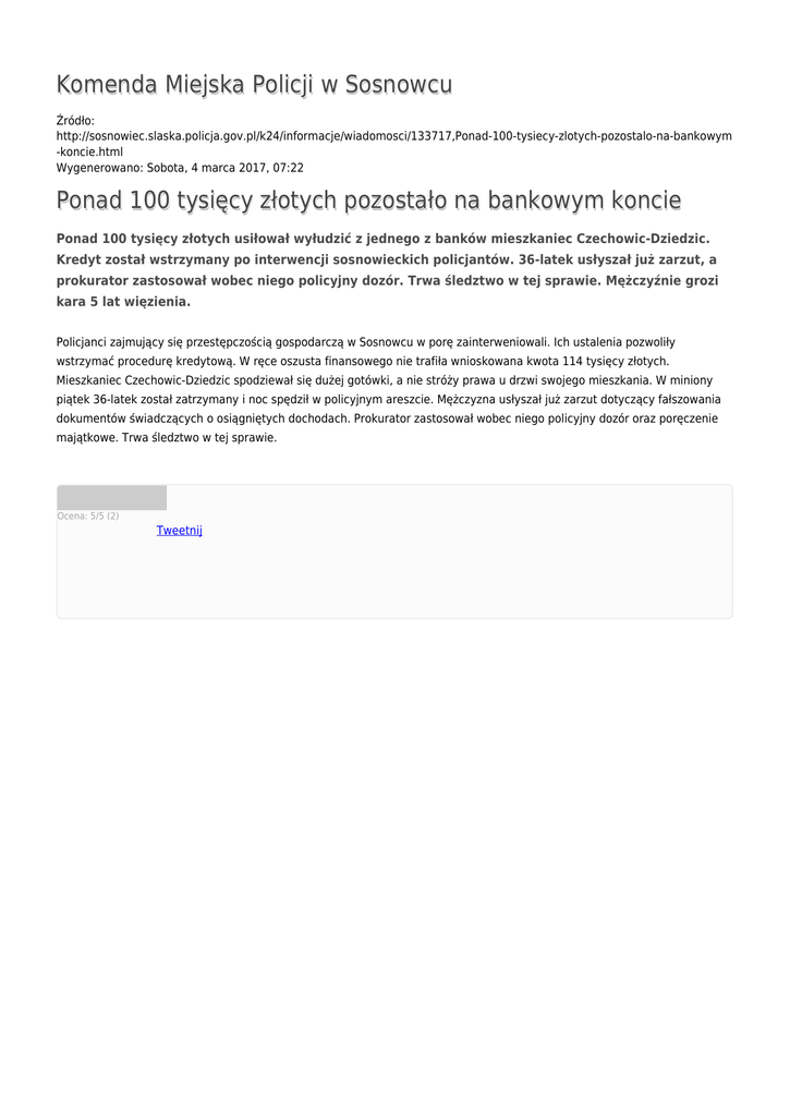 Komenda Miejska Policji w Sosnowcu Źródło: http://sosnowiec.slaska.policja.gov.pl/k24/informacje/wiadomosci/133717,Ponad-100-tysiecy-zlotych-pozostalo-na-bankowym -koncie.html Wygenerowano: Sobota, 4 marca 2017, 07:22 Ponad 100 tysięcy złotych pozostało na bankowym koncie Ponad 100 tysięcy złotych usiłował wyłudzić z jednego z banków mieszkaniec Czechowic-Dziedzic. Kredyt został wstrzymany po interwencji sosnowieckich policjantów. 36-latek usłyszał już zarzut, a prokurator zastosował wobec niego policyjny dozór. Trwa śledztwo w tej sprawie. Mężczyźnie grozi kara 5 lat więzienia. Policjanci zajmujący się przestępczością gospodarczą w Sosnowcu w porę zainterweniowali. Ich ustalenia pozwoliły wstrzymać procedurę kredytową. W ręce oszusta finansowego nie trafiła wnioskowana kwota 114 tysięcy złotych. Mieszkaniec Czechowic-Dziedzic spodziewał się dużej gotówki, a nie stróży prawa u drzwi swojego mieszkania. W miniony piątek 36-latek został zatrzymany i noc spędził w policyjnym areszcie. Mężczyzna usłyszał już zarzut dotyczący fałszowania dokumentów świadczących o osiągniętych dochodach. Prokurator zastosował wobec niego policyjny dozór oraz poręczenie majątkowe. Trwa śledztwo w tej sprawie. Ocena: 5/5 (2) Tweetnij