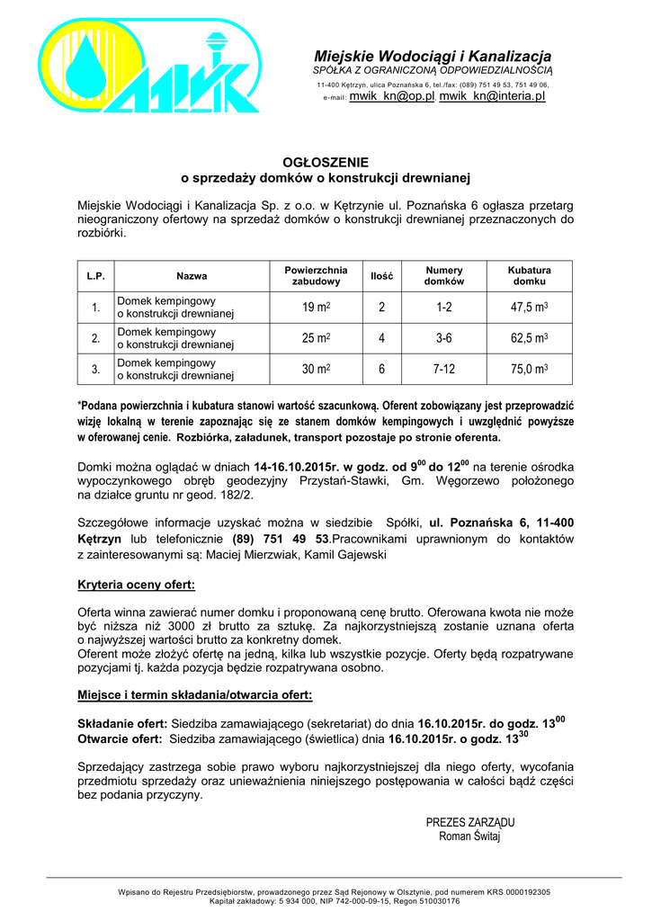 Miejskie Wodociągi i Kanalizacja SPÓŁKA Z OGRANICZONĄ ODPOWIEDZIALNOŚCIĄ 11-400 Kętrzyn, ulica Poznańska 6, tel./fax: (089) 751 49 53, 751 49 06, e- mail: [email protected], [email protected] OGŁOSZENIE o sprzedaży domków o konstrukcji drewnianej Miejskie Wodociągi i Kanalizacja Sp. z o.o. w Kętrzynie ul. Poznańska 6 ogłasza przetarg nieograniczony ofertowy na sprzedaż domków o konstrukcji drewnianej przeznaczonych do rozbiórki. L.P. Nazwa Powierzchnia zabudowy Ilość Numery domków Kubatura domku 1. Domek kempingowy o konstrukcji drewnianej 19 m2 2 1-2 47,5 m3 2. Domek kempingowy o konstrukcji drewnianej 25 m2 4 3-6 62,5 m3 3. Domek kempingowy o konstrukcji drewnianej 30 m2 6 7-12 75,0 m3 *Podana powierzchnia i kubatura stanowi wartość szacunkową. Oferent zobowiązany jest przeprowadzić wizję lokalną w terenie zapoznając się ze stanem domków kempingowych i uwzględnić powyższe w oferowanej cenie. Rozbiórka, załadunek, transport pozostaje po stronie oferenta. Domki można oglądać w dniach 14-16.10.2015r. w godz. od 900 do 1200 na terenie ośrodka wypoczynkowego obręb geodezyjny Przystań-Stawki, Gm. Węgorzewo położonego na działce gruntu nr geod. 182/2. Szczegółowe informacje uzyskać można w siedzibie Spółki, ul. Poznańska 6, 11-400 Kętrzyn lub telefonicznie (89) 751 49 53.Pracownikami uprawnionym do kontaktów z zainteresowanymi są: Maciej Mierzwiak, Kamil Gajewski Kryteria oceny ofert: Oferta winna zawierać numer domku i proponowaną cenę brutto. Oferowana kwota nie może być niższa niż 3000 zł brutto za sztukę. Za najkorzystniejszą zostanie uznana oferta o najwyższej wartości brutto za konkretny domek. Oferent może złożyć ofertę na jedną, kilka lub wszystkie pozycje. Oferty będą rozpatrywane pozycjami tj. każda pozycja będzie rozpatrywana osobno. Miejsce i termin składania/otwarcia ofert: Składanie ofert: Siedziba zamawiającego (sekretariat) do dnia 16.10.2015r. do godz. 13 Otwarcie ofert: Siedziba zamawiającego (świetlica) dnia 16.10.2015r. o godz. 1330 00 Sprzedający zastrzega sobie prawo wyboru najkorzystniejszej dla niego oferty, wycofania przedmiotu sprzedaży oraz unieważnienia niniejszego postępowania w całości bądź części bez podania przyczyny. PREZES ZARZĄDU Roman Świtaj Wpisano do Rejestru Przedsiębiorstw, prowadzonego przez Sąd Rejonowy w Olsztynie, pod numerem KRS 0000192305 Kapitał zakładowy: 5 934 000, NIP 742-000-09-15, Regon 510030176