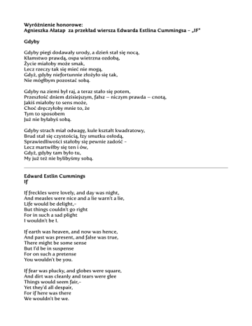 Wyróżnienie honorowe: Agnieszka Ałatap za przekład wiersza Edwarda Estlina Cummingsa - „IF” Gdyby Gdyby piegi dodawały urody, a dzień stał się nocą, Kłamstwo prawdą, ospa wietrzna ozdobą, Życie miałoby może smak, Lecz rzeczy tak się mieć nie mogą, Gdyż, gdyby niefortunnie złożyło się tak, Nie mógłbym pozostać sobą. Gdyby na ziemi był raj, a teraz stało się potem, Przeszłość dniem dzisiejszym, fałsz – niczym prawda – cnotą, Jakiś miałoby to sens może, Choć dręczyłoby mnie to, że Tym to sposobem Już nie byłabyś sobą. Gdyby strach miał odwagę, kule kształt kwadratowy, Brud stał się czystością, łzy smutku osłodą, Sprawiedliwości stałoby się pewnie zadość Lecz martwiłby się ten i ów, Gdyż, gdyby tam było tu, My już też nie bylibyśmy sobą. Edward Estlin Cummings If If freckles were lovely, and day was night, And measles were nice and a lie warn't a lie, Life would be delight,But things couldn't go right For in such a sad plight I wouldn't be I. If earth was heaven, and now was hence, And past was present, and false was true, There might be some sense But I'd be in suspense For on such a pretense You wouldn't be you. If fear was plucky, and globes were square, And dirt was cleanly and tears were glee Things would seem fair,Yet they'd all despair, For if here was there We wouldn't be we.