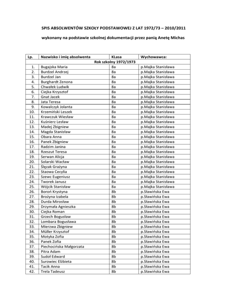 SPIS ABSOLWENTÓW SZKOŁY PODSTAWOWEJ Z LAT 1972/73 – 2010/2011 wykonany na podstawie szkolnej dokumentacji przez panią Anetę Michas Lp. 1. 2. 3. 4. 5. 6. 7. 8. 9. 10. 11. 12. 13. 14. 15. 16. 17. 18. 19. 20. 21. 22. 23. 24. 25. 26. 27. 28. 29. 30. 31. 32. 33. 34. 35. 36. 37. 38. 39. 40. 41. 42. Nazwisko i imię absolwenta Bugajska Maria Burdzel Andrzej Burdzel Jan Burghardt Zenona Chwałek Ludwik Ciejka Krzysztof Gnat Jacek Jata Teresa Kowalczyk Jolanta Krzemiński Leszek Krawczuk Wiesław Kuśnierz Lesław Madej Zbigniew Magda Stanisław Obara Anna Panek Zbigniew Radzim Janina Rzeszut Teresa Serwan Alicja Solarski Wacław Ślęzak Grażyna Staowa Cecylia Szewc Eugeniusz Tworek Janusz Wójcik Stanisław Boroń Krystyna Brożyna Izabela Durda Mirosław Drzymała Agnieszka Ciejka Roman Grzech Bogusław Lombara Bogusława Mierzwa Zbigniew Müller Krzysztof Motyka Zofia Panek Zofia Piechocińska Małgorzata Pitra Adam Sudoł Edward Surowiec Elżbieta Tacik Anna Trela Tadeusz KLasa Rok szkolny 1972/1973 8a 8a 8a 8a 8a 8a 8a 8a 8a 8a 8a 8a 8a 8a 8a 8a 8a 8a 8a 8a 8a 8a 8a 8a 8a 8b 8b 8b 8b 8b 8b 8b 8b 8b 8b 8b 8b 8b 8b 8b 8b 8b Wychowawca: p.Majka Stanisława p.Majka Stanisława p.Majka Stanisława p.Majka Stanisława p.Majka Stanisława p.Majka Stanisława p.Majka Stanisława p.Majka Stanisława p.Majka Stanisława p.Majka Stanisława p.Majka Stanisława p.Majka Stanisława p.Majka Stanisława p.Majka Stanisława p.Majka Stanisława p.Majka Stanisława p.Majka Stanisława p.Majka Stanisława p.Majka Stanisława p.Majka Stanisława p.Majka Stanisława p.Majka Stanisława p.Majka Stanisława p.Majka Stanisława p.Majka Stanisława p.Sławińska Ewa p.Sławińska Ewa p.Sławińska Ewa p.Sławińska Ewa p.Sławińska Ewa p.Sławińska Ewa p.Sławińska Ewa p.Sławińska Ewa p.Sławińska Ewa p.Sławińska Ewa p.Sławińska Ewa p.Sławińska Ewa p.Sławińska Ewa p.Sławińska Ewa p.Sławińska Ewa p.Sławińska Ewa p.Sławińska Ewa 43. 44. 45. 46. 47. 48. 49. Twórz Grażyna Twórz Lidia Warchoł Jan Wojtaszek Andrzej Wiącek Małgorzata Zarzycka Halina Ząbek Zbigniew 8b 8b 8b 8b 8b 8b 8b p.Sławińska Ewa p.Sławińska Ewa p.Sławińska Ewa p.Sławińska Ewa p.Sławińska Ewa p.Sławińska Ewa p.Sławińska Ewa Lp. 1. 2. 3. 4. 5. 6. 7. 8. 9. 10. 11. 12. 13. 14. 15. 16. 17. 18. 19. 20. 21. 22. 23. 24. 25. 26. 27. 28. 29. 30. 31. 32. 33. 34. 35. 36. 37. 38. 39. Nazwisko i imię absolwenta Babiński Andrzej Badawika Alina Brożyna Marek Ciejka Małgorzata Dziedzic Urszula Galacki Wiesław Gorazd Bogusława Gorazd Elżbieta Gzella Genowefa Kuśnierz Zbigniew Midura Grażyna Mierzwowicz Anna Müller Beata Mścirz Jerzy Obara Józefa Panek Krystyna Przybyłek Regina Spyra Wiesław Stasiow Andrzej Suropek Ewa Ślęzak Ryszard Szarama Anna Sudoł Andrzej Trela Dorota Trela Jan Trela Dorota Wieczerzak Zbigniew Wojtaszek Danuta Zięba Teresa Bajkos Bogusława Barszcz Jan Biesiadecki Bogusław Błach Henryk Brożyna Stanisłąw Brożyna Zofia Ciejka Henryk Czekaj Zofia Dziadzio Stanisław Gil Krystyna KLasa Rok szkolny 1973/1974 8a 8a 8a 8a 8a 8a 8a 8a 8a 8a 8a 8a 8a 8a 8a 8a 8a 8a 8a 8a 8a 8a 8a 8a 8a 8a 8a 8a 8a 8b 8b 8b 8b 8b 8b 8b 8b 8b 8b Wychowawca: p.Drzewińska Stefania p.Drzewińska Stefania p.Drzewińska Stefania p.Drzewińska Stefania p.Drzewińska Stefania p.Drzewińska Stefania p.Drzewińska Stefania p.Drzewińska Stefania p.Drzewińska Stefania p.Drzewińska Stefania p.Drzewińska Stefania p.Drzewińska Stefania p.Drzewińska Stefania p.Drzewińska Stefania p.Drzewińska Stefania p.Drzewińska Stefania p.Drzewińska Stefania p.Drzewińska Stefania p.Drzewińska Stefania p.Drzewińska Stefania p.Drzewińska Stefania p.Drzewińska Stefania p.Drzewińska Stefania p.Drzewińska Stefania p.Drzewińska Stefania p.Drzewińska Stefania p.Drzewińska Stefania p.Drzewińska Stefania p.Drzewińska Stefania p.Sławińska Ewa p.Sławińska Ewa p.Sławińska Ewa p.Sławińska Ewa p.Sławińska Ewa p.Sławińska Ewa p.Sławińska Ewa p.Sławińska Ewa p.Sławińska Ewa p.Sławińska Ewa 40. 41. 42. 43. 44. 45. 46. 47. 48. 49. 50. 51. 52. 53. 54. 55. 56. 57. 58. 59. 60. 61. 62. 63. 64. 65. 66. 67. 68. 69. 70. 71. 72. 73. 74. 75. 76. 77. 78. 79. 80. 81. 82. 83. 84. Gorazd Czesław Guła Renata Gwoździowski Zdzisław Kielawa Elżbieta Kłosowski Witold Kubik Mariusz Kubik Władysław Leżański Jacek Nowak Ryszard Mierzwa Elżbieta Pnek Andrzej Panek Halina Pawlik Zbigniew Sadecka Anna Solarska Jadwiga Sołczyk Janina Stawowy Mieczysława Stępień Mieczysław Wójcik Mieczysław Zarzycki Bogdan Babiński Janusz Baran Jan Barszczewska Janina Bożek Roman Gil Janusz Janik Mieczysław Jarosz Irena Kaczor Bożena Leszkowicz Zofia Lis Jerzy Lis Kazimierz Madej Andrzej Mazur Bożena Panek Andrzej Panek Bożena Panek Urszula Piątek Jadwiga Rolek Wanda Ślęzak Eugenia Stawowa Ewa Serwon Waldemar Tyniec Zofia Twórz Zofia Zarzycka Barbara Zięba Marek 8b 8b 8b 8b 8b 8b 8b 8b 8b 8b 8b 8b 8b 8b 8b 8b 8b 8b 8b 8b 8c 8c 8c 8c 8c 8c 8c 8c 8c 8c 8c 8c 8c 8c 8c 8c 8c 8c 8c 8c 8c 8c 8c 8c 8c p.Sławińska Ewa p.Sławińska Ewa p.Sławińska Ewa p.Sławińska Ewa p.Sławińska Ewa p.Sławińska Ewa p.Sławińska Ewa p.Sławińska Ewa p.Sławińska Ewa p.Sławińska Ewa p.Sławińska Ewa p.Sławińska Ewa p.Sławińska Ewa p.Sławińska Ewa p.Sławińska Ewa p.Sławińska Ewa p.Sławińska Ewa p.Sławińska Ewa p.Sławińska Ewa p.Sławińska Ewa p.Nowak Stanisław p.Nowak Stanisław p.Nowak Stanisław p.Nowak Stanisław p.Nowak Stanisław p.Nowak Stanisław p.Nowak Stanisław p.Nowak Stanisław p.Nowak Stanisław p.Nowak Stanisław p.Nowak Stanisław p.Nowak Stanisław p.Nowak Stanisław p.Nowak Stanisław p.Nowak Stanisław p.Nowak Stanisław p.Nowak Stanisław p.Nowak Stanisław p.Nowak Stanisław p.Nowak Stanisław p.Nowak Stanisław p.Nowak Stanisław p.Nowak Stanisław p.Nowak Stanisław p.Nowak Stanisław Lp. 1. Nazwisko i imię absolwenta Baran Józef KLasa Wychowawca: Rok szkolny 1974/1975 8a p.Ramocki Józef 