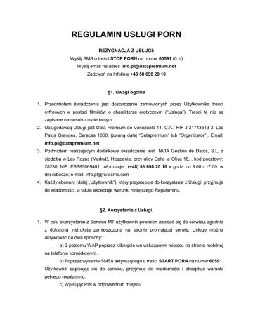 REGULAMIN USŁUGI PORN REZYGNACJA Z USŁUGI: Wyślij SMS o treści STOP PORN na numer 60591 (0 zł) Wyślij email na adres [email protected] Zadzwoń na Infolinię +48 58 698 20 10 §1. Uwagi ogólne 1. Przedmiotem świadczenia jest dostarczenie zamówionych przez Użytkownika treści cyfrowych w postaci filmików o charakterze erotycznym (“Usługa”). Treści te nie są zapisane na nośniku materialnym. 2. Usługodawcą Usługi jest Data Premium de Venezuela 11, C.A.; RIF J-31743513-3. Los Palos Grandes, Caracas 1060, (zwaną dalej “Datapremium” lub “Organizator”). Email: [email protected]. 3. Podmiotem realizującym dodatkowe świadczenie jest NVIA Gestión de Datos, S.L, z siedzibą w Las Rozas (Madryt), Hiszpania, przy ulicy Calle la Oliva 18, , kod pocztowy: 28230, NIP: ESB83069401. Informacje : (+48) 58 698 20 10 w godz. od 9:00 - 17:00 w dni robocze; e-mail: [email protected] 4. Każdy abonent (dalej „Użytkownik”), który przystępuje do korzystania z Usługi, przyjmuje do wiadomości, a także akceptuje warunki niniejszego Regulaminu. §2. Korzystanie z Usługi. 1. W celu skorzystania z Serwisu MT użytkownik powinien zapisać się do serwisu, zgodnie z dokładną instrukcją zamieszczoną na stronie promującej serwis. Usługę można aktywować na dwa sposoby: a) Z poziomu WAP poprzez kliknięcie we wskazanym miejscu na stronie mobilnej na telefonie komórkowym. b) Poprzez wysłanie SMSa aktywującego o treści START PORN na numer 60591. Użytkownik zapisując się do serwisu, przyjmuje do wiadomości i akceptuje warunki pełnego regulaminu. c) Wpisując PIN w odpowiednim miejscu. 2. Po aktywacji usługi, Użytkownik będzie otrzymywał cykliczne SMS po 6,15 PLN z VAT. W ten sposób będzie pobierana opłata za usługę. Użytkownik otrzyma max. 4 SMS MT tygodniowo. Abonenci Tmobile, dodatkowo po rejestracji w usłudze, otrzymają jedną płatną wiadomość w cenie 6,15 PLN z VAT. 3. Użytkownik w ramach Usługi otrzyma nieograniczony dostęp do oglądania filmików dla dorosłych aż do momentu dezaktywacji usługi. 4. Użytkownik w każdej chwili może zrezygnować z usługi, poprzez wysłanie wiadomości SMS o treści STOP PORN na numer 60591 za 0 PLN (w sieci ORANGE, TMOBILE, PLUS i PLAY) 5. Użytkownik płaci za korzystanie z Usługi bezgotówkowo, poprzez doliczenie kosztu usługi do rachunku telefonicznego u swojego operatora komunikacyjnego. W przypadku Usług świadczonych dla Użytkowników korzystających z usług przedpłaconych (tzw. „prepaid”), opłata jest uiszczana wraz z otrzymaniem zamówionej Usługi poprzez odliczenie jej wartości od salda konta prepaid posiadanego przez Użytkownika u operatora komunikacyjneo. Termin zapłaty rachunku telefonicznego, zasilenia konta prepaid jak również sposoby ich opłacenia, wynikają z umowy o usługi telekomunikacyjne zawieranej między Użytkownikiem a operatorem telekomunikacyjnym, z usług któregokorzysta w związku z Usługą. 6. Koszt otrzymywanych wiadomości nie obejmuje kosztów połączenia WAP, które jest naliczane zgodnie z taryfą danego operatora sieci komórkowej. Połączenie WAP jest konieczne dla pobrania otrzymanych w ramach subskrypcji elementów. §3. Użytkowanie Usługi 1. Zamawiane przez Użytkownika treści cyfrowe są przeznaczone do użytku własnego i są chronione przepisami prawa autorskiego. 2. Korzystanie z Usługi jest zabronione osobom poniżej 18 roku życia. Usługa umożliwia dostęp do treści rozrywkowych i erotycznych, które mogą urazić niektórych Użytkowników. Dlatego też, jeśli jesteś niepełnoletni, powinieneś natychmiast opuścić stronę. Aby korzystać z Usługi i przeglądać jej zawartość, musisz potwierdzić swoją pełnoletniość. 3. Korzystanie z Usługi nie wymaga podania żadnych danych osobowych; identyfikacja Użytkownika następuje w oparciu o numer telefonu, z którego dokonano zamówienia na obejrzenie kontentu. 4. Użytkownik nie powinien: a) Korzystać z Usługi bez braku autoryzacji i wykorzystywać stronę do jakichkolwiek celów określonych przez niniejsze warunki i uwagi jako nielegalne i niedozwolone. b) Rozprzestrzeniać wirusy komputerowe w Usłudze lub inne oprogramowania, które mogą spowodować jakiekolwiek uszkodzenie systemu właściciela domeny, dostawców lub osób trzecich. c) Próbować uzyskać dostęp, korzystać i/lub manipulować danymi właściciela domeny, dostawców i innych użytkowników. §4. Odpowiedzialność 1. Data Premium oświadcza, że dołoży należytej staranności, aby Usługa świadczona była na jak najwyższym poziomie. W razie jakichkolwiek problemów z dostępem do kontentu prosimy o kontakt mailowy [email protected] bądź telefoniczny z Infolinią: (+48) 586982010. 2. Data Premium nie ma możliwości weryfikacji wieku Użytkowników, nie ponosi odpowiedzialności za skutki korzystania z Usługi dedykowanej dla osób pełnoletnich przez Użytkowników do tego nieuprawnionych. 3. Data Premium nie ponosi odpowiedzialności za niedziałanie lub nienależyte działanie Usługi, związane z niedziałaniem lub nienależytym działaniem sieci Internet oraz za opóźnienia w świadczeniu usług spowodowane siłą wyższą. W rozumieniu niniejszego Regulaminu za siłę wyższą należy rozumieć w szczególności: strajk, decyzje administracyjne, orzeczenia sądowe, awarie sieci telekomunikacyjnych lub systemów gateway innych firm, nieprawidłowości w funkcjonowaniu operatorów sieci GSM i Internetu. W przypadku zaistnienia siły wyższej, Data Premium uprawniona będzie do przesunięcia terminu świadczenia usług do czasu usunięcia przeszkód i zrównoważenia systemu. 4. Niezależnie od powyższych ustaleń Data Premium ma prawo zaprzestać świadczenia Usługi w każdym czasie, jeżeli takie uzasadnione żądanie zostanie zgłoszone wobec niego przez Operatora. §5. Postanowienia końcowe 1. Prawo do składania reklamacji przysługuje każdemu Użytkownikowi. Reklamacje można skła