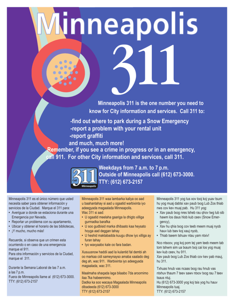 Minneapolis 311 is the one number you need to know for City information and services. Call 311 to: -find out where to park during a Snow Emergency -report a problem with your rental unit -report graffiti and much, much more! Remember, if you see a crime in progress or in an emergency, call 911. For other City information and services, call 311. Weekdays from 7 a.m. to 7 p.m. Outside of Minneapolis call (612) 673-3000. TTY: (612) 673-2157 Minneapolis 311 es el único número que usted necesita saber para obtener información y servicios de la Ciudad. Marque el 311 para: • Averiguar a donde se estaciona durante una Emergencia por Nevada, • Reportar un problema con su apartamento, • Ubicar y obtener el horario de las bibliotecas, • ¡Y mucho, mucho más! Recuerde, si observa que un crimen esta ocurriendo o en caso de una emergencia marque el 911. Para otra información y servicios de la Ciudad, marque el 311. Durante la Semana Laboral de las 7 a.m. a las 7 p.m. Fuera de Minneapolis llame al (612) 673-3000. TTY: (612) 673-2157 Minneapolis 311 waa lambarka kaliya oo aad u baahantahay si aad u ogaatid warbixinta iyo adeegyada magaalada Minneapolis. Wac 311 si aad: • U ogaatid meelaha gaariga la dhigto xilliga gurmadka barafka • U soo gudbisid marka dhibaato kaa heysato hoyga aad deggan tahay • U heshid maktabadda kuugu dhow iyo xilliga ay furan tahay • Iyo waxyaabo kale oo fara badan. Xusuusnow haddii aad la kulantid fal dembi ah oo markaa cidi sameynayso amaba xaalado deg deg ah, wac 911. Warbixinta iyo adeegyada magaalada, wac 311. Maalmaha shaqada laga bilaabo 7da aroornimo ilaa 7ka habeennimo. Dadka ka soo wacaya Magaalada Minneapolis dibadeeda (612) 673-3000 TTY (612) 673-2157 Minneapolis 311 yog tus xov tooj koj yuav tsum hu yog muaj dabtsi xav paub txog Lub Zos thiab nws cov kev muaj pab. Hu 311 yog: • Xav paub txog nres tsheb rau qhov twg lub sib hawm los daus hlob kub ceev (Snow Emergency), • Xav hu qhia txog cov teeb meem muaj nyob hauv lub tsev koj xauj nyob, • Thiab tseem tshuav ntau yam ntxiv! Nco ntsoov, yog koj pom tej yam teeb meem tab tom tshwm sim ua txaum txoj cai los yog muaj kev kub ceev, hu 911. Xav paub txog Lub Zos thiab cov kev pab mauj, hu 311. Txhuas hnub vas ncaas txog rau hnub vas ntxhuv thaum 7 teev sawv ntxov txog rau 7 teev tsaus ntuj. Hu (612) 673-3000 yog koj tsis yog hu hauv Minneapolis tuaj. TTY: (612) 673-2157