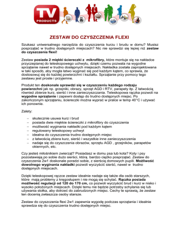 ZESTAW DO CZYSZCZENIA FLEXI Szukasz uniwersalnego narzędzia do czyszczenia kurzu i brudu w domu? Musisz posprzątać w trudno dostępnych miejscach? Nic nie sprawdzi się lepiej niż zestaw do czyszczenia flexi! Zestaw posiada 2 miękki ściereczki z mikrofibry, które montuje się na nakładce przyczepianej do teleskopowego uchwytu, dzięki czemu pozwala na wygodne sprzątanie nawet w trudno dostępnych miejscach. Nakładka została zaprojektowana w taki sposób, aby mogła łatwo wyginać się pod każdym kątem, co sprawia, że dostosowuj się do każdej powierzchni i kształtu. Sprzątanie przy pomocy tego zestawu jest proste i przyjemne. Produkt ten doskonale sprawdzi się w czyszczeniu każdego rodzaju powierzchni jak np. grzejniki, obrazy, sprzęt AGD i RTV, parapety itp. Z łatwością również zbierze kurz, sierść i inne zanieczyszczania. Teleskopowa rączka pozwoli na wygodne sprzątanie i zapewni dostęp do trudno dostępnych miejsc. Po zakończonym sprzątaniu, ściereczki można wyprać w pralce w temp 40°C i używać ich ponownie. Zalety: − − − − − − − skutecznie usuwa kurz i brud posiada dwie miękkie ściereczki z mikrofibry do czyszczenia możliwość wyginania nakładki pod każdym kątem regulowany teleskopowy uchwyt idealna do czyszczenia trudno dostępnych miejsc z łatwością zbiera kurz, sierść i wszystkie inne zanieczyszczenia nadaje się do czyszczenia obrazów, sprzętu AGD , grzejników, parapetów okiennych, etc. Czy jesteś miłośnikiem zwierząt? Posiadasz w domu psa lub kota? Koty i psy pozostawiają po sobie dużo sierści, którą bardzo ciężko posprzątać. Zestaw do czyszczenia 2w1 doskonale poradzi sobie, z sierścią domowych pupili. Możliwość dowolnego wyginania nakładki pozwoli wyczyścić sierść, nawet w trudno dostępnych miejscach. Dzięki teleskopowej rączce zestaw idealnie nadaje się także dla osób starszych, które mają problemy z kręgosłupem i nie mogą się schylać. Rączka posiada możliwość regulacji od 120 do 170 cm, co pozwoli wyczyścić brud i kurz w nisko i wysoko położonych miejscach. Dzięki temu nie będzie potrzeby schylania się lub używania stołka, aby dotrzeć do zabrudzonych miejsc. Cechy te sprawią, że zestaw ten docenią zwłaszcza osoby starsze. Zestaw do czyszczenia flexi 2w1 zapewnia wygodę podczas sprzątania i idealnie sprawdza się do czyszczenia trudno dostępnych miejsc. DANE TECHNICZNE: − uchwyt teleskopowy 120 -170 cm − materiał: 100% poliester − można prać w temp. 40°C W zestawie znajdują się − − − − teleskopowa rączka 2 wymienne ściereczki z mikrofibry nakładka na ściereczki instrukcja obsługi ODPOWIEDZI NA NAJCZĘŚCIEJ ZADAWANE PYTANIA Czy nakładki czyszczące są wytrzymałe? Nakładki zostały skonstruowane w taki sposób, aby były wytrzymałe i elastyczne. Jaki jest skład mikrowłókien? W 80 % jet to poliester a w 20 % poliamid. Czy ściereczki z mikrofibry można prać? Ściereczki mogą być prane w pralce w maks. temperaturze. 40°C.