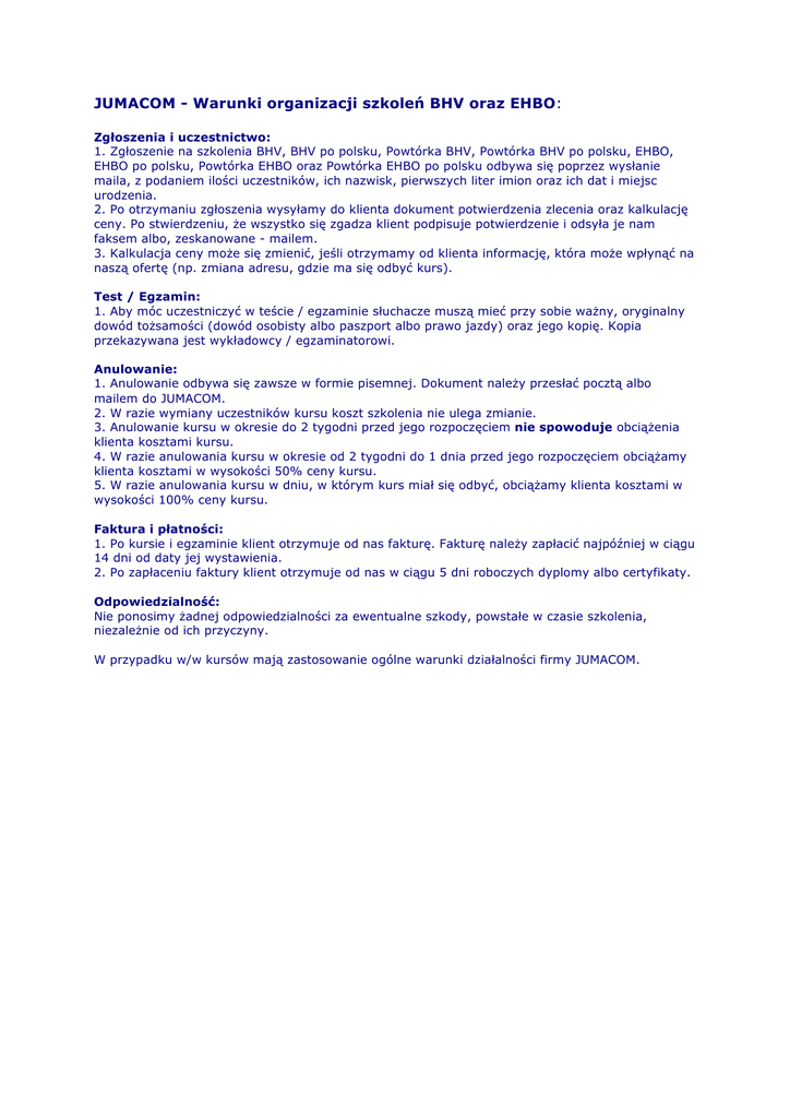 JUMACOM - Warunki organizacji szkoleń BHV oraz EHBO: Zgłoszenia i uczestnictwo: 1. Zgłoszenie na szkolenia BHV, BHV po polsku, Powtórka BHV, Powtórka BHV po polsku, EHBO, EHBO po polsku, Powtórka EHBO oraz Powtórka EHBO po polsku odbywa się poprzez wysłanie maila, z podaniem ilości uczestników, ich nazwisk, pierwszych liter imion oraz ich dat i miejsc urodzenia. 2. Po otrzymaniu zgłoszenia wysyłamy do klienta dokument potwierdzenia zlecenia oraz kalkulację ceny. Po stwierdzeniu, że wszystko się zgadza klient podpisuje potwierdzenie i odsyła je nam faksem albo, zeskanowane - mailem. 3. Kalkulacja ceny może się zmienić, jeśli otrzymamy od klienta informację, która może wpłynąć na naszą ofertę (np. zmiana adresu, gdzie ma się odbyć kurs). Test / Egzamin: 1. Aby móc uczestniczyć w teście / egzaminie słuchacze muszą mieć przy sobie ważny, oryginalny dowód tożsamości (dowód osobisty albo paszport albo prawo jazdy) oraz jego kopię. Kopia przekazywana jest wykładowcy / egzaminatorowi. Anulowanie: 1. Anulowanie odbywa się zawsze w formie pisemnej. Dokument należy przesłać pocztą albo mailem do JUMACOM. 2. W razie wymiany uczestników kursu koszt szkolenia nie ulega zmianie. 3. Anulowanie kursu w okresie do 2 tygodni przed jego rozpoczęciem nie spowoduje obciążenia klienta kosztami kursu. 4. W razie anulowania kursu w okresie od 2 tygodni do 1 dnia przed jego rozpoczęciem obciążamy klienta kosztami w wysokości 50% ceny kursu. 5. W razie anulowania kursu w dniu, w którym kurs miał się odbyć, obciążamy klienta kosztami w wysokości 100% ceny kursu. Faktura i płatności: 1. Po kursie i egzaminie klient otrzymuje od nas fakturę. Fakturę należy zapłacić najpóźniej w ciągu 14 dni od daty jej wystawienia. 2. Po zapłaceniu faktury klient otrzymuje od nas w ciągu 5 dni roboczych dyplomy albo certyfikaty. Odpowiedzialność: Nie ponosimy żadnej odpowiedzialności za ewentualne szkody, powstałe w czasie szkolenia, niezależnie od ich przyczyny. W przypadku w/w kursów mają zastosowanie ogólne warunki działalności firmy JUMACOM.
