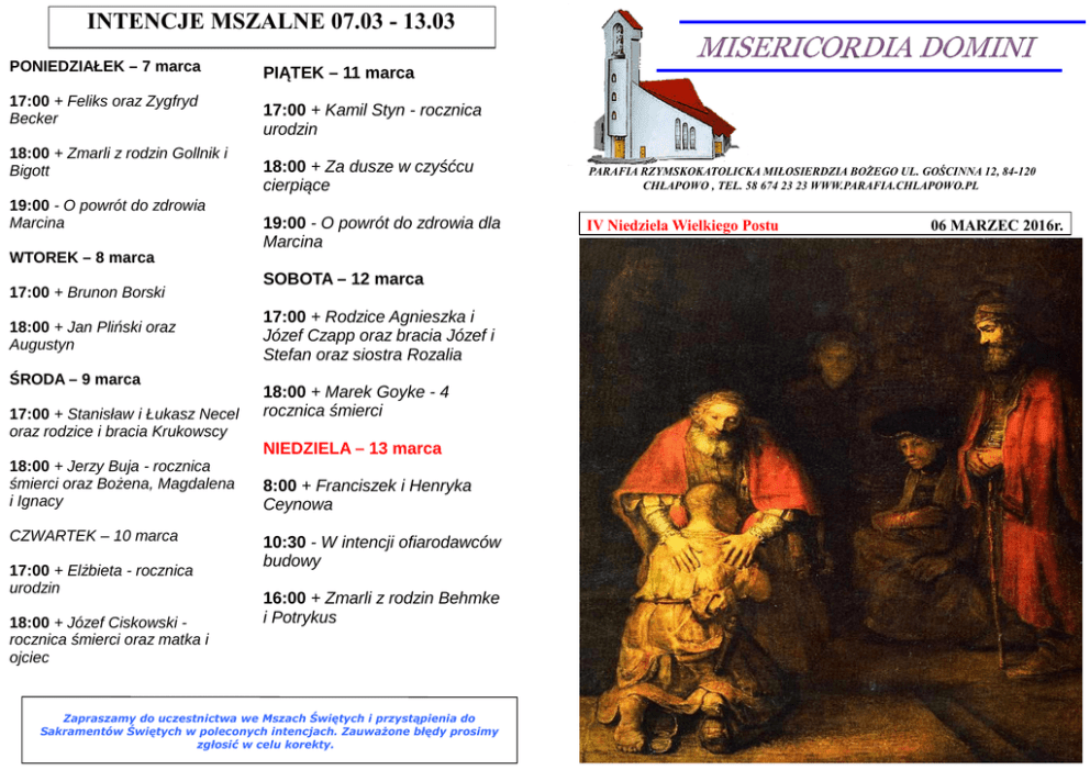 INTENCJE MSZALNE 07.03 - 13.03 PONIEDZIAŁEK – 7 marca 17:00 + Feliks oraz Zygfryd Becker 18:00 + Zmarli z rodzin Gollnik i Bigott 19:00 - O powrót do zdrowia Marcina WTOREK – 8 marca 17:00 + Brunon Borski 18:00 + Jan Pliński oraz Augustyn ŚRODA – 9 marca 17:00 + Stanisław i Łukasz Necel oraz rodzice i bracia Krukowscy 18:00 + Jerzy Buja - rocznica śmierci oraz Bożena, Magdalena i Ignacy CZWARTEK – 10 marca 17:00 + Elżbieta - rocznica urodzin 18:00 + Józef Ciskowski rocznica śmierci oraz matka i ojciec PIĄTEK – 11 marca 17:00 + Kamil Styn - rocznica urodzin 18:00 + Za dusze w czyśćcu cierpiące 19:00 - O powrót do zdrowia dla Marcina SOBOTA – 12 marca 17:00 + Rodzice Agnieszka i Józef Czapp oraz bracia Józef i Stefan oraz siostra Rozalia 18:00 + Marek Goyke - 4 rocznica śmierci NIEDZIELA – 13 marca 8:00 + Franciszek i Henryka Ceynowa 10:30 - W intencji ofiarodawców budowy 16:00 + Zmarli z rodzin Behmke i Potrykus Zapraszamy do uczestnictwa we Mszach Świętych i przystąpienia do Sakramentów Świętych w poleconych intencjach. Zauważone błędy prosimy zgłosić w celu korekty. PARAFIA RZYMSKOKATOLICKA MIŁOSIERDZIA BOŻEGO UL. GOŚCINNA 12, 84-120 CHŁAPOWO , TEL. 58 674 23 23 WWW.PARAFIA.CHLAPOWO.PL IV Niedziela Wielkiego Postu 06 MARZEC 2016r. IV Niedziela Wielkiego Postu 1 CZYTANIE: (Joz 5,9-12) 2 CZYTANIE: (2 Kor 5,17-21) EWANGELIA: (Łk 15,1-3.1132) POCHYLENI NAD SŁOWEM Jest to niewątpliwie jeden z najpiękniejszych fragmentów całej Biblii i w ogóle literatury. W zasadzie tekst ten nie ma żadnych precedensów w całych dziejach ludzkiej twórczości, a jeśli się nam z czymś kojarzy, to na pewno ten kojarzony tekst jest inspirowany tą przypowieścią. Tekst ten musi mieć boskie pochodzenie, gdyż żaden człowiek poza Wcielonym Bogiem nie byłby zdolny czegoś takiego wymyśleć. W miłosierdziu ojca jest bowiem zawarta wolność i miłość na miarę boskiej wszechmocy, a nie ludzkiej małoduszności. Ludzkie myślenie i odruchy reprezentuje brat syna marnotrawnego, natomiast ich ojciec to obraz Boga.Co jest najbardziej charakterystyczne dla tej przypowieści, to całkowicie zaskakująca i nieprzewidziana reakcja ojca. Wszystkiego moglibyśmy się spodziewać, tylko nie tego! Nawet mamy wiele słusznych argumentów przeciwko takiemu postępowaniu: że rozzuchwala, że uczy nieodpowiedzialności, że jest niesprawiedliwe i krzywdzące wobec starszego, porządnego syna. Według naszych ludzkich pojęć i myślenia, są to argumenty słuszne. Ale myślenie i sposoby działania Bożego są inne.Na szczęście inne! Albowiem wszyscy, choć może w różnym stopniu, przypominamy tego marnotrawnego syna i wszyscy, w mniejszym lub większym stopniu, potrzebujemy Bożego miłosierdzia. Niech nam się nie wydaje, że jesteśmy w sytuacji tego porządnego syna i że wszystko należy nam się samo przez się! To jest chyba największe nieporozumienie ludzkiego myślenia i pomyłka w ocenie samych siebie.Bierze się ona chyba stąd, że próbujemy mierzyć grzech naszą ludzką, prawniczo-sądową miarą, przeliczając go na konkretne szkody, przekroczone paragrafy przykazań, zmarnowane pieniądze. Jednakże grzech to nie jest sprawa nadużyć w buchalterii, lecz zranionej miłości Boga! Co było największym bólem ojca: stracone pieniądze czy lekceważenie i zawód, jaki sprawił lekkomyślny syn? Straty materialne czy tęsknota i troska o ukochane dziecko? Do Boga trzeba zawsze przykładać miarę miłości, a nie naszych ludzkich kalkulacji i wymiernej sprawiedliwości typu: „oko za oko”. Taką postawę przyjął starszy syn.Być może powodem, dla którego bardziej jesteśmy skłonni stanąć po jego stronie i jego rozumieć jest to, że chyba bardziej utożsamiamy się z nim, niż z tym młodszym. Uważamy, że jesteśmy w porządku, że z wszystkiego się rozliczyliśmy, nic nie zmarnowaliśmy, nikogo nie zabiliśmy, no, co najwyżej wymawia się te imiona święte czy zaklnie, ewentualnie zje kiełbasę w piątek. Jesteśmy porządni i Bóg powinien stanąć po naszej stronie, a nie zajmować się tymi wszystkimi grzesznikami. Do czarta z nimi! Kary na nich nie ma, oby z piekła nie wyszli! Przebaczyć im? Nigdy!Czy nie za pochopnie potępiamy innych i nie za łatwo stawiamy się po stronie zbawionych? Czy nie za szybko powołujemy się na nasze rzekome zasługi i wyglądamy nagrody? Czyż nie lepiej byłoby jednak zrezygnować ze swoich wątpliwych atutów, a zdać się na miłość i miłosierdzie Boga? Co jest pewniejsze: moje skromne oszczędności czy nieskończone skarby Boga, bogatego w miłosierdzie? Co daje większe szanse na wieczność: moja „porządność” czy miłość Boga? Na czym mogę bardziej polegać: na swojej bezgrzeszności czy na przebaczeniu Ojcowskiego serca? Co rokuje większe nadzieje? OGŁOSZENIA DUSZPASTERSKIE NA IV NIEDZIELE WIELKIEGO POSTU 06 MARZEC 2016 r. 1) Dzisiaj o godz. 14:15 odmówimy Różaniec Róż Różańcowych. Będziemy modlili się za rodziny przeżywające trudności, aby otrzymały wsparcie, a dzieci mogły wzrastać w zdrowym i pogodnym środowisku. 2) Pod chórem są skarbonki na jałmużnę wielkopostną i na kwiaty do Grobu Pańskiego. W zakrystii sprzedajemy paschaliki wielkanocne. 3) Dziękuję za sprzątnięcie kościoła. W tym tygodniu też w sobotę o godz. 18:30 proszę mieszkańców ul. Władysławowskiej 48 - 78, Jarzynowej, Chłopskiej i Koralowej. 4) Od 1 marca do 31 marca w Szkole Podstawowej w Chłapowie odbywa się rekrutacja dzieci do oddziałów przedszkolnych oraz klas pierwszych. Dotyczy to 4 latków i 5 latków, które mogą być zapisane do zerówki i 6 latków, które obowiązkowo muszą iść do zerówki. Ks. Proboszcz Wiesław Wett
