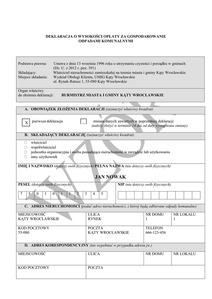 DEKLARACJA O WYSOKOŚCI OPŁATY ZA GOSPODAROWANIE ODPADAMI KOMUNALNYMI Podstawa prawna: Składający: Miejsce składania: Ustawa z dnia 13 września 1996 roku o utrzymaniu czystości i porządku w gminach (Dz. U. z 2012 r. poz. 391) Właściciel nieruchomości zamieszkałej na terenie miasta i gminy Kąty Wrocławskie Wydział Obsługi Klienta, UMIG Kąty Wrocławskie ul. Rynek-Ratusz 1, 55-080 Kąty Wrocławskie Organ właściwy do złożenia deklaracji: BURMISTRZ MIASTA I GMINY KĄTY WROCŁAWSKIE A. OBOWIĄZEK ZŁOŻENIA DEKLARACJI (zaznaczyć właściwy kwadrat) X pierwsza deklaracja zmiana danych zawartych w poprzedniej deklaracji (należy złożyć w terminie 14 dni od daty wystąpienia zmiany) B. SKŁADAJĄCY DEKLARACJĘ (zaznaczyć właściwy kwadrat) właściciel współwłaściciel jednostka organizacyjna i osoba posiadająca nieruchomość w zarządzie lub użytkowaniu inny użytkownik IMIĘ I NAZWISKO (dotyczy osób fizycznych)/PEŁNA NAZWA (nie dotyczy osób fizycznych) JAN NOWAK PESEL (dotyczy osób fizycznych) 7 5 0 1 0 1 1 NIP (nie dotyczy osób fizycznych) 2 3 4 5 C. ADRES NIERUCHOMOSCI (podać adres nieruchomości, z której będą odbierane odpady komunalne) MIEJSCOWOŚĆ KĄTY WROCLAWSKIE ULICA RYNEK NR DOMU 1 KOD POCZTOWY 55-080 POCZTA KĄTY WROCŁAWSKIE TELEFON 666-123-456 NR LOKALU 1 D. ADRES KORESPONDENCYJNY (nie wypełniać w przypadku adresu jw.) MIEJSCOWOŚĆ ULICA KOD POCZTOWY POCZTA NR DOMU NR LOKALU E. OŚWIADCZENIE WŁAŚCICIELA NIERUCHOMOŚCI Oświadczam, że na terenie nieruchomości wskazanej w części C niniejszej deklaracji odpady są gromadzone w sposób selektywny (segregacja odpadów) X TAK NIE F. OBLICZENIE WYSOKOŚCI OPŁATY Liczba osób zamieszkujących nieruchomość Miesięczna stawka opłaty za jednego mieszkańca Wyliczona wysokość opłaty miesięcznej (liczba osób x stawka) Wyliczona wysokość opłaty kwartalnej (opłata miesięczna x 3) 3 12,13 zł (jeśli zaznaczono TAK w dziale E) 15,97 zł (jeśli zaznaczono NIE w dziale E) 36,39 zł 109,17 zł UWAGA! Należy wypełnić załącznik nr 1 stanowiący wykaz osób zamieszkujących daną nieruchomość Oświadczam, że nieruchomość wskazana w części C niniejszej deklaracji wyposażona jest w kompostownik X TAK NIE G. OŚWIADCZENIE I PODPIS SKŁADAJĄCEGO DEKLARACJĘ POUCZENIE: - Niniejsza deklaracja stanowi podstawę do wystawienia tytułu wykonawczego, zgodnie z przepisami ustawy z dnia 17 czerwca 1966 r. o postępowaniu egzekucyjnym w administracji (Dz. U. z 2012 r., poz. 1015). - Zgodnie z ustawą z dnia 13 września 1996 roku o utrzymaniu czystości i porządku w gminach (Dz. U. z 2012 r. poz. 391) w przypadku zmiany danych będących podstawą ustalenia wysokości należnej opłaty za gospodarowanie odpadami komunalnymi, właściciel nieruchomości jest obowiązany złożyć nową deklarację w terminie 14 dni od dnia wystąpienia zmiany. - Weryfikacja danych zawartych w niniejszej deklaracji może nastąpić w oparciu o dane Urzędu Miasta i Gminy Kąty Wrocławskie. Wyrażam zgodę na przetwarzanie moich danych osobowych zawartych w przedłożonej dokumentacji, zgodnie z ustawą z dnia 29 sierpnia 1997 r. o ochronie danych osobowych (t.j. Dz. U. z 2002 r., Nr 101, poz. 926 ze zm.). ……………………………….. miejscowość, data …………………………… czytelny podpis Załącznik nr 1 do deklaracji o wysokości opłaty za gospodarowanie odpadami komunalnymi Wykaz osób zamieszkujących pod wskazanym adresem (wraz ze składającym deklarację, jeśli zamieszkuje) IMIĘ I NAZWISKO Lp. PESEL 1 JAN NOWAK 75010112345 2 EWA NOWAK 76121205432 3 PAWEŁ NOWAK 99010203321 ……………………………….. data …..………………………… czytelny podpis