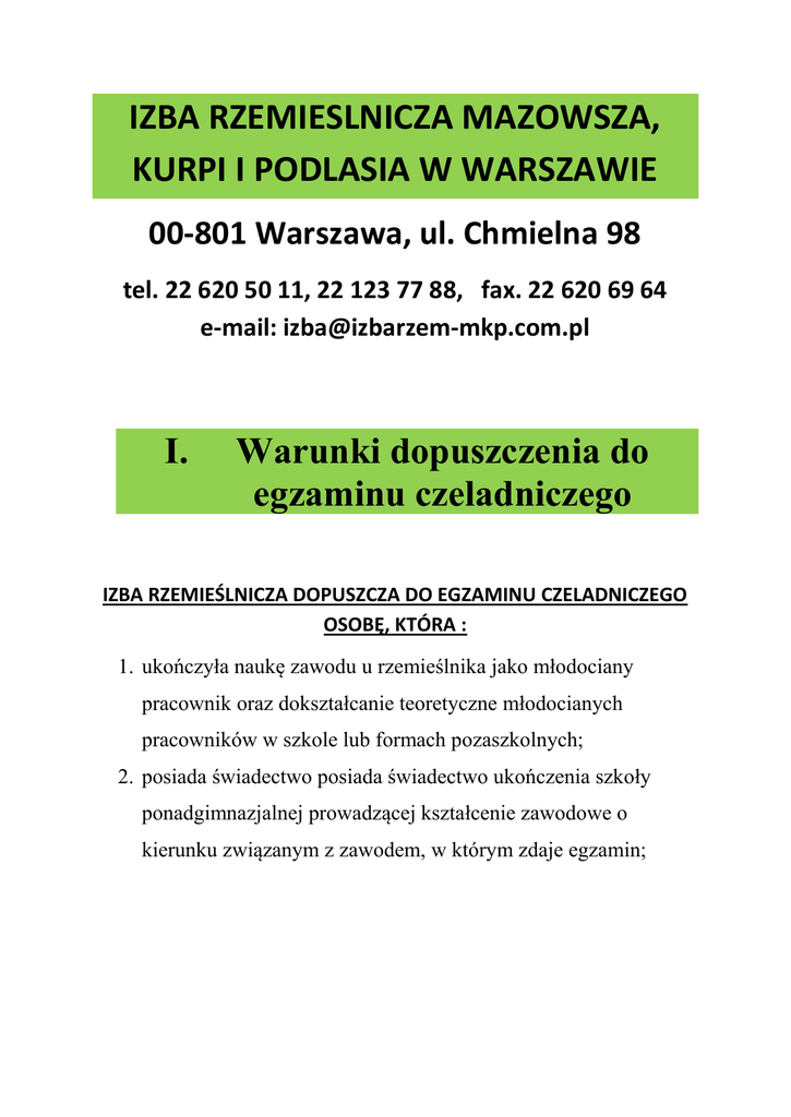 IZBA RZEMIESLNICZA MAZOWSZA, KURPI I PODLASIA W WARSZAWIE 00-801 Warszawa, ul. Chmielna 98 tel. 22 620 50 11, 22 123 77 88, fax. 22 620 69 64 e-mail: [email protected] I. Warunki dopuszczenia do egzaminu czeladniczego IZBA RZEMIEŚLNICZA DOPUSZCZA DO EGZAMINU CZELADNICZEGO OSOBĘ, KTÓRA : 1. ukończyła naukę zawodu u rzemieślnika jako młodociany pracownik oraz dokształcanie teoretyczne młodocianych pracowników w szkole lub formach pozaszkolnych; 2. posiada świadectwo posiada świadectwo ukończenia szkoły ponadgimnazjalnej prowadzącej kształcenie zawodowe o kierunku związanym z zawodem, w którym zdaje egzamin; OSOBA UBIEGAJĄCA SIĘ O DOPUSZCZENUIE DO EGZAMINU CZELADNICZEGO SKŁADA NASTEPUJACE DOUMENTY: 1. wniosek o dopuszczenie do egzaminu czeladniczego; 2. Umowa o pracę w celu przygotowania zawodowego wraz z zaświadczeniem ukończenia nauki zawodu wystawionym przez pracodawcę i potwierdzonym przez cech (jeżeli pracodawca jest członkiem cechu); 3. W przypadku realizacji nauki zawodu u kilku pracodawców należy dołączyć wszystkie umowy o pracę wraz ze świadectwami pracy; 4. Kopię dokumentów potwierdzających spełnianie z wyżej wymienionych warunków; 5. Jedną fotografię o wymiarach 37 x 52 mm; 6. Potwierdzenie wniesienia opłaty za egzamin. II. Przebieg egzaminu 1. Egzamin czeladniczy składa się z dwóch etapów: praktycznego i teoretycznego. 2. Kandydat zgłasza się na każdy etap egzaminu z dowodem osobistym lub innym dokumentem ze zdjęciem potwierdzającym jego tożsamość. 3. Czas trwania etapu praktycznego nie może być krótszy niż 120 minut i nie może być dłuższy niż 24 godziny łącznie w ciągu trzech dni. Etap praktyczny odbywa się u pracodawców lub w warsztatach szkoleniowych. 4. Etap teoretyczny składa się z części pisemnej i ustnej. 5. Etap teoretyczny rozpoczyna się od części pisemnej, która polega na rozwiązaniu testu wyboru. Kandydat udziela odpowiedzi na pytania z zakresu następujących tematów: a. rachunkowość zawodowa wraz z kalkulacją, b. dokumentacja działalności gospodarczej, c. rysunek zawodowy, d. zasady bezpieczeństwa i higieny pracy oraz ochrony przeciwpożarowej, e. podstawowe zasady ochrony środowiska, f. podstawowe przepisy prawa pracy, g. podstawowa problematyka z zakresu podejmowania działalności gospodarczej i zarządzania przedsiębiorstwem. 6. Zdający otrzymuje zestaw pytań egzaminacyjnych - test. W każdym wyżej wymienionym temacie udziela odpowiedzi na 7 pytań. Każde pytanie zawiera trzy propozycje odpowiedzi, z których tylko jedna jest prawidłowa. 7. Po wystawieniu ocen z części pisemnej egzaminu rozpoczyna się część ustna, która polega na udzieleniu przez zdającego odpowiedzi na pytania z zakresu następujących tematów: a. technologia, b. maszynoznawstwo, c. materiałoznawstwo. 8. Zdający losuje zestaw pytań zawierający po 3 pytania z każdego tematu, następnie przygotowuje się do udzielenia odpowiedzi przez około 10 minut i po zaproszeniu przez zespół egzaminacyjny przystępuje do udzielenia odpowiedzi. Czas trwania części ustnej nie może być dłuższy niż 30 minut. SZCZEGÓLOWE INFORMACJE: 22 654 96 98, 22 6205017; 22 620 50 11 w. 15. www.izbarzem-mkp.com.pl Źródło: http://www.izbarzem-mkp.com.pl/