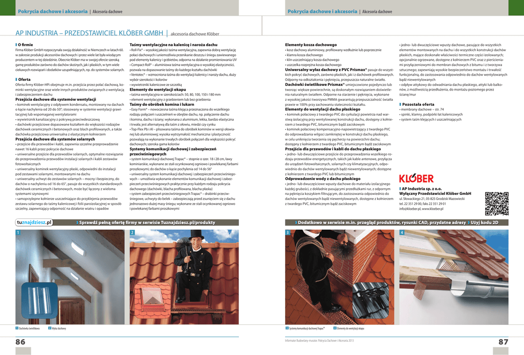 Pokrycia dachowe i akcesoria | Akcesoria dachowe Pokrycia dachowe i akcesoria | Akcesoria dachowe AP INDUSTRIA – Przedstawiciel Klöber GMBH | akcesoria dachowe Klöber ❚ O firmie Taśmy wentylacyjne na kalenicę i naroża dachu Elementy kosza dachowego Firma Klöber GmbH rozpoczynała swoją działalność w Niemczech w latach 60. w zakresie produkcji akcesoriów dachowych i przez wiele lat była wiodącym producentem w tej dziedzinie. Obecnie Klöber ma w swojej ofercie szeroką gamę produktów zarówno do dachów skośnych, jak i płaskich, w tym wiele ciekawych rozwiązań i dodatków uzupełniających, np. do systemów solarnych. • Roll-Fix® – wysokiej jakości taśma wentylacyjna, zapewnia dobrą wentylację połaci dachowych i uniemożliwia przenikanie deszczu i śniegu zawiewanego pod elementy kalenicy i grzbietów, odporna na działanie promieniowania UV • Compact-Roll® – aluminiowa taśma wentylacyjna o wysokiej elastyczności, pozwala na dopasowanie taśmy do każdego kształtu dachówki • Ventotec® – wzmocniona taśma do wentylacji kalenicy i naroży dachu, duży wybór szerokości i kolorów • wywietrzniki kalenicowe ze szczotką Taśmy do obróbek komina i lukarn • kosz dachowy aluminiowy, profilowany wzdłużnie lub poprzecznie • klamra kosza dachowego • klin uszczelniający kosza dachowego • uszczelka rozprężna kosza dachowego Uniwersalny wyłaz dachowy z PVC Prismax® pasuje do wszystkich pokryć dachowych, zarówno płaskich, jak i z dachówek profilowanych. Odporny na odkształcenia i pęknięcia, przepuszcza naturalne światło. Dachówki świetlikowe Prismax® umiejscowione pojedynczo lub tworząc większe powierzchnie, są doskonałym rozwiązaniem doświetlenia naturalnym światłem. Odporne na starzenie i pęknięcia, wykonane z wysokiej jakości tworzywa PMMA gwarantują przepuszczalność światła prawie w 100% przy zachowaniu stateczności kształtu. • Easy Form® – nowoczesna taśma klejąca przeznaczona do wszelkiego rodzaju połączeń i uszczelnień w obrębie dachu, np. połączenie dachu i komina, dachu i ściany; wykonana z aluminium, lekka, bardzo elastyczna i trwała; jest alternatywą dla taśm z ołowiu, miedzi czy cynku • Top-Flex Pb i Al – plisowana taśma do obróbek kominów w wersji ołowianej lub aluminiowej; wysoka wytrzymałość mechaniczna i plastyczność pozwalają na wykonanie trwałych obróbek połączeń dla większości pokryć dachowych; szeroka gama kolorów • kominek połaciowy z twardego PVC do cyrkulacji powietrza nad warstwą izolacyjną przy wentylowanej konstrukcji dachu, dostępny z kołnierzem z twardego PVC, bitumicznym bądź zaciskowym • kominek połaciowy kompensacyjno-napowietrzający z twardego PVC do odprowadzania wilgoci zamkniętej w konstrukcji dachu płaskiego, w celu uniknięcia tworzenia się pęcherzy na powierzchni dachu; dostępny z kołnierzem z twardego PVC, bitumicznym bądź zaciskowym ❚ Oferta Oferta firmy Klöber-HPi obejmuje m.in. przejścia przez połać dachową, kominki wentylacyjne oraz wiele innych produktów związanych z wentylacją i zabezpieczeniem dachu Przejścia dachowe dla systemów wentylacji • kominek wentylacyjny z odpływem kondensatu, montowany na dachach o kącie nachylenia od 20 do 50°; stosowany w systemie wentylacji grawitacyjnej lub wspomaganej wentylatorami • wywietrznik kanalizacyjny z pokrywą przeciwdeszczową • dachówki przejściowe dopasowane kształtem do większości rodzajów dachówek ceramicznych i betonowych oraz blach profilowanych, a także dachówka przejściowa uniwersalna z elastycznym kołnierzem Przejścia dachowe dla systemów solarnych • przejście dla przewodów i kabli, zapewnia szczelne przeprowadzenie nawet 16 kabli przez pokrycie dachowe • uniwersalne przejście dla przewodów solarnych, optymalne rozwiązanie do przeprowadzenia przewodów instalacji solarnych i kabli zestawów fotowoltaicznych • uniwersalny kominek wentylacyjny płaski, odpowiedni do instalacji pod zestawami solarnymi, montowanymi na dachu • uniwersalny uchwyt do zestawów solarnych – mocny i bezpieczny, do dachów o nachyleniu od 16 do 65°, pasuje do wszystkich standardowych dachówek ceramicznych i betonowych, może być łączony z wieloma systemami szynowymi • samoprzylepne kołnierze uszczelniające do przyklejenia przewodów zestawu solarnego do taśmy kalenicowej i folii paroizolacyjnej w sposób szczelny, zapewniający odporność na działanie wiatru i opadów Elementy do wentylacji okapu • taśma wentylacyjna w szerokościach: 50, 80, 100, 150 i 180 mm • element wentylacyjny z grzebieniem lub bez grzebienia Systemy komunikacji dachowej i zabezpieczeń przeciwśniegowych • system komunikacji dachowej Trapac® – stopnie o szer. 18 i 28 cm, ławy kominiarskie, wykonane ze stali ocynkowanej ogniowo i powlekanej farbami proszkowymi; do dachów o kącie pochylenia od 14 do 56° • uniwersalny system komunikacji dachowej i zabezpieczeń przeciwśniegowych – umożliwia wykonanie elementów komunikacji dachowej i zabezpieczeń przeciwśniegowych praktycznie przy każdym rodzaju pokrycia dachowego (dachówki, blacha profilowana, blacha płaska) • system zabezpieczeń przeciwśniegowych Trapac® – drabinki przeciwśniegowe, uchwyty do belek – zabezpieczają przed zsunięciem się z dachu jednorazowo dużej masy śniegu; wykonane ze stali ocynkowanej ogniowo i powlekanej farbami proszkowymi Elementy do wentylacji dachu płaskiego 1 Dachówka świetlikowa 86 2 2 Wyłaz dachowy ❚ Pozostała oferta • membrany dachowe – str. 74 • spinki, klamry, podpórki łat kalenicowych • system taśm klejących i uszczelniających Przejścia dla przewodów i kabli do dachu płaskiego • jedno- lub dwuczęściowe przejście do przeprowadzenia wszelkiego rodzaju przewodów energetycznych, takich jak kable antenowe, przyłącza do urządzeń fotowoltaicznych, solarnych czy klimatyzacyjnych, odpowiednio do dachów