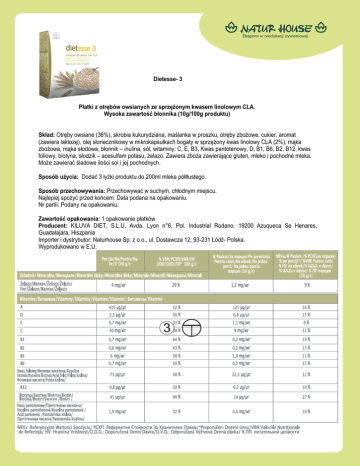 . Dietesse- 3 Płatki z otrębów owsianych ze sprzężonym kwasem linolowym CLA. Wysoka zawartość błonnika (10g/100g produktu) Skład: Otręby owsiane (36%), skrobia kukurydziana, maślanka w proszku, otręby zbożowe, cukier, aromat (zawiera laktozę), olej słonecznikowy w mikrokapsułkach bogaty w sprzężony kwas linolowy CLA (2%), mąka zbożowa, mąka słodowa, błonnik – inulina, sól, witaminy: C, E, B3, Kwas pantotenowy, D, B1, B6, B2, B12, kwas foliowy, biotyna, słodzik – acesulfam potasu, żelazo. Zawiera zboża zawierające gluten, mleko i pochodne mleka. Może zawierać śladowe ilości soi i jej pochodnych. Sposób użycia: Dodać 3 łyżki produktu do 200ml mleka półtłustego. Sposób przechowywania: Przechowywać w suchym, chłodnym miejscu. Najlepiej spożyć przed końcem: Data podana na opakowaniu. Nr partii: Podany na opakowaniu. Zawartość opakowania: 1 opakowanie płatków Producent: KILUVA DIET, S.L.U. Avda. Lyon n°6, Pol. Industrial Rodano. 19200 Azuqueca Se Henares, Guadalajara, Hiszpania Importer i dystrybutor: Naturhouse Sp. z o.o., ul. Dostawcza 12, 93-231 Łódź- Polska. Wyprodukowano w E.U. Płatki Dietesse- 3 są doskonałym pomysłem na śniadanie. Nie tylko dostarczają węglowodanów złożonych, ale również uzupełniają nasz organizm w niezbędne witaminy oraz żelazo. Dodatkowo płatki zawierają sprzężony kwas linolowy CLA oraz błonnik. CLA Kwas rumenowy (tzw. sprzężony kwas linolowy, CLA) – organiczny związek chemiczny z grupy nienasyconych kwasów tłuszczowych. Jest jednym z izomerów kwasu linolowego zawierającym dwa sprzężone wiązania podwójne. Badania na zwierzętach potwierdziły, że CLA jest silnym środkiem przeciwnowotworowym. Niski poziom kwasu rumenowego w surowicy krwi powiązany został ze zwiększonym ryzykiem zachorowania kobiet na raka piersi. CLA dobrze wpływa na układ immunologiczny – zwiększa odporność na wirusy, może tłumić reakcje alergiczne. Przyjmowanie CLA w czasie odchudzania korzystnie wpływa na samopoczucie. Obniża poziom trójglicerydów, cholesterolu i cukru we krwi.