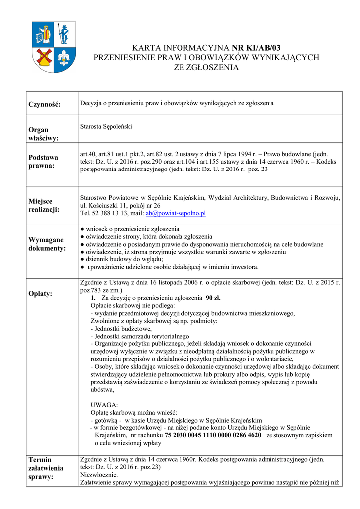 KARTA INFORMACYJNA NR KI/AB/03 PRZENIESIENIE PRAW I OBOWIĄZKÓW WYNIKAJĄCYCH ZE ZGŁOSZENIA Czynność: Decyzja o przeniesieniu praw i obowiązków wynikających ze zgłoszenia Organ właściwy: Starosta Sępoleński Podstawa prawna: art.40, art.81 ust.1 pkt.2, art.82 ust. 2 ustawy z dnia 7 lipca 1994 r. – Prawo budowlane (jedn. tekst: Dz. U. z 2016 r. poz.290 oraz art.104 i art.155 ustawy z dnia 14 czerwca 1960 r. – Kodeks postępowania administracyjnego (jedn. tekst: Dz. U. z 2016 r. poz. 23 Miejsce realizacji: Starostwo Powiatowe w Sępólnie Krajeńskim, Wydział Architektury, Budownictwa i Rozwoju, ul. Kościuszki 11, pokój nr 26 Tel. 52 388 13 13, mail: [email protected] Wymagane dokumenty: Opłaty: ● wniosek o przeniesienie zgłoszenia ● oświadczenie strony, która dokonała zgłoszenia ● oświadczenie o posiadanym prawie do dysponowania nieruchomością na cele budowlane ● oświadczenie, iż strona przyjmuje wszystkie warunki zawarte w zgłoszeniu ● dziennik budowy do wglądu; ● upoważnienie udzielone osobie działającej w imieniu inwestora. Zgodnie z Ustawą z dnia 16 listopada 2006 r. o opłacie skarbowej (jedn. tekst: Dz. U. z 2015 r. poz.783 ze zm.) 1. Za decyzję o przeniesieniu zgłoszenia 90 zł. Opłacie skarbowej nie podlega: - wydanie przedmiotowej decyzji dotyczącej budownictwa mieszkaniowego, Zwolnione z opłaty skarbowej są np. podmioty: - Jednostki budżetowe, - Jednostki samorządu terytorialnego - Organizacje pożytku publicznego, jeżeli składają wniosek o dokonanie czynności urzędowej wyłącznie w związku z nieodpłatną działalnością pożytku publicznego w rozumieniu przepisów o działalności pożytku publicznego i o wolontariacie, - Osoby, które składając wniosek o dokonanie czynności urzędowej albo składając dokument stwierdzający udzielenie pełnomocnictwa lub prokury albo odpis, wypis lub kopię przedstawią zaświadczenie o korzystaniu ze świadczeń pomocy społecznej z powodu ubóstwa, UWAGA: Opłatę skarbową można wnieść: - gotówką - w kasie Urzędu Miejskiego w Sępólnie Krajeńskim - w formie bezgotówkowej - na niżej podane konto Urzędu Miejskiego w Sępólnie Krajeńskim, nr rachunku 75 2030 0045 1110 0000 0286 4620 ze stosownym zapiskiem o celu wniesionej wpłaty Termin załatwienia sprawy: Zgodnie z Ustawą z dnia 14 czerwca 1960r. Kodeks postępowania administracyjnego (jedn. tekst: Dz. U. z 2016 r. poz.23) Niezwłocznie. Załatwienie sprawy wymagającej postępowania wyjaśniającego powinno nastąpić nie później niż w ciągu miesiąca, a sprawy szczególnie skomplikowane - nie później niż w ciągu dwóch miesięcy od dnia wszczęcia postępowania. Tryb odwoławczy: Od decyzji służy stronie odwołanie do Wojewody Kujawsko – Pomorskiego w Bydgoszczy za pośrednictwem Starosty Sępoleńskiego w terminie czternastu dni od dnia doręczenia decyzji. Stan prawny na 14.12.2015 r. Zatwierdził: