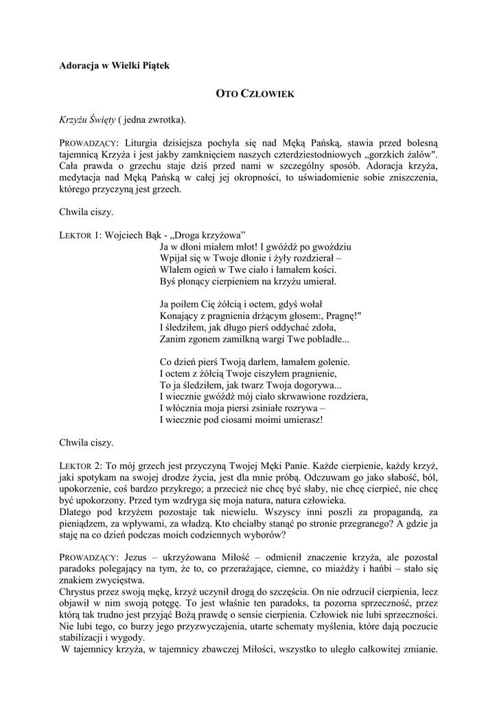 Adoracja w Wielki Piątek OTO CZŁOWIEK KrzyŜu Święty ( jedna zwrotka). PROWADZĄCY: Liturgia dzisiejsza pochyla się nad Męką Pańską, stawia przed bolesną tajemnicą KrzyŜa i jest jakby zamknięciem naszych czterdziestodniowych „gorzkich Ŝalów". Cała prawda o grzechu staje dziś przed nami w szczególny sposób. Adoracja krzyŜa, medytacja nad Męką Pańską w całej jej okropności, to uświadomienie sobie zniszczenia, którego przyczyną jest grzech. Chwila ciszy. LEKTOR 1: Wojciech Bąk - „Droga krzyŜowa” Ja w dłoni miałem młot! I gwóźdź po gwoździu Wpijał się w Twoje dłonie i Ŝyły rozdzierał – Wlałem ogień w Twe ciało i łamałem kości. Byś płonący cierpieniem na krzyŜu umierał. Ja poiłem Cię Ŝółcią i octem, gdyś wołał Konający z pragnienia drŜącym głosem:, Pragnę!" I śledziłem, jak długo pierś oddychać zdoła, Zanim zgonem zamilkną wargi Twe pobladłe... Co dzień pierś Twoją darłem, łamałem golenie. I octem z Ŝółcią Twoje ciszyłem pragnienie, To ja śledziłem, jak twarz Twoja dogorywa... I wiecznie gwóźdź mój ciało skrwawione rozdziera, I włócznia moja piersi zsiniałe rozrywa – I wiecznie pod ciosami moimi umierasz! Chwila ciszy. LEKTOR 2: To mój grzech jest przyczyną Twojej Męki Panie. KaŜde cierpienie, kaŜdy krzyŜ, jaki spotykam na swojej drodze Ŝycia, jest dla mnie próbą. Odczuwam go jako słabość, ból, upokorzenie, coś bardzo przykrego; a przecieŜ nie chcę być słaby, nie chcę cierpieć, nie chcę być upokorzony. Przed tym wzdryga się moja natura, natura człowieka. Dlatego pod krzyŜem pozostaje tak niewielu. Wszyscy inni poszli za propagandą, za pieniądzem, za wpływami, za władzą. Kto chciałby stanąć po stronie przegranego? A gdzie ja staję na co dzień podczas moich codziennych wyborów? PROWADZĄCY: Jezus – ukrzyŜowana Miłość – odmienił znaczenie krzyŜa, ale pozostał paradoks polegający na tym, Ŝe to, co przeraŜające, ciemne, co miaŜdŜy i hańbi – stało się znakiem zwycięstwa. Chrystus przez swoją mękę, krzyŜ uczynił drogą do szczęścia. On nie odrzucił cierpienia, lecz objawił w nim swoją potęgę. To jest właśnie ten paradoks, ta pozorna sprzeczność, przez którą tak trudno jest przyjąć BoŜą prawdę o sensie cierpienia. Człowiek nie lubi sprzeczności. Nie lubi tego, co burzy jego przyzwyczajenia, utarte schematy myślenia, które dają poczucie stabilizacji i wygody. W tajemnicy krzyŜa, w tajemnicy zbawczej Miłości, wszystko to uległo całkowitej zmianie. 2 To, co było wzgardzone - stało się Boskie; to co było klęską - stało się zwycięstwem; to co umarło - stało się nowym Ŝyciem. Chwila ciszy. LEKTOR 1: Iz 52, 13 - 53,6. Oto się powiedzie mojemu Słudze, wybije się, wywyŜszy i wyrośnie bardzo. Jak wielu osłupiało na Jego widok - - tak nieludzko został oszpecony Jego wygląd i postać Jego była niepodobna do ludzi - tak mnogie narody się zdumieją, królowie zamkną przed Nim usta, bo ujrzą coś, czego im nigdy nie opowiadano, i pojmą coś niesłychanego. KtóŜ uwierzy temu, cośmy usłyszeli? Na kimŜe się ramię Pańskie objawiło? On wyrósł przed nami jak młode drzewo i jakby korzeń z wyschniętej ziemi. Nie miał On wdzięku ani teŜ blasku, aby na Niego popatrzeć, ani wyglądu, by się nam podobał. Wzgardzony i odepchnięty przez ludzi, MąŜ boleści, oswojony z cierpieniem, jak ktoś, przed kim się twarze zakrywa, wzgardzony tak, iŜ mieliśmy Go za nic. Lecz On się obarczył naszym cierpieniem, On dźwigał nasze boleści, a myśmy Go za skazańca uznali, chłostanego przez Boga i zdeptanego. Lecz On był przebity za nasze grzechy, zdruzgotany za nasze winy. Spadła Nań chłosta zbawienna dla nas, a w Jego ranach jest nasze zdrowie. Wszyscyśmy pobłądzili jak owce, kaŜdy z nas się obrócił ku własnej drodze, a Pan zwalił na Niego winy nas wszystkich. Chwila ciszy. PROWADZĄCY: Za mnie tak cierpiał… 0n się obarczył naszym cierpieniem... przebity za nasze grzechy, zdruzgotany za nasze winy" (Iz 53,4-5). Czy moŜna więc lekkomyślnie podchodzić do grzechu.? Grzech przecieŜ nie jest jakąś niewinną pomyłką, epizodem. To przecieŜ, z powodu grzechu, Syn BoŜy czysty i bez winy, z miłości dla mnie, stał się męŜem boleści, zmiaŜdŜonym cierpieniem. KrzyŜu Chrystusa bądźŜe pochwalony. PROWADZĄCY: „Ecce Homo”- Oto Człowiek. W obrazie umęczonego Chrystusa Bóg ukazał ruinę, którą grzech powoduje w człowieczeństwie: „postać Jego była niepodobna do ludzi" (Iz 52,14). W twarzy Chrystusa pohańbionego czytamy hańbę naszego grzechu. W oszpeceniu twarzy Chrystusa umęczonego widzę szpetotę moich win. LEKTOR 2: Wiersz „Ecce Homo” – Mikołaj Bieszczadowski Oto człowiek Odtrącony upokorzony wyśmiany Wysmagany rózgami przybrany z błazna Król malowany krwią Wydany na urągowisko Ostatni pośród ostatnich Skazaniec Oto nasz Bóg Godzien bezgranicznej miłości Jedyna i bezgraniczna miłość nasza Wizerunek nasz i odbicie nasze Los nasz. Chwila ciszy. 3 PROWADZĄCY: Do mnie mówi dziś Chrystus niosący krzyŜ: „Nie płaczcie nade Mną, płaczcie raczej nad sobą i nad waszymi dziećmi" (Łk 23,28). Ale mój płacz to nie sentymentalna Ŝałość czy beznadziejna rozpacz; nie, ten płacz to płacz człowieka wołającego: „Moja wina, zgrzeszyłem, Panie". Mój płacz, to łzy grzesznicy u stóp Chrystusa. Jak krzyŜ jest miejscem, w którym miłość Boga spotyka i zwycięŜa ludzki grzech, tak wyznanie winy jest otwarciem się na miłość, która przychodzi przez krzyŜ. LEKTOR 2: Psalm 50. Golgoto PROWADZĄCY: KrzyŜ jest owocem nieskończonej miłości Ojca do mnie, do człowieka: ,,Bóg tak umiłował świat, ze Syna swego Jednorodzonego dał, aby kaŜdy kto w Niego wierzy nie zginął ale Ŝycie wieczne miał." – napisał św. Jan w swojej Ewangelii. KrzyŜ jest owocem miłości Syna,..bo nikt nie ma większej miłoś