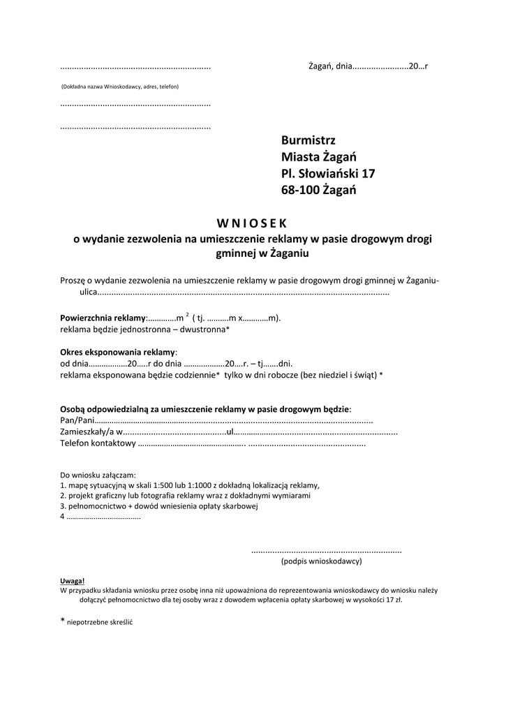................................................................ Żagań, dnia........................20…r (Dokładna nazwa Wnioskodawcy, adres, telefon) ................................................................ ................................................................ Burmistrz Miasta Żagań Pl. Słowiański 17 68-100 Żagań WNIOSEK o wydanie zezwolenia na umieszczenie reklamy w pasie drogowym drogi gminnej w Żaganiu Proszę o wydanie zezwolenia na umieszczenie reklamy w pasie drogowym drogi gminnej w Żaganiuulica............................................................................................................................ Powierzchnia reklamy:………….m 2 ( tj. ……….m x…………m). reklama będzie jednostronna – dwustronna* Okres eksponowania reklamy: od dnia………………20…..r do dnia ……………….20….r. – tj…….dni. reklama eksponowana będzie codziennie* tylko w dni robocze (bez niedziel i świąt) * Osobą odpowiedzialną za umieszczenie reklamy w pasie drogowym będzie: Pan/Pani……………………………………................................................................................ Zamieszkały/a w............................................ul……………........................................................ Telefon kontaktowy ………………………………………….. .................................................. Do wniosku załączam: 1. mapę sytuacyjną w skali 1:500 lub 1:1000 z dokładną lokalizacją reklamy, 2. projekt graficzny lub fotografia reklamy wraz z dokładnymi wymiarami 3. pełnomocnictwo + dowód wniesienia opłaty skarbowej 4 ……………………………….. ................................................................ (podpis wnioskodawcy) Uwaga! W przypadku składania wniosku przez osobę inna niż upoważniona do reprezentowania wnioskodawcy do wniosku należy dołączyć pełnomocnictwo dla tej osoby wraz z dowodem wpłacenia opłaty skarbowej w wysokości 17 zł. * niepotrzebne skreślić