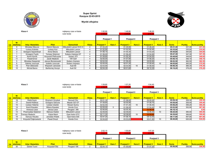 Super Sprint Kaczyce 22-03-2015 Wyniki oficjalne Klasa 4 najlepszy czas w klasie czas taryfy 1:52,90 2:49,35 1:49,90 2:44,85 Przejazd 1 Lp 1 2 3 4 5 6 7 8 9 10 Nr startowy 9 4 3 1 8 11 5 6 12 10 Imię i Nazwisko Mirosław Macura Łukasz Kobiela Grzegorz Szpandrzyk Grzegorz Fujcik Kamil Hornik Paweł Ernst Mirosław Kasperski Gabriel Juszczyk Piotr Żbikowski Michał Baron Pilot Marcin Macura Łukasz Kuś Anna Sikora Tomasz Sztymon Krzysztof Pietruszka Jacek Madecki Janusz Bocianowski Izabela Juszczyk Wojciech Janowski Bartłomiej Horzyk Klasa 3 Samochód Mitsubishi Lancer EVO X Mitsubishi Lancer Mitsubishi Lancer Subaru Impreza GT Subaru STI VW Golf Subaru Impreza Subaru Impreza Audi 80 Audi S2 Klasa 4 4 4 4 4 4 4 4 4 4 najlepszy czas w klasie czas taryfy Przejazd 1 01:53,20 01:52,90 01:56,10 01:56,00 01:59,80 02:00,00 02:02,50 02:05,00 02:03,90 02:04,30 Przejazd 2 Kara 1 1:59,80 2:59,70 Lp 1 2 3 4 5 6 7 8 9 Pilot Wojciech Grzybek Grzegorz Szkucie Łukasz Usarek Milena Kawalec Janusz Łasa Mariusz Dadok Edyta Mach Jarosław Walek Paweł Drozd Klasa 2 Samochód Renault Clio Mazda 323 GT Nissan Sunny Honda Civic Peugeot 306 Mitsubishi Lancer Opel Astra GTC Opel Astra GSI Honda Civic Klasa 3 3 3 3 3 3 3 3 3 najlepszy czas w klasie czas taryfy Przejazd 1 02:01,30 01:59,80 02:02,50 02:00,00 02:06,80 02:09,90 02:11,20 02:07,20 02:04,60 Lp 1 Imię i Nazwisko Daniel Turoń Pilot Krzysztof Śliż Samochód Peugeot 106 Kara 1 5 2:02,10 3:03,15 Klasa 2 Przejazd 1 02:04,10 Kara 2 10 Przejazd 2 01:58,00 02:00,90 01:57,20 01:58,50 02:05,30 02:09,60 02:08,60 01:58,10 03:53,60 Kara 2 10 10 10 Suma 05:31,30 05:35,80 05:44,60 05:47,30 05:49,60 05:56,10 06:02,50 06:05,60 06:06,30 06:18,20 Punkty Suma punkty 331,30 331,30 335,80 335,80 344,60 344,60 347,30 347,30 349,60 349,60 356,10 356,10 362,50 362,50 375,50 365,50 376,30 366,30 378,20 378,20 Przejazd 3 02:00,00 01:58,70 01:56,50 01:54,40 02:06,00 02:06,00 02:09,80 04:12,50 02:41,80 Kara 3 Suma 05:59,30 05:59,40 05:56,20 05:52,90 06:18,10 06:25,50 06:29,60 08:17,80 08:40,00 Punkty Suma punkty 359,30 359,30 359,40 359,40 366,20 356,20 367,90 352,90 0,00 395,50 385,50 399,80 389,80 497,80 497,80 530,00 520,00 10 10 10 Suma 05:56,90 Punkty Suma punkty 356,90 356,90 1:57,20 2:55,80 Przejazd 2 Przejazd 2 01:55,60 Kara 3 Przejazd 3 1:55,60 2:53,40 Kara 1 Przejazd 3 01:48,20 01:50,40 01:53,20 01:54,90 01:54,50 01:58,20 02:00,60 01:59,40 01:58,50 02:12,30 1:54,40 2:51,60 Przejazd 2 Przejazd 1 Nr startowy 30 Przejazd 2 01:49,90 01:52,50 01:55,30 01:56,40 01:55,30 01:57,90 01:59,40 02:01,20 02:03,90 02:01,60 Przejazd 3 1:57,20 2:55,80 Przejazd 1 Nr Imię i Nazwisko startowy 18 Rafał Szpin 17 Dawid Holeksa 15 Łukasz Halama 14 Kamil Kawalec 21 Ireneusz Łasa 13 Przemysław Salamon 61 Tomasz Madecki 19 Dariusz Heczko 16 Krzysztof Dąbrowiecki 1:48,20 2:42,30 Kara 2 Przejazd 3 Przejazd 3 01:57,20 Kara 3 2 3 4 5 6 7 8 9 10 11 12 13 23 29 28 32 24 27 26 31 22 25 63 62 Daniel Dembinny Janusz Stebel Patryk Siąkała Piotr Krysiak Mariusz Cieślar Wojciech Tomalik Marcin Stefanik Andrzej Dobosz Michał Locher Robert Niemiec Józef Mirocha Tomasz Jędrzejko Damian Włodarczyk Joanna Stebel Robert Sęk Paweł Danilewicz Andrzej Krzywoń Grzegorz Golik Łukasz Roik Marek Wisełka Marcin Borkowski Barbara Ernst Tobiasz Spratek Arek Góra Klasa 1 Honda CRX Honda Civic Vti Peugeot 106 Mitsubishi Colt Honda Civic Daewoo Lanos Opel Corsa VW Polo GTI Citroen Saxo Opel Corsa GSI Skoda Favorit Citroen Saxo 2 2 2 2 2 2 2 2 2 2 2 2 najlepszy czas w klasie czas taryfy 02:06,90 02:02,10 02:04,60 02:04,60 02:09,90 02:08,50 02:07,90 02:05,20 02:11,10 02:02,30 02:15,90 02:11,40 10 1:55,10 2:52,65 Przejazd 1 Lp 1 2 3 4 5 6 8 9 10 11 12 13 14 Nr startowy 2 36 33 43 40 35 34 37 41 44 45 38 42 Imię i Nazwisko Przemysław Mendrek Jakub Pyzia Krzysiek Szturc Krystian Kurowski Marcin Bieniak Artur Bal Gabriel Głazowski Sylwia Graboń Przemysław Kasza Remigiusz Rainda Dawid Krzempek Marcin Biernat Kordian Ochocki Pilot Artur Kałuża Tomasz Pyzia Monika Balcar Jakub Wilczęga Arkadiusz Kula Marcin Bal Szymon Gorzelak Maciej Jarząbek Diana Miech Patryk Gluza Mateusz Kunc Alicja Biernat Wojciech Grzybek Klasa Markowa Samochód Suzuki Swift Renault Clio Peugeot 205 Subaru Justy Fiat SC Suzuki Swift Rover 214 Fiat SC Honda Civic Rover 200 Honda Civic Fiat CC Fiat SC Klasa 1 1 1 1 1 1 1 1 1 1 1 1 1 najlepszy czas w klasie czas taryfy Przejazd 1 01:55,10 02:02,90 02:04,10 02:04,20 02:06,90 02:07,40 02:10,10 02:04,90 02:13,00 02:14,80 02:15,00 02:15,40 02:27,30 Nr startowy 48 47 56 54 52 49 50 46 55 53 51 Imię i Nazwisko Tomasz Łukosz Rafał Telega Daniel Opioła Bartosz Niewiadomski Bartłomiej Podżorski Mariusz Pońc Piotr Płaczek Patryk Pagieła Jacek Jerzy Majewski Sebastian Gutman Krzysztof Borkała Pilot Regina Osuch Jakub Pasternak Michał Pydych Tomasz Anioł Magdalena Podżorska Dagmara Kowol Wojciech Płaczek Tomasz Ogrodzki Jacek Majewski Mateusz Bury Seweryn Szkucik Samochód Fiat 126p Fiat 126p Fiat 126p Fiat 126p Fiat 126p Fiat 126p Fiat 126p Fiat 126p Fiat 126p Fiat 126p Fiat 126p Kara 1 2:03,40 3:05,10 Klasa Przejazd 1 02:03,40 02:03,90 02:07,60 02:08,70 02:12,20 02:13,00 02:12,30 02:21,20 02:15,10 02:11,80 02:37,30 01:58,10 02:01,80 02:01,40 02:03,50 01:59,50 02:04,80 02:01,60 02:01,70 02:11,10 02:09,40 02:09,40 02:24,10 1:48,90 2:43,35 1:51,00 2:46,50 Przejazd 2 Przejazd 2 01:48,90 02:00,30 02:03,70 02:02,50 01:59,50 02:04,90 02:04,10 02:01,50 02:11,60 02:13,80 02:16,70 02:08,10 02:18,40 Kara 2 20 5 10 10 60 Przejazd 2 02:02,80 02:03,60 02:02,40 02:07,70 02:09,80 02:09,20 02:15,80 02:14,20 02:16,30 02:11,90 02:38,50 5 363,90 364,10 369,20 370,00 370,60 378,70 373,10 373,20 387,70 382,40 395,80 403,90 363,90 364,10 369,20 370,00 370,60 378,70 383,10 383,20 387,70 392,40 395,80 408,90 Przejazd 3 01:51,00 01:59,70 01:59,40 02:02,00 01:58,10 02:03,90 02:03,40 02:00,90 02:08,60 02:09,40 02:11,10 02:31,70 02:15,10 Kara 3 10 Suma 05:35,00 06:02,90 06:07,20 06:08,70 06:04,50 06:16,20 0