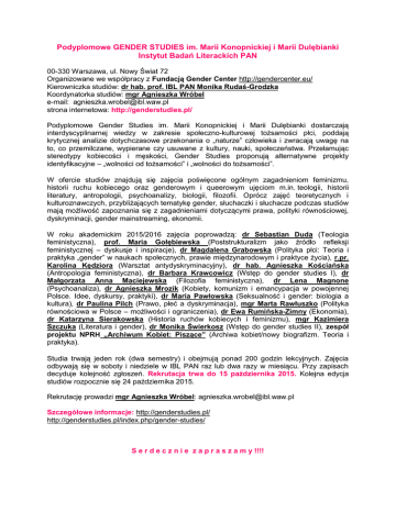 Podyplomowe GENDER STUDIES im. Marii Konopnickiej i Marii Dulębianki Instytut Badań Literackich PAN 00-330 Warszawa, ul. Nowy Świat 72 Organizowane we współpracy z Fundacją Gender Center http://gendercenter.eu/ Kierowniczka studiów: dr hab. prof. IBL PAN Monika Rudaś-Grodzka Koordynatorka studiów: mgr Agnieszka Wróbel e-mail: [email protected] strona internetowa: http://genderstudies.pl/ Podyplomowe Gender Studies im. Marii Konopnickiej i Marii Dulębianki dostarczają interdyscyplinarnej wiedzy w zakresie społeczno-kulturowej tożsamości płci, poddają krytycznej analizie dotychczasowe przekonania o „naturze” człowieka i zwracają uwagę na to, co przemilczane, wypierane czy usuwane z kultury, nauki, społeczeństwa. Przełamując stereotypy kobiecości i męskości, Gender Studies proponują alternatywne projekty identyfikacyjne – „wolności od tożsamości” i „wolności do tożsamości”. W ofercie studiów znajdują się zajęcia poświęcone ogólnym zagadnieniom feminizmu, historii ruchu kobiecego oraz genderowym i queerowym ujęciom m.in. teologii, historii literatury, antropologii, psychoanalizy, biologii, filozofii. Oprócz zajęć teoretycznych i kulturoznawczych, przybliżających tematykę gender, słuchaczki i słuchacze podczas studiów mają możliwość zapoznania się z zagadnieniami dotyczącymi prawa, polityki równościowej, dyskryminacji, gender mainstreaming, ekonomii. W roku akademickim 2015/2016 zajęcia poprowadzą: dr Sebastian Duda (Teologia feministyczna), prof. Maria Gołębiewska (Poststrukturalizm jako źródło refleksji feministycznej – dyskusje i inspiracje), dr Magdalena Grabowska (Polityka płci: Teoria i praktyka „gender” w naukach społecznych, prawie międzynarodowym i praktyce życia), r.pr. Karolina Kędziora (Warsztat antydyskryminacyjny), dr hab. Agnieszka Kościańska (Antropologia feministyczna), dr Barbara Krawcowicz (Wstęp do gender studies I), dr Małgorzata Anna Maciejewska (Filozofia feministyczna), dr Lena Magnone (Psychoanaliza), dr Agnieszka Mrozik (Kobiety, komunizm i emancypacja w powojennej Polsce. Idee, dyskursy, praktyki), dr Maria Pawłowska (Seksualność i gender: biologia a kultura), dr Paulina Pilch (Prawo, płeć a dyskryminacja), mgr Marta Rawłuszko (Polityka równościowa w Polsce – możliwości i ograniczenia), dr Ewa Rumińska-Zimny (Ekonomia), dr Katarzyna Sierakowska (Historia ruchów kobiecych i feminizmu), mgr Kazimiera Szczuka (Literatura i gender), dr Monika Świerkosz (Wstęp do gender studies II), zespół projektu NPRH „Archiwum Kobiet: Piszące” (Archiwa kobiet/nowy biografizm. Teoria i praktyka). Studia trwają jeden rok (dwa semestry) i obejmują ponad 200 godzin lekcyjnych. Zajęcia odbywają się w soboty i niedziele w IBL PAN raz lub dwa razy w miesiącu. Przy zapisach decyduje kolejność zgłoszeń. Rekrutacja trwa do 15 października 2015. Kolejna edycja studiów rozpocznie się 24 października 2015. Rekrutację prowadzi mgr Agnieszka Wróbel: [email protected] Szczegółowe informacje: http://genderstudies.pl/ http://genderstudies.pl/index.php/gender-studies/ S e r d e c z n i e z a p r a s z a m y !!!!