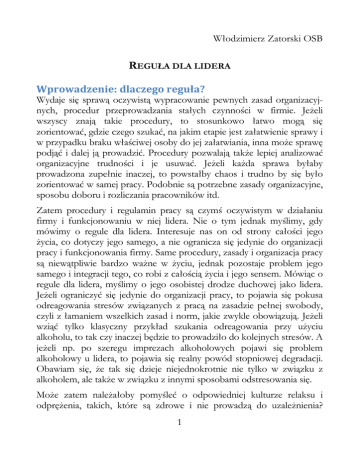 Włodzimierz Zatorski OSB REGUŁA DLA LIDERA Wprowadzenie: dlaczego reguła? Wydaje się sprawą oczywistą wypracowanie pewnych zasad organizacyjnych, procedur przeprowadzania stałych czynności w firmie. Jeżeli wszyscy znają takie procedury, to stosunkowo łatwo mogą się zorientować, gdzie czego szukać, na jakim etapie jest załatwienie sprawy i w przypadku braku właściwej osoby do jej załatwiania, inna może sprawę podjąć i dalej ją prowadzić. Procedury pozwalają także lepiej analizować organizacyjne trudności i je usuwać. Jeżeli każda sprawa byłaby prowadzona zupełnie inaczej, to powstałby chaos i trudno by się było zorientować w samej pracy. Podobnie są potrzebne zasady organizacyjne, sposobu doboru i rozliczania pracowników itd. Zatem procedury i regulamin pracy są czymś oczywistym w działaniu firmy i funkcjonowaniu w niej lidera. Nie o tym jednak myślimy, gdy mówimy o regule dla lidera. Interesuje nas on od strony całości jego życia, co dotyczy jego samego, a nie ogranicza się jedynie do organizacji pracy i funkcjonowania firmy. Same procedury, zasady i organizacja pracy są niewątpliwie bardzo ważne w życiu, jednak pozostaje problem jego samego i integracji tego, co robi z całością życia i jego sensem. Mówiąc o regule dla lidera, myślimy o jego osobistej drodze duchowej jako lidera. Jeżeli ograniczyć się jedynie do organizacji pracy, to pojawia się pokusa odreagowania stresów związanych z pracą na zasadzie pełnej swobody, czyli z łamaniem wszelkich zasad i norm, jakie zwykle obowiązują. Jeżeli wziąć tylko klasyczny przykład szukania odreagowania przy użyciu alkoholu, to tak czy inaczej będzie to prowadziło do kolejnych stresów. A jeżeli np. po szeregu imprezach alkoholowych pojawi się problem alkoholowy u lidera, to pojawia się realny powód stopniowej degradacji. Obawiam się, że tak się dzieje niejednokrotnie nie tylko w związku z alkoholem, ale także w związku z innymi sposobami odstresowania się. Może zatem należałoby pomyśleć o odpowiedniej kulturze relaksu i odprężenia, takich, które są zdrowe i nie prowadzą do uzależnienia? 1 Może warto by zatroszczyć się np. o rekreację przez sport lub metody relaksacyjne albo po prostu o dobrą higienę życia obejmującą kondycję psychiczną i fizyczną z uwzględnieniem także programu kulturalnego? Czy jest potrzeba jakiejś reguły i co by ona miała znaczyć? Jeżeli pozostaniemy jednak na poziomie właściwej higieny w wymiarze zdrowia fizycznego, uwzględnimy odpowiednią relaksację, odprężenie, a nawet właściwe zdrowe spędzanie wolnego czasu na rekreacji i karmieniu się kulturą, to jeszcze nie wystarczy. Człowiek bowiem nie żyje tylko po to, żeby sprawnie funkcjonować: dobrze pracować i właściwie odpoczywać. Może najbardziej dobitnie wypowiada to Kohelet, mędrzec Starego Testamentu, który wciela się w postać Salomona, króla znanego z wielkiej mądrości i ogromnego bogactwa, który posiadał kilkaset żon i nałożnic, który mógł na różne sposoby realizować pomysły na życie. Kohelet mówi o takich próbach w każdej dziedzinie, jednak za każdym razem wraca ostatecznie do formuły: „Marność nad marnościami, wszystko marność”. Okazuje się, że cokolwiek byśmy osiągnęli na ziemi, to i tak jest to marność. Nic z tego, co tutaj osiągamy, nam nie wystarczy w życiu. Jeżeli zatem ograniczymy się do troski o właściwą higienę życia, zdrowie, dobre relacje w firmie itd., czyli do tego, co sprowadza się jedynie do wymiaru horyzontalnego, ostatecznie dojdziemy do doświadczenia Koheletowej marności nad marnościami. Zasadniczy bowiem problem człowieka polega na głębi, jaką w sobie nosi, głębi, która nie pozwala mu uzyskać zaspokojenia w wymiarze horyzontalnym. Biblia już na początku wyraża tę głębię przez stwierdzenie, że jesteśmy stworzeni na obraz i podobieństwo Boga. Zatem nawet sprawne w sensie zdrowia i intelektualnych zdolności nasze funkcjonowanie nie jest w stanie dać nam poczucia osiągnięcia pełni. Najmocniej to się ujawnia w momencie, gdy zostaną nam odebrane zewnętrzne zaangażowania poprzez utratę pracy czy twórczej aktywności, utratę zdrowia lub odrzucenia przez bliskich czy środowisko, gdy pozostaje nam czas dany, w którym musimy się borykać z sobą samymi w chorobie, opuszczeniu, braku zdolności robienia tego, czego byśmy chcieli. Taka sytuacja pokazuje najdobitniej, że w życiu chodzi o coś więcej, że posiada ono jakiś sens odniesiony do czegoś, co 2 przekracza samo zaangażowanie doczesne, czyli wymiar horyzontalny. Pan Jezus wyraził to zdaniem: Cóż bowiem za korzyść odniesie człowiek, choćby cały świat zyskał, a na swej duszy szkodę poniósł? Albo co da człowiek w zamian za swoją duszę? (Mt 16,26). Takie słowa wypowiedział Pan Jezus do św. Piotra, gdy ten po wyznaniu, że Jezus jest Mesjaszem, starał się pocieszyć Jezusa, gdy ten zapowiedział swoją mękę i śmierć na krzyżu. Święty Piotr miał bardzo dobre intencje, był autentycznie zatroskany o Pana Jezusa, pragnął wypełnienia się „Bożej woli”, a oto w odpowiedzi usłyszał: Zejdź Mi z oczu, szatanie! Jesteś Mi zawadą, bo myślisz nie na sposób Boży, lecz na ludzki (Mt 16,23). Ta ostra odpowiedź wskazuje, jak zamknięcie się w myśleniu horyzontalnym prowadzi do tragedii. W naszym życiu chodzi o coś bardzo ważnego, co przekracza nasze wyobrażenia. Jeżeli zamykamy się w doczesności, kończy się to tragicznie, a śmiem twierdzić, że powoduje w nas niezdolność do bycia szczęśliwymi w życiu na co dzień. Właściwie można powiedzieć, że zamknięcie się w wymiarze horyzontalnym oznacza piekło. Kiedyś podjąłem pewną refleksję: pomyślałem sobie, że moje życie, które uważam zasadniczo za udane, nawet szczęśliwe, bo realizuję swoje powołanie, że to życie będzie trwało bez końca w czasie. Wtedy pojawiło się p