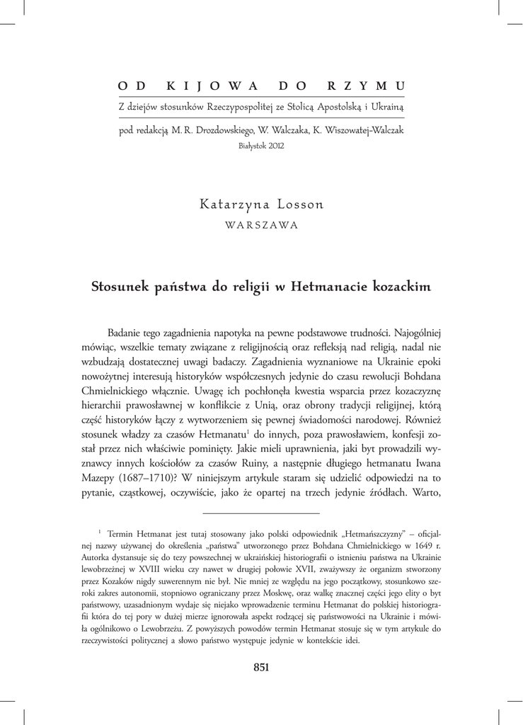 O d K i j o w a d o R z y m u Z dziejów stosunków Rzeczypospolitej ze Stolicą Apostolską i Ukrainą pod redakcją M. R. Drozdowskiego, W. Walczaka, K. Wiszowatej-Walczak Białystok 2012 Katarzyn a Lo sson Warszawa Stosunek państwa do religii w Hetmanacie kozackim Badanie tego zagadnienia napotyka na pewne podstawowe trudności. Najogólniej mówiąc, wszelkie tematy związane z religijnością oraz refleksją nad religią, nadal nie wzbudzają dostatecznej uwagi badaczy. Zagadnienia wyznaniowe na Ukrainie epoki nowożytnej interesują historyków współczesnych jedynie do czasu rewolucji Bohdana Chmielnickiego włącznie. Uwagę ich pochłonęła kwestia wsparcia przez kozaczyznę hierarchii prawosławnej w konflikcie z Unią, oraz obrony tradycji religijnej, którą część historyków łączy z wytworzeniem się pewnej świadomości narodowej. Również stosunek władzy za czasów Hetmanatu1 do innych, poza prawosławiem, konfesji został przez nich właściwie pominięty. Jakie mieli uprawnienia, jaki byt prowadzili wyznawcy innych kościołów za czasów Ruiny, a następnie długiego hetmanatu Iwana Mazepy (1687–1710)? W niniejszym artykule staram się udzielić odpowiedzi na to pytanie, cząstkowej, oczywiście, jako że opartej na trzech jedynie źródłach. Warto, 1 Termin Hetmanat jest tutaj stosowany jako polski odpowiednik „Hetmańszczyzny” – oficjalnej nazwy używanej do określenia „państwa” utworzonego przez Bohdana Chmielnickiego w 1649 r. Autorka dystansuje się do tezy powszechnej w ukraińskiej historiografii o istnieniu państwa na Ukrainie lewobrzeżnej w XVIII wieku czy nawet w drugiej połowie XVII, zważywszy że organizm stworzony przez Kozaków nigdy suwerennym nie był. Nie mniej ze względu na jego początkowy, stosunkowo szeroki zakres autonomii, stopniowo ograniczany przez Moskwę, oraz walkę znacznej części jego elity o byt państwowy, uzasadnionym wydaje się niejako wprowadzenie terminu Hetmanat do polskiej historiografii która do tej pory w dużej mierze ignorowała aspekt rodzącej się państwowości na Ukrainie i mówiła ogólnikowo o Lewobrzeżu. Z powyższych powodów termin Hetmanat stosuje się w tym artykule do rzeczywistości politycznej a słowo państwo występuje jedynie w kontekście idei. 851 Katarzyna Losson jak sądzę, uświadomić sobie, że kwestia ta jest tym ciekawsza dla polskiego badacza, iż reprezentanci elity kozackiej, którzy urodzili się na ziemiach jeszcze nie tak dawno należących do Rzeczypospolitej, siłą rzeczy musieli budować swe koncepcje społeczno -polityczne w oparciu o jedyną tradycję jaką de facto znali, z jaką mieli do czynienia w praktyce. Polską myśl znali tym dogłębniej iż wszyscy trzej byli absolwentami Akademii Kijowsko-Mohylańskiej, jak zresztą najznamienitsi reprezentanci ruskiej elity intelektualnej drugiej połowy XVII i pierwszej połowy XVIII wieku, która jeszcze w dokumentach szkolnych z lat 1734–1742 określana jest jako uczelnia „polsko-słowiańsko-łacińska”2. W prywatnych bibliotekach na terenie Hetmanatu w XVIII wieku pokaźne miejsce zajmowały prace polskich autorów, przede wszystkim siedemnastowieczne kaznodziejstwo3. Elita kozacka nie pozostawiła wielu dokumentów teoretycznych. Przedmiotem badanym jest spuścizna urzędników kancelarii hetmańskiej, przedstawicieli elity politycznej kierującej organizmem państwowym jakim był Hetmanat, członków starszyzny kozackiej. Mowa tutaj o kronikach Hryhoryja Hrabianki i Samuela Welyczki, a przede wszystkim o projekcie Konstytucji Filipa Orlika. Dwa pierwsze dzieła o charakterze historyczno-publicystycznym powstały na początku XVIII wieku, latopis Hrabianki w latach 1708–1709, Welyczki zaś około 1720 r.4 Wedle Walerija Szewczuka przypuszczać można iż powstały one na zamówienie państwowe5. Konstytucja Orlika zaś jest niezrealizowanym projektem politycznym zawierającym dość precyzyjną wizję państwa, dlatego będzie tu głównym obiektem zainteresowania. Więcej miejsca warto poświęcić postaci Hetmana. Filip Orlik całe życie walczył o niezależną Ukrainę6. Jego ogromną zasługą było rozpropagowanie w Europie idei niezależnej 2 A. Jabłonowski, Akademia Kijowsko-Mohylańska. Zarys historyczny na tle rozwoju ogólnego cywilizacji zachodniej na Rusi, Kraków 1899–1900, s. 60. 3 О. Дзюба, Приватні бібліотеки України XVII ст.: Власники та репертуарь зібрань, „Україна в Центрально–Східній Європі (з найдавніших часів до кінця XVIII ст.)”, вип 2, Київ 2002, s. 298–300. Pełna nazwa utworu Hryhoryja Hrabianki: 4 Дії превеликого і від початку поляків найкриваві- шого небувалого брану Богдана Хмельницького, гетьмана Запорозького, із поляками, за найясніших королів полських Владислава, потім і Казимира, який відправлявся в році 1648 і за літ десять після смерті Хмельницького не закінченого. З різних літописців і із діаріуша, на тій війні писаного, у місті Гадячу, пра- Tak figuruje u В. Шевчук, Муза Роксоланська, Київ 2005, s. 436. Najlepszym źródłem informacji na temat latopisów kozackich: В. Шевчук, Муза Роксоланська…, passim. 5 В. Шевчук, Козацька Держава. Етюді для історії українського державотворення, Київ 1995, s. 305. O życiorysach kancelistów: В. Шевчук, Муза Роксоланська…, s. 434–450; О. М. Апанович, Граб’янка Григорій цею Григорія Граб’янки зібрано 