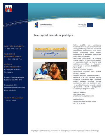 ‘? Rozwiązania informatyczne Nauczyciel zawodu w praktyce W A R TO Ś Ć P R O J E K T U : 1 753 172,13 PLN W YS O K O Ś Ć D O F I N A N S OW A N I A : 1 753 172,13 PLN ŹRÓDŁO D O F I N A N S OW A N I A : Europejski Fundusz S p o ł e c zn y Program Operacyjny Kapitał Ludzki na lata 2007-2013 Poddziałanie 3.4.3 Upowszechnienie uczenia się przez całe życie Celem projektu jest podniesienie kwalifikacji zawodowych oraz aktualizacja wiedzy praktycznej wśród 256 nauczycieli przedmiotów zawodowych i/lub instruktorów praktycznej nauki zawodu kształcących w kierunkach stosujących nowoczesne technologie. Nauczyciele uczestniczący w projekcie wezmą udział w 10-cio dniowych stażach w przedsiębiorstwach na terenie woj. zachodnio-pomorskiego i kujawskopomorskiego, w terminie 01.02.2012r. – 30.04.2014r. Działania w ramach projektu: opracowanie programu stażu, praktyk i 4 edycji szkoleń, organizacja staży w przedsiębiorstwach, ewaluacja - w celu zbadania efektów wdrażania programów staży i realizacji praktyk zostanie powołana komisja ewaluacyjna, która na podstawie wizyt w przedsiębiorstwach opracuje raport, opracowanie dwóch podręczników z wdrożonych programów staży. Więcej o projekcie: http://www.wsieprojekty.eu/nauczycielzawodu/ T E R MI N R E A L I Z A C J I : 2012 - 2014 Biuro Projektu : Wydział Rozwoju i Strategii Miasta tel.: 52 58 58 059 Projekt jest współfinansowany ze środków Unii Europejskiej w ramach Europejskiego Funduszu Społecznego