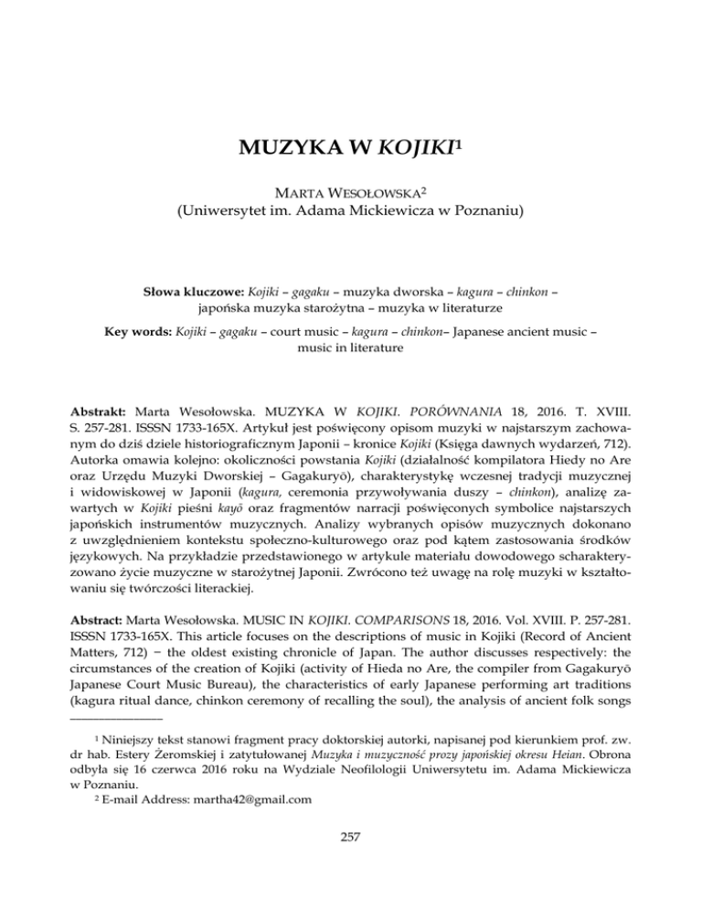 MUZYKA W KOJIKI1 MARTA WESOŁOWSKA2 (Uniwersytet im. Adama Mickiewicza w Poznaniu) Słowa kluczowe: Kojiki – gagaku – muzyka dworska – kagura – chinkon – japońska muzyka starożytna – muzyka w literaturze Key words: Kojiki – gagaku – court music – kagura – chinkon– Japanese ancient music – music in literature Abstrakt: Marta Wesołowska. MUZYKA W KOJIKI. PORÓWNANIA 18, 2016. T. XVIII. S. 257-281. ISSSN 1733-165X. Artykuł jest poświęcony opisom muzyki w najstarszym zachowanym do dziś dziele historiograficznym Japonii – kronice Kojiki (Księga dawnych wydarzeń, 712). Autorka omawia kolejno: okoliczności powstania Kojiki (działalność kompilatora Hiedy no Are oraz Urzędu Muzyki Dworskiej – Gagakuryō), charakterystykę wczesnej tradycji muzycznej i widowiskowej w Japonii (kagura, ceremonia przywoływania duszy – chinkon), analizę zawartych w Kojiki pieśni kayō oraz fragmentów narracji poświęconych symbolice najstarszych japońskich instrumentów muzycznych. Analizy wybranych opisów muzycznych dokonano z uwzględnieniem kontekstu społeczno-kulturowego oraz pod kątem zastosowania środków językowych. Na przykładzie przedstawionego w artykule materiału dowodowego scharakteryzowano życie muzyczne w starożytnej Japonii. Zwrócono też uwagę na rolę muzyki w kształtowaniu się twórczości literackiej. Abstract: Marta Wesołowska. MUSIC IN KOJIKI. COMPARISONS 18, 2016. Vol. XVIII. P. 257-281. ISSSN 1733-165X. This article focuses on the descriptions of music in Kojiki (Record of Ancient Matters, 712) − the oldest existing chronicle of Japan. The author discusses respectively: the circumstances of the creation of Kojiki (activity of Hieda no Are, the compiler from Gagakuryō Japanese Court Music Bureau), the characteristics of early Japanese performing art traditions (kagura ritual dance, chinkon ceremony of recalling the soul), the analysis of ancient folk songs ________________ 1 Niniejszy tekst stanowi fragment pracy doktorskiej autorki, napisanej pod kierunkiem prof. zw. dr hab. Estery Żeromskiej i zatytułowanej Muzyka i muzyczność prozy japońskiej okresu Heian. Obrona odbyła się 16 czerwca 2016 roku na Wydziale Neofilologii Uniwersytetu im. Adama Mickiewicza w Poznaniu. 2 E-mail Address: [email protected] 257 PORÓWNANIA 18, 2016 kayō and the symbolism of the oldest musical instruments. The analysis of the selected musical descriptions was carried out in regard to the socio-cultural context as well as the linguistic aspects. Based on the evidence material presented in this article, the author characterized the musical life of ancient Japan. Special attention was also paid to the role of music in shaping the literary work. Wiedza o prahistorycznych początkach muzyki japońskiej, pomimo wielu odkryć archeologicznych, wciąż pełna jest domysłów i niepotwierdzonych hipotez. Nigdy nie poznamy pierwszych kompozycji muzycznych, nie usłyszymy, jak brzmiały najstarsze cytry czy flety, ani jak śpiewano ówczesne pieśni ludowe. Dzięki jednak zachowanym do dziś cennym zabytkom literackim i wizualnym, możemy w znacznym stopniu wyobrazić sobie, jak wówczas wyglądało życie muzyczne – jakie było znaczenie muzyki w kulturze i obyczajach mieszkańców archipelagu. W tego rodzaju dociekaniach nieodzownym punktem odniesienia jest Kojiki (Księga dawnych wydarzeń, 712)3 – najstarsze zachowane do dziś dzieło historiograficzne, przedstawiające genealogię narodu japońskiego i losy jego władców. W kronice tej, oprócz wielu mitów, podań i legend, zawarte są liczne przykłady liryki melicznej kayō, czyli starożytnych pieśni ludowych, będących odzwierciedleniem silnego współoddziaływania muzyki i literatury w pierwszych wiekach naszej ery4. Kojiki jako dzieło literackie Redaktorem Kojiki5 był dworski urzędnik Ō no Yasumaro (?-723), który na rozkaz cesarzowej Gemmei (662-721, panowała 707-715)6 spisał i uporządkował wszyst________________ Zob.: W. Kotański. Kojiki czyli Księga dawnych wydarzeń. T. 1-2. Warszawa: Państwowy Instytut Wydawniczy, 1986. 4 W okresie powstania kroniki system pisma japońskiego nie był jeszcze w pełni rozwinięty, dlatego tekst kroniki został zapisany ideogramami chińskimi, które odczytywano po japońsku. Większość poematów i zaklęć zapisano natomiast manyōganą – systemem polegającym na wykorzystywaniu chińskich znaków dla rejestrowania wymowy japońskiej. 5 Niestety oryginalny tekst Kojiki nie zachował się do współczesności. Najstarszy odpis kroniki pochodzi z XIV wieku, a jego autorem był mnich buddyjski Ken’yū. Obawa przed utraceniem dzieła spowodowała, że z czasem powstawało coraz więcej reprodukcji kroniki – najpierw w formie rękopisu, a od 1644 roku w wersji drukowanej. W historii literatury japońskiej najtrwalej zapisały się trzy teksty Kojiki: Kan’ei kojiki (Kojiki z ery Kan’ei, 1678) opracowany i opatrzony komentarzem przez Watarai Nobuyoshiego, Kojiki-den (Komentowane Kojiki, 1798) autorstwa Motooriego Norinagi oraz Taisei kokun kojiki (Ustalony kanonicznie ze starą wymową tekst Kojiki, 1803). Stosunkowo wcześnie, w 1882 3 258 Marta Wesołowska, Muzyka w Kojiki kie podania i legendy zapamiętane przez obdarzoną niezwykłą pamięcią kapłankę Hieda no Are7 wywodzącą się najprawdopodobniej z klanu Sarume (małpie kobiety) pełniącym na dworze funkcje związane z muzyką, tańcem i śpiewem. Klan Sarume opierał swoją działalność na duchowym przewodnictwie i wzmocnieniu rodu cesarskiego. Sprawując więc troskliwą pieczę nad obrzędowymi tańcami kagura (muzyka bogów, rozrywka bogów) podczas ceremonii przywoływania duszy (jap. chinkon8; Kotański 1986: 12). Kronika Kojiki składa się z trzech zwojów. W pierwszym z nich, opatrzonym chińską przedmową, opisano stworzenie Japonii przez bóstwa nieba (Izanagiego i Izanami), a następnie dzieje ich potomstwa, zwłaszcza centralnej postaci w panteonie sinto