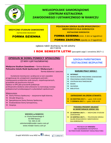 WIELKOPOLSKIE SAMORZĄDOWE CENTRUM KSZTAŁCENIA ZAWODOWEGO I USTAWICZNEGO W RAWICZU MEDYCZNE STUDIUM ZAWODOWE POLICEALNA SZKOŁA SŁUŻB SPOŁECZNYCH I MEDYCZNYCH DLA DOROSŁYCH KSZTAŁCENIE MŁODZIEŻY KSZTAŁCENIE DOROSŁYCH FORMA DZIENNA FORMA DZIENNA (min. 3 dni w tygodniu) FORMA ZAOCZNA (zjazdy co 2 tygodnie) ogłasza nabór słuchaczy na rok szkolny 2017/2018 I ROK SEMESTR LETNI (początek zajęć 1 września 2017 r.) OPIEKUN W DOMU POMOCY SPOŁECZNEJ (2-letni cykl kształcenia) Medyczne Studium Zawodowe – forma dzienna Policealna Szkoła Służb Społecznych i Medycznych – forma dzienna i zaoczna Kształcenie teoretyczne i praktyczne w tym zawodzie przygotowuje do umiejętności zaspokajania potrzeb i rozwiązywania problemów osób starych, niepełnosprawnych, przewlekle lub psychicznie chorych. Opiekun w DPS jako pracownik podejmuje profesjonalne działania ukierunkowane na stymulację rozwoju podopiecznych przebywających w placówkach opiekuńczych. Miejsca pracy: Domy Pomocy Społecznej – stacjonarne bądź dzienne, Ośrodki Wsparcia, Specjalistyczne Domy Pomocy Społecznej, Środowiskowe Domy Samopomocy, Hospicja. WSCKZiU w RAWICZU ul. Grota Roweckiego 6 63-900 Rawicz Tel. 545 21 20 [email protected] www.medyk-rawicz.com.pl Znajdź WSCKZiU oraz MSZ na i kliknij SZKOŁA PAŃSTWOWA KSZTAŁCENIE BEZPŁATNE WARUNKI PRACY SZKOŁY: INTERNAT NOWOCZESNE PRACOWNIE ZAWODOWE PRACOWNIA KOMPUTEROWA CENTRUM MULTIMEDIALNE BASEN SIŁOWNIA BIBLIOTEKA ZAPRASZAMY NA DRZWI OTWARTE: 26 KWIETNIA 2017 r. – godz. 9.00-14.00 7 CZERWCA 2017 r. – godz. 9.00-14.00 PODANIA PROSIMY SKŁADAĆ W SEKRETARIACIE SZKOŁY DO: 23 SIERPNIA 2017 r. – MEDYCZNE STUDIUM ZAWODOWE 23 SIERPNIA 2017 r. – POLICEALNA SZKOŁA SŁUŻB SPOŁECZNYCH I MEDYCZNYCH DLA DOROSŁYCH PRZYJĘCIA DO WSCKZiU BEZ EGZAMINÓW WSTĘPNYCH NA PODSTAWIE ROZMOWY KWALIFIKACYJNEJ