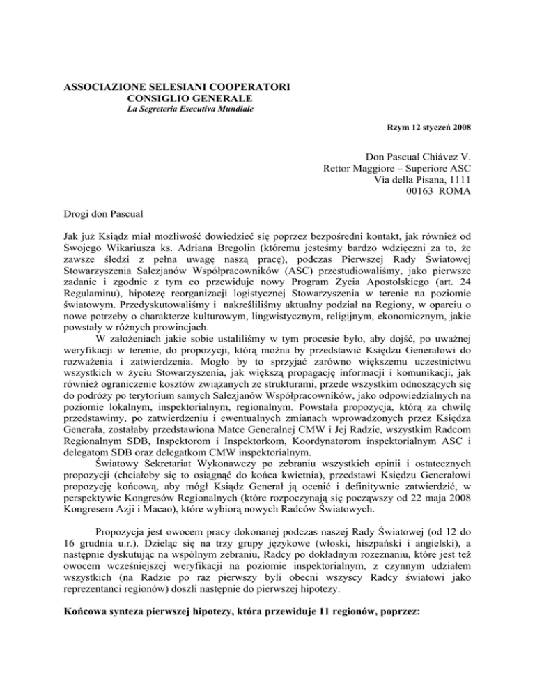 ASSOCIAZIONE SELESIANI COOPERATORI CONSIGLIO GENERALE La Segreteria Esecutiva Mundiale Rzym 12 styczeń 2008 Don Pascual Chiávez V. Rettor Maggiore – Superiore ASC Via della Pisana, 1111 00163 ROMA Drogi don Pascual Jak już Ksiądz miał możliwość dowiedzieć się poprzez bezpośredni kontakt, jak również od Swojego Wikariusza ks. Adriana Bregolin (któremu jesteśmy bardzo wdzięczni za to, że zawsze śledzi z pełna uwagę naszą pracę), podczas Pierwszej Rady Światowej Stowarzyszenia Salezjanów Współpracowników (ASC) przestudiowaliśmy, jako pierwsze zadanie i zgodnie z tym co przewiduje nowy Program Życia Apostolskiego (art. 24 Regulaminu), hipotezę reorganizacji logistycznej Stowarzyszenia w terenie na poziomie światowym. Przedyskutowaliśmy i nakreśliliśmy aktualny podział na Regiony, w oparciu o nowe potrzeby o charakterze kulturowym, lingwistycznym, religijnym, ekonomicznym, jakie powstały w różnych prowincjach. W założeniach jakie sobie ustaliliśmy w tym procesie było, aby dojść, po uważnej weryfikacji w terenie, do propozycji, którą można by przedstawić Księdzu Generałowi do rozważenia i zatwierdzenia. Mogło by to sprzyjać zarówno większemu uczestnictwu wszystkich w życiu Stowarzyszenia, jak większą propagację informacji i komunikacji, jak również ograniczenie kosztów związanych ze strukturami, przede wszystkim odnoszących się do podróży po terytorium samych Salezjanów Współpracowników, jako odpowiedzialnych na poziomie lokalnym, inspektorialnym, regionalnym. Powstała propozycja, którą za chwilę przedstawimy, po zatwierdzeniu i ewentualnych zmianach wprowadzonych przez Księdza Generała, zostałaby przedstawiona Matce Generalnej CMW i Jej Radzie, wszystkim Radcom Regionalnym SDB, Inspektorom i Inspektorkom, Koordynatorom inspektorialnym ASC i delegatom SDB oraz delegatkom CMW inspektorialnym. Światowy Sekretariat Wykonawczy po zebraniu wszystkich opinii i ostatecznych propozycji (chciałoby się to osiągnąć do końca kwietnia), przedstawi Księdzu Generałowi propozycję końcową, aby mógł Ksiądz Generał ją ocenić i definitywnie zatwierdzić, w perspektywie Kongresów Regionalnych (które rozpoczynają się począwszy od 22 maja 2008 Kongresem Azji i Macao), które wybiorą nowych Radców Światowych. Propozycja jest owocem pracy dokonanej podczas naszej Rady Światowej (od 12 do 16 grudnia u.r.). Dzieląc się na trzy grupy językowe (włoski, hiszpański i angielski), a następnie dyskutując na wspólnym zebraniu, Radcy po dokładnym rozeznaniu, które jest też owocem wcześniejszej weryfikacji na poziomie inspektorialnym, z czynnym udziałem wszystkich (na Radzie po raz pierwszy byli obecni wszyscy Radcy światowi jako reprezentanci regionów) doszli następnie do pierwszej hipotezy. Końcowa synteza pierwszej hipotezy, która przewiduje 11 regionów, poprzez: - potwierdzenie 6 poprzednich Regionów (Itamor, India, Brasile, Asia, Ameryka Sur, Pacifico Caribe Sur) - zawieszenie jednego Regionu (Anglojęzycznego), - zorganizowanie 5 Regionów Region Iberio – Lusitana: Hiszpania i Portugalia Region Europa Centralna - Est: Słowenia, Chorwacja, Czechy, Słowacja, Polka, Węgry, Ukraina, Austria, Okręg Wschodni; Region Europa Centralna – Nord: Belgia, Holandia, Niemcy, Zjednoczone Królestwo, Irlandia; Region Amerika Pacifico – Caribe Nord: podzielony na dwie części: języka angielskiego (USA z kultura angielskojęzyczną, Knada); języka hiszpańskiego (USA z kulturą języka hiszpańskiego, Ameryka Centralna, Haiti, Antille, Mexico) Region Africa e Madagaskar: podzielony na 5 części geograficznych Region Italia, Medio Oriente i Malta – nie przewiduje się zmian Region Indie – nie przewiduje się zmian, ale tylko podział na dwie „strefy” geograficzne Region Brasile - nie przewiduje się zmian Region Australia – Azja Est – bez zmian Region America Cono Sud – bez zmian Region Pacifico – Caribe Sud – bez zmian Pozostając w oczekiwaniu na wskazania Księdza Generała, aby móc dalej przekazać innym osobom wyżej wskazanym i zainteresowanym procesem rozeznania, w imieniu całej Rady światowej ASC składam jak najserdeczniejsze życzenia z okazji przyszłej Kapituły Generalnej. Jego Rosario Maiorano