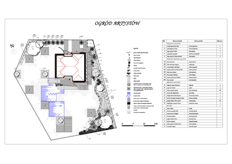 OGRÓD ARTYSTÓW B/5 0,3m 5A 5 6A/1 2m 6A/2 2m 6A/3 2m 6A/4 2m 6A/5 NR. s B/10 0,3m N 7A 3 Legenda: H E granica działki, ogrodzenie ogrodu 8A dojście do domu h E g drzewa, krzewy iglaste żywopłot wysoki strzyżony 1/1 G rośliny wodne rośliny cieniolubne g f byliny niskie byliny 4A/1 4A/2 4A/3 Catalpa bignonioides 'Nana' Surmia bignoniowa 2 2 Salix babylonica 'Crispa' Wierzba babilońska 1 3 Fagus sylvatica 'Zlatia' Buk pospolity 1 4 Liguidambar styraciflua Ambrowiec amerykański 1 5 Fagus sylvatica 'Purpurea Pendula' Buk pospolity 1 c d W W B/19 0,3m W Świerk Brewera 1 2A Abies lasiocarpa 'Compacta' Jodła górska 1 3A Larix kaempferi 'Stiff Weeper' Modrzew japoński 1 4A Juniperus pfizeriana 'Blue and Gold' Jałowiec pośredni 3 5A Abies procera 'Glauca' Jodła szlachetna 1 6A Picea pungens 'Białobok' Świerk kłujący 5 7A Juniperus pfizeriana 'Old Gold' Jałowiec pośredni 1 Picea orientalis Świerk kaukaski 1 Magnolia 1 A Ligustrum 'Vicaryi' Ligustr C Ulmus parvifolia 'Geisha' Wiąz drobnolistny zbiornik wodny D Cornus alba 'Elegantissima' Dereń biały 1 1 kaskada wodna E Weigela florida 'Nana Purpurea' Krzewuszka cudowna powierzchnia z kostki brukowej F Berberis thunbergii 'Atropurpurea Nana' Berberys thunberga powierzchnia z płytek terakotowych G Syringa Vulgaris 'Mme Lemoine' Lilak pospolity opaska z kamieni potokowych wokół domu H Philadelphus coronarius 'Aureus' Jaśminowiec wonny powierzchnia z belek drewnianych 2A a trawnik 2 e E/2 E/1 E/7 E/6 E/5 E/4 E/3 s B/6 0,3m 4 0 C e 1A 3A śmietniki, pom. gospodarcze F/55 0,4m 5 10 15m 1 40 7 55 1 1 BYLINY tarasy z desek drewnianych - pomosty nad wodą D Magnolia 'George Henry Kern' B kwadratowe place z nawierzchnią żwirową, akcent stanowi rzeźba - ekspozycja wykonana przez gospodarzy domu b Picea breweriana KRZEWY LIŚCIASTE kwadratowe place z nawierzchnią z kory, akcent stanowi drzewo o kulistej koronie E E 1A 8A byliny wysokie 1/2 a E Ilość szt. DRZEWA, KRZEWY IGLASTE drzewa liściaste krzewy E Nazwa polska 1 wjazd do garażu f A Nazwa łacińska DRZEWA LIŚCIASTE Hosta 'Stiletto' Funkia b Dicentra spectabilis 'Alba' Serduszka okazała c Sedum spurium 'Fuldaglut' Rozchodnik kaukaski d Dianthus plumarius Goździk pierzasty e Sagina subulata 'Aurea' Karmnik ościsty f Asarum europaeum Kopytnik pospolity g Spiraea japonica 'Golden Princess' Tawuła japońska h Convallaria majalis Konwalia majowa