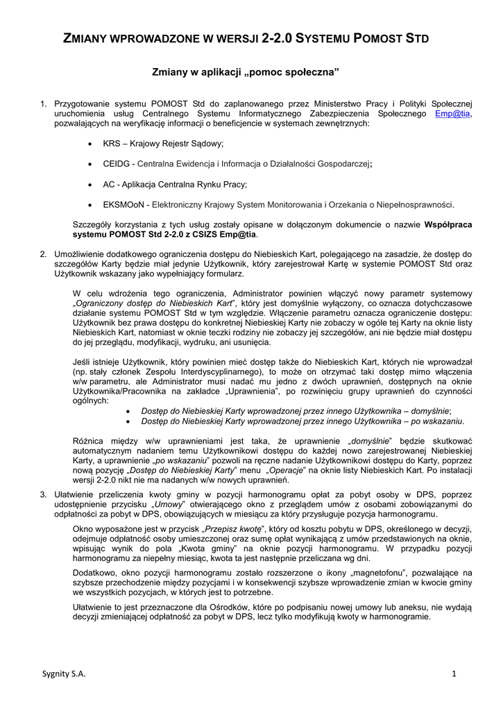 ZMIANY WPROWADZONE W WERSJI 2-2.0 SYSTEMU POMOST STD Zmiany w aplikacji „pomoc społeczna” 1. Przygotowanie systemu POMOST Std do zaplanowanego przez Ministerstwo Pracy i Polityki Społecznej uruchomienia usług Centralnego Systemu Informatycznego Zabezpieczenia Społecznego Emp@tia, pozwalających na weryfikację informacji o beneficjencie w systemach zewnętrznych: KRS – Krajowy Rejestr Sądowy; CEIDG - Centralna Ewidencja i Informacja o Działalności Gospodarczej; AC - Aplikacja Centralna Rynku Pracy; EKSMOoN - Elektroniczny Krajowy System Monitorowania i Orzekania o Niepełnosprawności. Szczegóły korzystania z tych usług zostały opisane w dołączonym dokumencie o nazwie Współpraca systemu POMOST Std 2-2.0 z CSIZS Emp@tia. 2. Umożliwienie dodatkowego ograniczenia dostępu do Niebieskich Kart, polegającego na zasadzie, że dostęp do szczegółów Karty będzie miał jedynie Użytkownik, który zarejestrował Kartę w systemie POMOST Std oraz Użytkownik wskazany jako wypełniający formularz. W celu wdrożenia tego ograniczenia, Administrator powinien włączyć nowy parametr systemowy „Ograniczony dostęp do Niebieskich Kart”, który jest domyślnie wyłączony, co oznacza dotychczasowe działanie systemu POMOST Std w tym względzie. Włączenie parametru oznacza ograniczenie dostępu: Użytkownik bez prawa dostępu do konkretnej Niebieskiej Karty nie zobaczy w ogóle tej Karty na oknie listy Niebieskich Kart, natomiast w oknie teczki rodziny nie zobaczy jej szczegółów, ani nie będzie miał dostępu do jej przeglądu, modyfikacji, wydruku, ani usunięcia. Jeśli istnieje Użytkownik, który powinien mieć dostęp także do Niebieskich Kart, których nie wprowadzał (np. stały członek Zespołu Interdyscyplinarnego), to może on otrzymać taki dostęp mimo włączenia w/w parametru, ale Administrator musi nadać mu jedno z dwóch uprawnień, dostępnych na oknie Użytkownika/Pracownika na zakładce „Uprawnienia”, po rozwinięciu grupy uprawnień do czynności ogólnych: Dostęp do Niebieskiej Karty wprowadzonej przez innego Użytkownika – domyślnie; Dostęp do Niebieskiej Karty wprowadzonej przez innego Użytkownika – po wskazaniu. Różnica między w/w uprawnieniami jest taka, że uprawnienie „domyślnie” będzie skutkować automatycznym nadaniem temu Użytkownikowi dostępu do każdej nowo zarejestrowanej Niebieskiej Karty, a uprawnienie „po wskazaniu” pozwoli na ręczne nadanie Użytkownikowi dostępu do Karty, poprzez nową pozycję „Dostęp do Niebieskiej Karty” menu „Operacje” na oknie listy Niebieskich Kart. Po instalacji wersji 2-2.0 nikt nie ma nadanych w/w nowych uprawnień. 3. Ułatwienie przeliczenia kwoty gminy w pozycji harmonogramu opłat za pobyt osoby w DPS, poprzez udostępnienie przycisku „Umowy” otwierającego okno z przeglądem umów z osobami zobowiązanymi do odpłatności za pobyt w DPS, obowiązujących w miesiącu za który przysługuje pozycja harmonogramu. Okno wyposażone jest w przycisk „Przepisz kwotę”, który od kosztu pobytu w DPS, określonego w decyzji, odejmuje odpłatność osoby umieszczonej oraz sumę opłat wynikającą z umów przedstawionych na oknie, wpisując wynik do pola „Kwota gminy” na oknie pozycji harmonogramu. W przypadku pozycji harmonogramu za niepełny miesiąc, kwota ta jest następnie przeliczana wg dni. Dodatkowo, okno pozycji harmonogramu zostało rozszerzone o ikony „magnetofonu”, pozwalające na szybsze przechodzenie między pozycjami i w konsekwencji szybsze wprowadzenie zmian w kwocie gminy we wszystkich pozycjach, w których jest to potrzebne. Ułatwienie to jest przeznaczone dla Ośrodków, które po podpisaniu nowej umowy lub aneksu, nie wydają decyzji zmieniającej odpłatność za pobyt w DPS, lecz tylko modyfikują kwoty w harmonogramie. Sygnity S.A. 1 Zmiany w aplikacji „piecza zastępcza” 1. W szablonie wydruku list wypłat dodanie kolumny „Kwota środków powiatu”, drukującej kwotę przeznaczoną ze środków powiatu na opiekę i wychowanie dziecka. Kwota ta uwzględniana jest również w dodatkach „Podsumowanie rodzajów świadczeń”, dotyczących podziału środków na opiekę i wychowania dziecka. 2. Dodanie parametru "Ostrzeżenie o braku IPU", określającego czy system ma ostrzegać o braku indywidualnego programu usamodzielnienia podczas wydawania decyzji przyznającej pomoc na usamodzielnienie lub kontynuowanie nauki. Parametr domyślnie ustawiony na „Tak”. 3. Dodanie parametru „Data parametrów w rozliczeniach rodzinnej pieczy zastępczej”, określającego na który dzień mają być pobierane wartości parametrów: 'Procent Składki Na Ubezp Emeryt', 'Procent Składki Rent Dla Ubezp', 'Procent Składki Na Ubezp Rentowe', 'Procent Składki Wypadkowej', 'Procent Składki Chorobowej', 'Procent Składki na Fundusz Pracy', 'Procent Składki Na FUZ', 'Procent Zaliczki Na Podatek Doch', 'Procent Składki FUZ Odliczanej', 'Podstawa' w rozliczaniach rodzinnej pieczy zastępczej. Parametr może przyjmować wartości: 0 - do momentu rozliczenia wartości ww. parametrów będą pobierane na datę dokumentu (jeśli jej brak, to na datę bieżącą), podczas rozliczania na datę rozliczenia, 1 - wartości ww. parametrów będą pobierane na datę początku okresu rozliczenia. Domyślnie parametr jest ustawiony na "0". Pozostałe ważne informacje o wersji 2-2.0 1. Istniejąca wcześniej funkcjonalność usuwania duplikacji ulic, dostępna dotąd pod przyciskiem „Ulice” na oknie danych miejscowości, została przeniesiona do drzewka funkcji na głównym oknie systemu POMOST Std w roli Administratora i jest dostępna po rozwinięciu grupy funkcji „Pakiet narzędziowy”, jako nowa pozycja „Usuwanie duplikatów ulic”. Przeniesienie jest związane z optymalizacją procesu usuwania duplikacji ulic. 2. Istniejąca wcześniej funkcjonalność usuwania duplikacji osób, została dostosowana do poprawnego obsłużenia przypadków