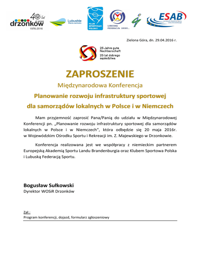 Zielona Góra, dn. 29.04.2016 r. Międzynarodowa Konferencja Planowanie rozwoju infrastruktury sportowej dla samorządów lokalnych w Polsce i w Niemczech Mam przyjemność zaprosić Pana/Panią do udziału w Międzynarodowej Konferencji pn. „Planowanie rozwoju infrastruktury sportowej dla samorządów lokalnych w Polsce i w Niemczech“, która odbędzie się 20 maja 2016r. w Wojewódzkim Ośrodku Sportu i Rekreacji im. Z. Majewskiego w Drzonkowie. Konferencja realizowana jest we współpracy z niemieckim partnerem Europejską Akademią Sportu Landu Brandenburgia oraz Klubem Sportowa Polska i Lubuską Federacją Sportu. Bogusław Sułkowski Dyrektor WOSiR Drzonków Zał.: Program konferencji, dojazd, formularz zgłoszeniowy Międzynarodowa Konferencja „Planowanie rozwoju infrastruktury sportowej dla samorządów lokalnych w Polsce i w Niemczech” Godz. 9.30 10.00 Temat Akredytacja Powitanie i otwarcie konferencji 10.10 1. Planowanie rozwoju infrastruktury sportowej w Polsce - pytania do wykładowcy - 11.00 Planowanie rozwoju infrastruktury sportowej w Niemczech 2. Podstawy teoretyczne Wprowadzenie i praktyczne doświadczenia w planowaniu rozwoju infrastruktury sportowej w Brandenburgii - pytania do wykładowcy 3. Przykłady dobrych praktyk 3.1 Przyszłościowe planowanie boisk sportowych na przykładzie miejscowości/ kompleksu sportowego Zossen w Brandenburgii - pytania do wykładowcy 3.2 Nowoczesne planowanie zagospodarowania powierzchni sportowej, rekreacyjnej i ruchowej na przykładzie Zielonej Strefy w berlińskiej dzielnicy MarzahnHellersdorf - pytania do wykładowcy 3.3 Doświadczenia z wdrażania planu rozwoju infrastruktury sportowej w stolicy Landu Brandenburgia Poczdamie - pytania do wykładowcy - 12.50 3.4 Praktyczna realizacja planu rozwoju infrastruktury sportowej w brandenburskim powiecie Havelland - pytania do wykładowcy Podsumowanie i zakończenie konferencji Wykładowca Boguslaw Sułkowski Dyrektor WOSiR Drzonków Piotr Bubela Wykładowca Uczelni Łazarskiego/ Zarządzanie infrastrukturą sportową/ Prezes Instytutu Rozwoju Infrastruktury Sportowej Prof. dr Jürgen Rode Prof. Wyższej Szkoły Sportu i Zarządzania w Poczdamie ESAB / Przewodniczący Instytutu Komunalnego Planowania Rozwoju Infrastruktury Sportu (INSPO) Wolf Ahner Członek Międzynarodowego Stowarzyszenia Obiektów Sportowych i Rekreacyjnych (IAKS) oraz Instytutu Komunalnego Planowania Rozwoju Infrastruktury Sportu (INSPO) Torsten Gessner Kierownik ds. Sportu w Wydziale Edukacji i Sportu /Stolica Brandenburgii Poczdam Eckhard Wilke Specjalista w wydziale Sportu i Turystyki Powiatu Havelland Manfred Wothe Prezes Europejskiej Akademii Sportu Landu Brandenburgia (ESAB) Udział w konferencji jest bezpłatny. Każdy ze zgłoszonych uczestników otrzyma materiały konferencyjne oraz zaświadczenie o uczestnictwie w konferencji. Dojazd WOSiR Drzonków Drzonków-Olimpijska 20 66-004 Zielona Góra POLEN Tel. +48 68 321 43 69 Web: www.drzonkow.pl Sala konferencyjno-sportowa Formularz zgłoszeniowy WOSiR Drzonków Informację zwrotną prosimy nadsyłać elektronicznie do 13.05.2016 - e-mail: [email protected] Wydarzenie: Międzynarodowa Konferencja „Planowanie rozwoju infrastruktury sportowej dla samorządów lokalnych w Polsce i w Niemczech” Termin: 20.05.2016 Imię, nazwisko: Organizacja: ................................................................................................................................. Dane kontaktowe (nr kontaktowy i adres mailowy): ................................................................................................................................ Tak, wezmę udział w konferencji w WOSiR Drzonków dn. 20.5.2016. ................................................................................................................................. Nie, niestety nie mogę wziąć udziału w konferencji w WOSiR Drzonków dn. 20.5.2016. Osoba do kontaktu: Marta Tuliszka [email protected] tel. 512 170 518 Czekamy na Państwa w Drzonkowie!