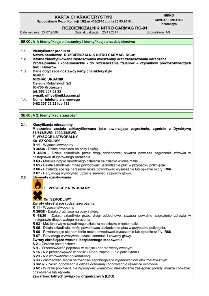 MIKKO MICHAŁ URBANIK Krotoszyn KARTA CHARAKTERYSTYKI Na podstawie Rozp. Komisji (UE) nr 453/2010 z dnia 20.05.2010r. ROZCIEŃCZALNIK NITRO CARMAG RC-01 Data wydania: 27.07.2009 Data aktualizacji: 25.11.2011 Strona/stron: 1/9 SEKCJA 1: Identyfikacja mieszaniny i identyfikacja przedsiębiorstwa 1.1. 1.2. 1.3. 1.4. Identyfikator produktu Nazwa handlowa: ROZCIEŃCZALNIK NITRO CARMAG RC-01 Istotne zidentyfikowane zastosowania mieszaniny oraz zastosowania odradzane Profesjonalne i konsumenckie - do rozcieńczania ftalanów – czynników powłokotwórczych farb i lakierów. Dane dotyczące dostawcy karty charakterystyki MIKKO MICHAŁ URBANIK Osiedle Robińskich 2/2 63-700 Krotoszyn tel. 062 307 02 22 e-mail: [email protected] Numer telefonu alarmowego 0-62 307 02 22 lub 112 SEKCJA 2: Identyfikacja zagrożeń 2.1. 2.2. Klasyfikacja mieszaniny Mieszanina została zaklasyfikowana jako stwarzająca zagrożenie, zgodnie z Dyrektywą 67/548/EWG, 1999/45/EWG F WYSOCE ŁATWOPALNY Xn SZKODLIWY R 11 - Wysoce łatwopalny. R 36/38 - Działa drażniąco na oczy i skórę. R 48/20 - Działa szkodliwie przez drogi oddechowe; stwarza poważne zagrożenie zdrowia w następstwie długotrwałego narażenia. R 63 - Możliwe ryzyko szkodliwego działania na dziecko w łonie matki. R 65 - Działa szkodliwie; może powodować uszkodzenie płuc w przypadku połknięcia. R 66 - Powtarzające się narażenie może powodować wysuszenie lub pękanie skóry. R66 R 67 - Pary mogą wywoływać uczucie senności i zawroty głowy. Elementy oznakowania F WYSOCE ŁATWOPALNY Xn SZKODLIWY Zwroty określające rodzaj zagrożenia R 11 - Wysoce łatwopalny. R 36/38 - Działa drażniąco na oczy i skórę. R 48/20 - Działa szkodliwie przez drogi oddechowe; stwarza poważne zagrożenie zdrowia w następstwie długotrwałego narażenia. R 63 - Możliwe ryzyko szkodliwego działania na dziecko w łonie matki. R 65 - Działa szkodliwie; może powodować uszkodzenie płuc w przypadku połknięcia. R 66 - Powtarzające się narażenie może powodować wysuszenie lub pękanie skóry. R66 R 67 - Pary mogą wywoływać uczucie senności i zawroty głowy. Zwroty określające warunki bezpiecznego stosowania S 2 – Chronić przed dziećmi. S 9 - Przechowywać pojemnik w miejscu dobrze wentylowanym. S 16 - Nie przechowywać w pobliżu źródeł zapłonu - nie palić tytoniu. S 29 - Nie wprowadzać do kanalizacji. S 33 - Zastosować środki ostrożności zapobiegające wyładowaniom elektrostatycznym. S 36/37 - Nosić odpowiednią odzież ochronną i odpowiednie rękawice ochronne. S 62 - W razie połknięcia nie wywoływać wymiotów: niezwłocznie zasięgnąć porady lekarza i pokazać opakowanie lub etykietę. Zawartość lotnych związków organicznych (LZO) MIKKO MICHAŁ URBANIK Krotoszyn KARTA CHARAKTERYSTYKI Na podstawie Rozp. Komisji (UE) nr 453/2010 z dnia 20.05.2010r. ROZCIEŃCZALNIK NITRO CARMAG RC-01 Data wydania: 27.07.2009 2.3. Data aktualizacji: 25.11.2011 Strona/stron: 2/9 99,8 % obj. Mieszanina zawiera toluen (WE: 203-625-9) Inne zagrożenia Brak SEKCJA 3: Skład/informacja o składnikach 3.2. Mieszanina Charakter chemiczny: mieszanina związków organicznych. Klasyfikacja Nazwa substancji Identyfikator 67/548/EWG toluen aceton octan butylu Nr CAS 108-88-3 Nr WE 203-625-9 Nr Ind. 601-021-00-3 Nr rejestr. * F, Xn R 11-38-48/2051/53-63-6567 Nr CAS 67-64-1 Nr WE 200-662-2 Nr Ind. 606-001-00-8 Nr rejestr. * Nr CAS 123-86-4 Nr WE 204-658-1 Nr Ind. 607-025-00-1 Nr rejestr. * F, Xi R 11-36-66-67 --R 10-66-67 Klasyfikacja 1272/2008 % wag Flam. Liq. 2 H225 Skin Irrit. 2 H315 STOT RE 2 H373 Repr. Cat. 3 H361d Asp. Tox. 1 H304 STOT SE 3 H336 Flam. Liq. 2 H225 Eye Irrit. 2 H319 STOT SE 3 H336 45,0 < - < 70,0 Flam. Liq. 3 H226 STOT SE 3 H336 EUH066 1,0 < - < 5,0 15,0 < - < 35,0 Objaśnienie: T+= bardzo toksyczny, T= toksyczny, C= żrący, Xn= szkodliwy, Xi= drażniący, E= wybuchowy, O= utleniający, F += skrajnie łatwopalny, F= wysoce łatwopalny, N= niebezpieczny dla środowiska *Pełne znaczenie zwrotów zagrożenia R i H ujęto w punkcie 16 Wymienione substancje nie posiadają w chwili obecnej numeru rejestracyjnego, ponieważ podlegają przepisom okresu przejściowego zgodnie z rozporządzeniem REACH. Numer rejestracyjny zostanie oficjalnie ogłoszony przez EChA SEKCJA 4: Środki pierwszej pomocy 4.1. 4.2. 4.3. Opis środków pierwszej pomocy Drogi narażenia: drogi oddechowe, drogi pokarmowe, kontakt ze skórą, kontakt z oczami. Następstwa wdychania: Ułożyć poszkodowaną osobę w pozycji leżącej. W przypadku wystąpienia takiej potrzeby zapewnić pomoc lekarską. Następstwa połknięcia: Przepłukać usta. Podać 1-2 szklanki wody do wypicia. U osoby przytomnej wywołać wymioty lub wykonać płukanie żołądka. Zapewnić spokój, leżenie i ciepło. W razie potrzeby zapewnić pomoc lekarską. Kontakt z oczami: Wyjąć szkła kontaktowe. Przemyć zanieczyszczone oczy większą ilością letniej wody przez 15 minut, przy wywiniętych powiekach W przypadku konieczności zapewnić pomoc okulisty. Kontakt ze skórą: Zdjąć zanieczyszczone ubranie. Oczyścić mechanicznie zanieczyszczoną skórę, przemyć dużą ilością wody a następnie wodą z łagodnym mydłem. W przypadku takiej potrzeby zasięgnąć porady dermatologa. Najważniejsze ostre i opóźnione objawy oraz skutki narażenia Nie są znane. Wskazania dotyczące wszelkiej natychmiastowej pomocy lekarskiej i szczególnego postępowania z poszkodowanym W miejscu pracy powinny być dostępne środki umożliwiające specjalistyczną i natychmiastową pomoc. Osoby udzielające pierwszej pomocy powinny posiadać rękawiczki medyczne. MIKKO MICHAŁ URBANIK Krotoszyn KARTA CHARAKTERYSTYKI Na podstawie Rozp. Komisji (UE) nr 453/2010 z dnia 20.05.2010r. ROZCIEŃCZALNIK NITRO CARMAG RC-01 Data wydania: 27.07.2009 Data aktualizacji: 25.11.2011 Strona/stron: 3/9 SEKCJA 5: Postępowanie w przypadku pożaru 5.1. 5.2. 5.3. Środki gaśnicze Odpowiednie środki gaśnicze do gasz