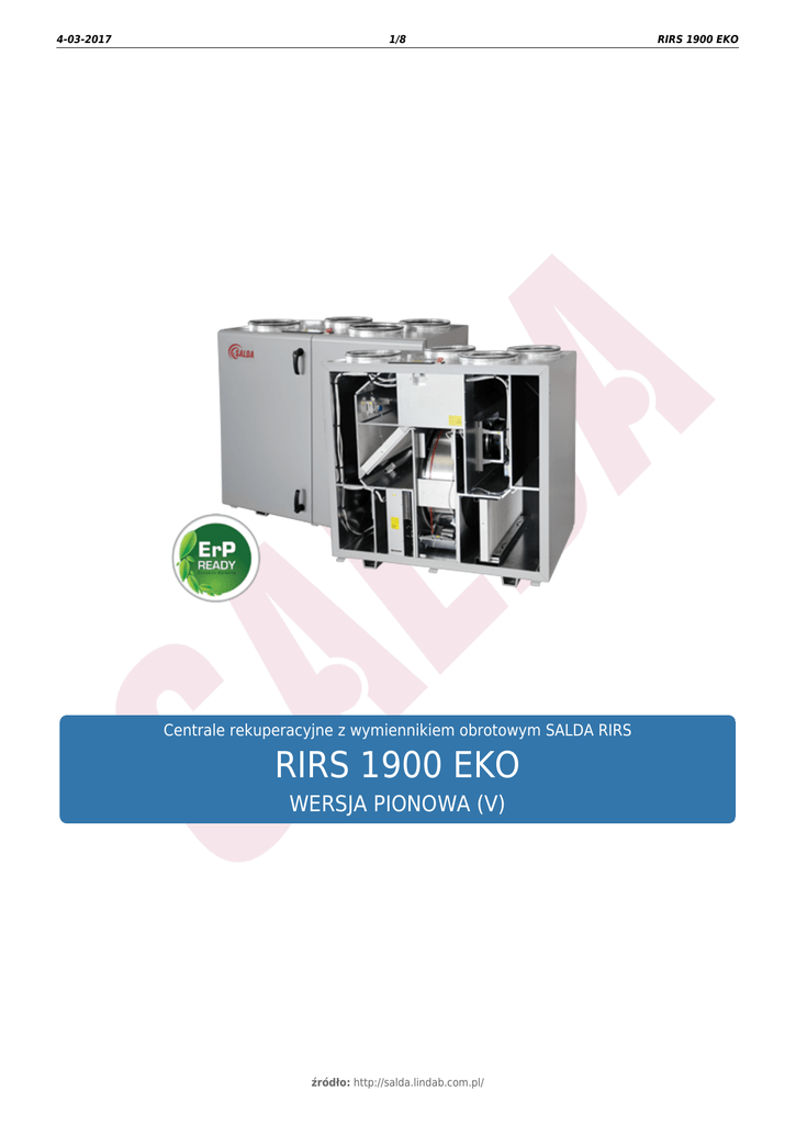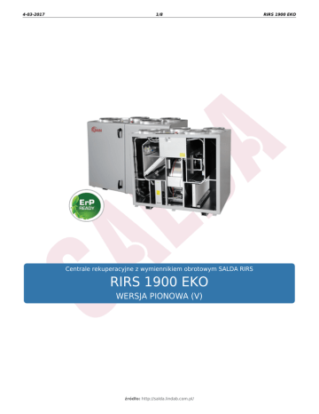 4-03-2017 1/8 Centrale rekuperacyjne z wymiennikiem obrotowym SALDA RIRS RIRS 1900 EKO WERSJA PIONOWA (V) źródło: http://salda.lindab.com.pl/ RIRS 1900 EKO 4-03-2017 2/8 Opis Centrale wentylacyjne RIRS EKO wyposażone są w wydajny obrotowy wymiennik ciepła. Jednostki służą do wentylacji domów oraz innych ogrzewanych pomieszczeń. Ten model produktu może być sterowany za pomocą sterowników Ptouch, Stouch i Flex. • Ciche i wydajne wentylatory EC. • Sprawność wymiennika ciepła: do 75%. • Zintegrowana nagrzewnica elektryczna lub opcjonalnie wodna. • Sterowanie nagrzewnicą elektryczną: 0-10V. • Sterowanie przepływem powietrza. • Niski poziom hałasu. • Izolacja akustyczna ścian: 50 mm. • Szybki i łatwy montaż. • Całkowicie zintegrowany system sterowania typu plug&play. • Zintegrowany presostat mierzący poziom zanieczyszczenia filtra. • Opcjonalny przetwornik CO2, ciśnienia lub przepływu powietrza. źródło: http://salda.lindab.com.pl/ RIRS 1900 EKO 4-03-2017 3/8 RIRS 1900 EKO Dane techniczne Wersja z nagrzewnicą elektryczną RIRS 1900 VE EKO 3.0 Wydajność/spręż Nagrzewnica [m³/h]/[Pa] - faza, napięcie - moc Wentylatory EC - wywiew - nawiew [50Hz/V] [kW] - faza, napięcie [50Hz/V] ~3, 400 9,0 ~1, 230 - moc/prąd [kW/A] 0,47/3,10 - prędkość wentylatora [min-1] 2540 - moc/prąd [kW/A] 0,47/3,10 - prędkość wentylatora [min-1] 2540 [kW/A] 9,96/19,37 Sprawność cieplna Maks. zużycie energii 1800/110 75% Płyta sterująca PRV V2 Klasa filtra wywiewnego M5 Klasa filtra nawiewnego F7 Izolacja cieplna [mm] Kolor (RAL) Waga netto 50 7040 (szary) [kg] Eksploatacja 180,0 w pomieszczeniu Stopień ochrony obudowy IP-34 Zgodność z ERP 2016; 2018 źródło: http://salda.lindab.com.pl/ 4-03-2017 4/8 RIRS 1900 EKO Wersja z nagrzewnicą wodną RIS 1900 VW EKO 3.0 Wydajność/spręż [m³/h]/[Pa] Nagrzewnica wodna (opcja) Wentylatory EC - wywiew - nawiew 1800/110 AVS 315 - faza, napięcie [50Hz/V] ~1, 230 - moc/prąd [kW/A] 0,47/3,10 - prędkość wentylatora [min ] 2540 - moc/prąd [kW/A] 0,47/3,10 - prędkość wentylatora [min ] 2540 -1 -1 Sprawność cieplna* Maks. zużycie energii 75% [kW/A] Płyta sterująca 0,96/6,37 PRV V2 Klasa filtra wywiewnego M5 Klasa filtra nawiewnego F7 Izolacja cieplna [mm] Kolor (RAL) Waga netto 50 7040 (szary) [kg] Eksploatacja 178,0 w pomieszczeniu Stopień ochrony obudowy IP-34 Zgodność z ERP 2016; 2018 źródło: http://salda.lindab.com.pl/ 4-03-2017 5/8 RIRS 1900 EKO Charakterystyka akustyczna Całkowite Lwa dB(A) Lwa, dB(A) 125 Hz 250 Hz 500 Hz 1 kHz 2 kHz 4 kHz 8 kHz Wlot 80 56 76 71 72 71 70 62 Wylot 69 56 67 60 54 58 57 48 Do otoczenia 60 44 57 51 49 53 52 45 Pomiary przy 1879 m³/h, 101 Pa Wydajność/spręż - wartości mierzone w punkcie pracy. Sprawność cieplna obliczana zgodnie z normą EN 13141-7. Dla temperatur niższych niż zalecane należy użyć nagrzewnicy wstępnej, by zapewnić zrównoważoną eksploatację. Poziomy mocy akustycznej zostały ustalone zgodnie z normą DIN 45635 i/lub ISO 3744. źródło: http://salda.lindab.com.pl/ 4-03-2017 6/8 RIRS 1900 EKO Wymiary W L H H1 ØD F 1500 mm 855 mm 1150 mm 70 mm 315 mm 40 mm źródło: http://salda.lindab.com.pl/ 4-03-2017 7/8 RIRS 1900 EKO Schematy funkcyjne Wersja z nagrzewnicą elektryczną A - powietrze zewnętrzne B - powietrze nawiewane C - powietrze wywiewane D - powietrze odprowadzane na zewnątrz PS1 - przełącznik różnicowo-ciśnieniowy powietrza nawiewanego PS2 - przełącznik różnicowo-ciśnieniowy powietrza wywiewanego DTJ - czujnik wilgotności i temperatury IV - wentylator wywiewny PV - wentylator nawiewny RR - obrotowy wymiennik ciepła R - silnik obrotowego wymiennika ciepła KE - nagrzewnica elektryczna PF - filtr nawiewny IF - filtr wyciągowy TJ - czujnik temperatury powietrza nawiewanego TL - czujnik temperatury powietrza zewnętrznego TE - czujnik temperatury powietrza wywiewanego EKA NV PH - nagrzewnica wstępna (opcja) AVA - chłodnica wodna (opcja) Wersja pozioma z nagrzewnicą wodną źródło: http://salda.lindab.com.pl/ 4-03-2017 8/8 A - powietrze zewnętrzne B - powietrze nawiewane C - powietrze wywiewane D - powietrze odprowadzane na zewnątrz RIRS 1900 EKO PS1 - przełącznik różnicowo-ciśnieniowy powietrza nawiewanego PS2 - przełącznik różnicowo-ciśnieniowy powietrza wywiewanego AVS - nagrzewnica montowana na kanale (opcja) AVA - chłodnica wodna (opcja) EKA NV PH - nagrzewnica wstępna (opcja) DTJ - czujnik wilgotności i temperatury IV - wentylator wywiewny PV - wentylator nawiewny RR - obrotowy wymiennik ciepła R - silnik obrotowego wymiennika ciepła PF - filtr nawiewny IF - filtr wyciągowy TJ - czujnik temperatury powietrza nawiewanego TL - czujnik temperatury powietrza zewnętrznego M6 - dodatkowy zawór mieszający i siłownik (opcja) M4 - pompa obiegowa (opcja) T1 - termostat przeciwzamrożeniowy TV - czujnik przeciwzamrożeniowy TE - czujnik temperatury powietrza wywiewanego źródło: http://salda.lindab.com.pl/