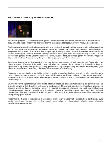 SPOTKANIE Z GWIAZDĄ HANNĄ BANASZAK W ramach projektu „Z gwiazdami zaczytani” Miejsko-Gminna Biblioteka Publiczna w Żabnie miała przyjemność gościć niezwykłą artystkę Hannę Banaszak, której towarzyszył muzyk Jacek Szwaj. Podczas spotkania piosenkarka opowiadała o początkach swojej kariery muzycznej – debiutowała w 1976 roku podczas Krajowego Festiwalu Piosenki Polskiej w Opolu. Początkowo występowała z zespołem Sami Swoi, a w latach 80. rozpoczęła karierę solową. Hanna Banaszak wspominała w Żabnie wybitnych autorów tekstów i kompozytorów z którymi miała zaszczyt współpracować, a byli wśród nich Jonasz Kofta, Jeremi Przybora, Jerzy „Duduś” Matuszkiewicz, Jerzy Wasowski, Wojciech Młynarski, Andrzej Trzaskowski, Zbigniew Górny, Jan „Kanty” Pawluśkiewicz. Zainteresowania Hanny Banaszak wykraczają jednak poza muzykę, zajmuje się ona fotografią oraz pisze wiersze. Wystawa fotografii, którą od kilku lat prezentuje w różnych miejscach w Polsce, opowiada o jej podróżach po kraju, który przemierza, by spotykać się ze swoimi wielbicielami. Jest także autorką tomiku wierszy „Zamienie Samolubie na Szczodruchy”. Artystka w swoim życiu brała także udział w wielu przedsięwzięciach telewizyjnych i scenicznych, m.in. użyczyła swego głosu postaci Hanki Ordonówny w filmie „Miłość ci wszystko wybaczy”, zaśpiewała arię ze Stabat Mater Vivaldiego w filmie „Siekierezada”. Zrealizowała też kilka recitali telewizyjnych. Zapytana o swoje preferencje czytelnicze odpowiedziała, że zawsze interesowała się psychologią i to właśnie książki z tej dziedziny zajmują ją najbardziej. Natomiast jeżeli czyta literaturę piękną, to zawsze wybiera takich autorów, którzy w swojej twórczości skupiają się nad psychologiczną charakterystyką postaci, wśród nich wymieniła Fiodora Dostojewskiego. Natomiast jej ulubioną poetką jest Wisława Szymborska, której wiersz „Pierwsza fotografia Hitlera” mogliśmy usłyszeć w interpretacji pani Hanny. Piosenkarka chętnie odpowiadała na pytania licznie zgromadzonych uczestników spotkania. Była także możliwość zakupu jej tomiku poezji oraz kolęd w interpretacji artystki oraz zdobycia pamiątkowego autografu. 1/1 Powered by TCPDF (www.tcpdf.org)