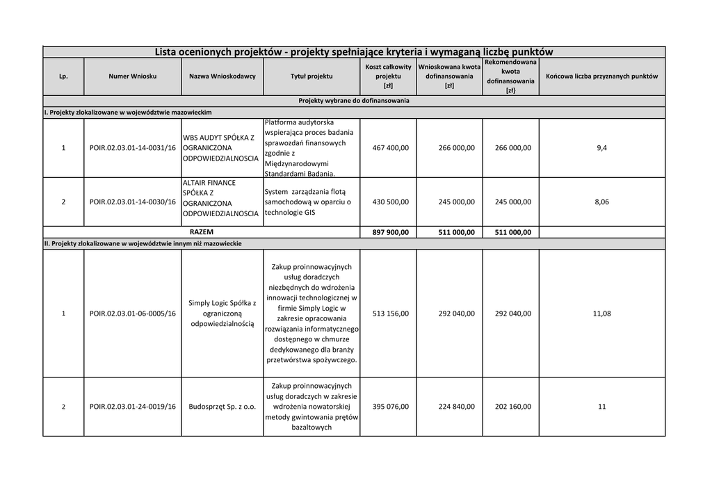 Lista ocenionych projektów - projekty spełniające kryteria i wymaganą liczbę punktów Lp. Numer Wniosku Nazwa Wnioskodawcy Rekomendowana Koszt całkowity Wnioskowana kwota kwota Tytuł projektu projektu dofinansowania dofinansowania [zł] [zł] [zł} Projekty wybrane do dofinansowania Końcowa liczba przyznanych punktów I. Projekty zlokalizowane w województwie mazowieckim 1 2 Platforma audytorska wspierająca proces badania WBS AUDYT SPÓŁKA Z sprawozdań finansowych POIR.02.03.01-14-0031/16 OGRANICZONA zgodnie z ODPOWIEDZIALNOSCIA Międzynarodowymi Standardami Badania. ALTAIR FINANCE System zarządzania flotą SPÓŁKA Z POIR.02.03.01-14-0030/16 OGRANICZONA samochodową w oparciu o ODPOWIEDZIALNOSCIA technologie GIS 467 400,00 266 000,00 266 000,00 9,4 430 500,00 245 000,00 245 000,00 8,06 897 900,00 511 000,00 511 000,00 Simply Logic Spółka z ograniczoną odpowiedzialnością Zakup proinnowacyjnych usług doradczych niezbędnych do wdrożenia innowacji technologicznej w firmie Simply Logic w zakresie opracowania rozwiązania informatycznego dostępnego w chmurze dedykowanego dla branży przetwórstwa spożywczego. 513 156,00 292 040,00 292 040,00 11,08 Budosprzęt Sp. z o.o. Zakup proinnowacyjnych usług doradczych w zakresie wdrożenia nowatorskiej metody gwintowania prętów bazaltowych 395 076,00 224 840,00 202 160,00 11 RAZEM II. Projekty zlokalizowane w województwie innym niż mazowieckie 1 2 POIR.02.03.01-06-0005/16 POIR.02.03.01-24-0019/16 3 4 5 6 Usługi doradcze w zakresie innowacji oraz usługi wsparcia innowacji zmierzające do wdrożenia w przedsiębiorstwie Wnioskodawcy technologii systemowych, proekologicznych napraw blacharskich i lakierniczych. 510 450,00 290 500,00 290 500,00 10,5 POIR.02.03.01-24-0010/16 Zakup usług proinnowacyjnych skutkujących wdrożeniem w Software Interactive Sp. firmie Software Interactive z o.o. Sp. z o.o. innowacyjnego produktu na bazie urządzeń mobilnych. 365 310,00 207 900,00 207 900,00 9,51 POIR.02.03.01-30-0017/16 Wzrost konkurencyjności przedsiębiorstwa Bolee Sp. z o.o. poprzez wykorzystanie BOLEE SPÓŁKA Z usług doradczych w zakresie OGRANICZONĄ innowacji i wsparcia ODPOWIEDZIALNOŚCIĄ innowacji, które pozwolą wdrożyć na rynek innowacyjny produkt 463 956,00 264 040,00 226 240,00 9,44 POIR.02.03.01-22-0003/16 Proinnowacyjne usługi IOB dla przedsiębiorstwa SCOOCASE Sp. z o.o. w celu SCOOCASE SPÓŁKA Z wdrożenia innowacji w OGRANICZONĄ postaci technologii dla ODPOWIEDZIALNOŚCIĄ jezdnej walizki podręcznej, zasilanej akumulatorem i napędzanej silnikiem elektrycznym 516 477,00 293 930,00 256 550,00 9,1 POIR.02.03.01-30-0013/16 s.c. DARPEX Piotr, Robert, Dariusz Szymczak 7 8 9 10 ReEnd Spółka z ograniczoną odpowiedzialnością Opracowanie i wdrożenie na rynek przez przedsiębiorstwo ReEnd Sp. z o.o. innowacji technologicznej, umożliwiającej zaoferowanie jednorodnych puszek z tworzyw sztucznych zawierających nowatorski mechanizm wielokrotnego otwierania i zamykania z wykorzystaniem proinnowacyjnych usług doradczych. 498 150,00 283 500,00 283 500,00 9,01 POIR.02.03.01-18-0015/16 Synergy Technologies Sp. z o.o. Wprowadzenie nowego produktu w postaci uniwersalnych, elektrycznych, zintegrowanych zespołów napędowych BLDC 188 190,00 107 100,00 96 600,00 9 POIR.02.03.01-24-0020/16 DROMA s.c Justyna Włosek, Zbigniew Włosek Wdrożenie innowacyjnych produktów techniki osłonowej 514 755,00 292 950,00 259 350,00 9 Centrum BadawczoRozwojowe Technologii Informatycznych sp. z o.o. "Proinnowacyjne usługi doradcze świadczone dla Centrum BadawczoRozwojowego Technologii Informatycznych sp. z o.o. prowadzące do wdrożenia innowacji produktowej" 446 244,00 253 960,00 253 960,00 8,76 POIR.02.03.01-30-0014/16 POIR.02.03.01-18-0001/16 11 12 13 14 Proinnowacyjne usługi IOB dla przedsiębiorstwa AGNIESZKA SZYMAŃSKA- AGNIESZKA SZYMAŃSKAPOIR.02.03.01-30-0019/16 KACZYŃSKA "AS" KACZYŃSKA „AS” P.H.P.U. w P.H.P.U. celu wdrożenia innowacji w postaci technologii dla sterownika temperatury Proinnowacyjne usługi IOB w firmie Eco Power Development sp. z o.o. w Eco Power Development POIR.02.03.01-26-0004/16 zakresie: Opracowanie sp. z o.o. innowacji produktowej w postaci innowacyjnej głowicy do granulacji RDF. Zakup usługi proinnowacyjnej celem EMT-SYSTEMS SPÓŁKA wdrożenia innowacyjnej POIR.02.03.01-24-0001/16 ZA OGRANICZONĄ usługi szkoleniowej w firmie ODPOWIEDZIALNOŚCIĄ EMT- SYSTEMS Spółka z ograniczoną odpowiedzialnością Wzrost konkurencyjności przedsiębiorstwa Zylia Sp. z o.o. poprzez wykorzystanie usług doradczych w zakresie POIR.02.03.01-30-0015/16 Zylia Sp. z o.o. innowacji oraz wsparcia innowacji, które pozwolą wprowadzić na rynek innowacyjny produkt 399 381,00 227 290,00 227 290,00 8,72 344 400,00 196 000,00 196 000,00 7,82 238 251,00 135 590,00 129 990,00 7,72 387 081,00 220 290,00 203 690,00 7,58 15 POIR.02.03.01-18-0006/16 16 POIR.02.03.01-06-0008/16 17 POIR.02.03.01-24-0012/16 18 POIR.02.03.01-06-0009/16 PPHU InterCom_plus Dariusz Ledniowski "Proinnowacyjne usługi doradcze dla firmy PPHU InterCom_plus Dariusz Ledniowski (dalej również jako IC PLUS) w zakresie implementacji innowacji technologicznej – procesowej polegającej na implementacji systemu produkcji opakowań" „Proinnowacyjne usługi doradcze dla firmy STANISŁAW KRZACZEK STANISŁAW KRZACZEK ZAKŁAD PRODUKCYJNO ZAKŁAD PRODUKCYJNO HANDLOWY w zakresie HANDLOWY implementacji innowacji technologicznej – procesowej wspierającej procesy produkcyjne." Wdrożenie innowacyjnego typu kotłów zalewowych do Rex-Pol Sp. z o.o. gotowania i schładzania wędlin Tema sp. z o.o. sp. k. Pozyskanie proinnowacyjnych usług doradczych związane z wdrożeniem innowacji procesowej polegającej na implementacji systemu zarządzania produkcją i utrzymaniem ruchu w przedsiębiorstwie TEMA sp. z o.o. sp. k. 437 388,00 248 920,00 248 920,00 7,38 449 442,00 255 780,00 255 780,00 7,3 312 420,00 198 800,00 198 800,00 7,21 462 234,00 263 060,00 263 