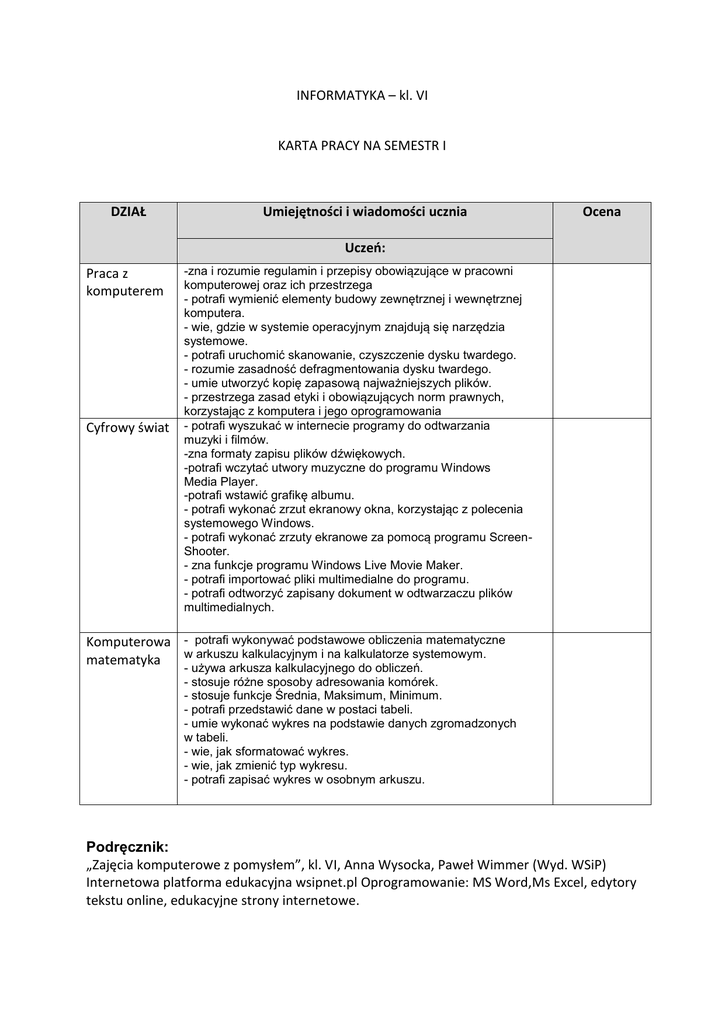INFORMATYKA – kl. VI KARTA PRACY NA SEMESTR I DZIAŁ Umiejętności i wiadomości ucznia Ocena Uczeń: Praca z komputerem Cyfrowy świat -zna i rozumie regulamin i przepisy obowiązujące w pracowni komputerowej oraz ich przestrzega - potrafi wymienić elementy budowy zewnętrznej i wewnętrznej komputera. - wie, gdzie w systemie operacyjnym znajdują się narzędzia systemowe. - potrafi uruchomić skanowanie, czyszczenie dysku twardego. - rozumie zasadność defragmentowania dysku twardego. - umie utworzyć kopię zapasową najważniejszych plików. - przestrzega zasad etyki i obowiązujących norm prawnych, korzystając z komputera i jego oprogramowania - potrafi wyszukać w internecie programy do odtwarzania muzyki i filmów. -zna formaty zapisu plików dźwiękowych. -potrafi wczytać utwory muzyczne do programu Windows Media Player. -potrafi wstawić grafikę albumu. - potrafi wykonać zrzut ekranowy okna, korzystając z polecenia systemowego Windows. - potrafi wykonać zrzuty ekranowe za pomocą programu ScreenShooter. - zna funkcje programu Windows Live Movie Maker. - potrafi importować pliki multimedialne do programu. - potrafi odtworzyć zapisany dokument w odtwarzaczu plików multimedialnych. Komputerowa - potrafi wykonywać podstawowe obliczenia matematyczne w arkuszu kalkulacyjnym i na kalkulatorze systemowym. matematyka - używa arkusza kalkulacyjnego do obliczeń. - stosuje różne sposoby adresowania komórek. - stosuje funkcje Średnia, Maksimum, Minimum. - potrafi przedstawić dane w postaci tabeli. - umie wykonać wykres na podstawie danych zgromadzonych w tabeli. - wie, jak sformatować wykres. - wie, jak zmienić typ wykresu. - potrafi zapisać wykres w osobnym arkuszu. Podręcznik: „Zajęcia komputerowe z pomysłem”, kl. VI, Anna Wysocka, Paweł Wimmer (Wyd. WSiP) Internetowa platforma edukacyjna wsipnet.pl Oprogramowanie: MS Word,Ms Excel, edytory tekstu online, edukacyjne strony internetowe.