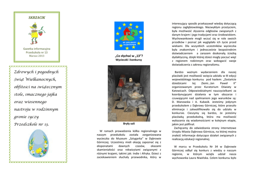 SKRZACIK Gazetka informacyjna Przedszkola nr 13 Marzec 2013 „Co słychać w „13”? Wycieczki i konkursy Zdrowych i pogodnych Świąt Wielkanocnych, obfitości na świątecznym stole, smacznego jajka oraz wiosennego nastroju w rodzinnym gronie życzy Przedszkole nr 13. Bryły soli W ramach prowadzenia kółka regionalnego w naszym przedszkolu została zorganizowana wycieczka do Muzeum „Sztygarka” w Dąbrowie Górniczej. Uczestnicy mieli okazję zapoznać się z eksponatami dawnych czasów, okazami skamieniałości oraz rekwizytami związanymi z różnymi krajami, takimi jak: Indie i Afryka. Dzieci z zaciekawieniem słuchały przewodnika, który w interesujący sposób przekazywał wiedzę dotyczącą regionu zagłębiowskiego. Niezwykłym przeżyciem, była możliwość słyszenia odgłosów związanych z danym krajem i jego tradycjami oraz środowiskiem. Wychowankowie mogli wczuć się w role swoich przodków i poznać jak wyglądało ich życie przed wiekami. Dla wszystkich uczestników wycieczka była znakomitym i jednocześnie bezpośrednim doświadczeniem a zarazem doskonałą ścieżką dydaktyczną, dzięki której dzieci mogły poczuć więź z regionem rodzinnym oraz wzbogacić swoje doświadczenia z zakresu regionalizmu. Bardzo ważnym wydarzeniem dla naszej placówki jest możliwość wzięcia udziału w III edycji wojewódzkiego konkursu pod hasłem: „Zostańcie dziedzicami tej Ziemi…Jan Paweł II” organizowanym przez Kuratorium Oświaty w Katowicach. Odpowiedzialnymi nauczycielkami za koordynującymi działania w tym obszarze i czuwającymi nad spełnianiem jego warunków są: D. Manowska i A. Kubasik. Jesteśmy jedynym przedszkolem z Dąbrowy Górniczej, które przeszło eliminacje i zakwalifikowało się do udziału w konkursie. Cieszymy się bardzo, że jesteśmy placówką przedszkolną, która ma możliwość wykazania się wiadomościami w kolejnym etapie, jakim jest półfinał. Zachęcamy do odwiedzania strony internetowe Urzędu Miasta Dąbrowa Górnicza, na której można znaleźć informacje dotyczące działań związanych z realizacją edukacji regionalnej. W marcu w Przedszkolu Nr 34 w Dąbrowie Górniczej odbył się konkurs z wiedzy o naszym regionie, w którym wzięła udział nasza wychowanka Laura Niwińska. Celem konkursu było wzbogacenie wiedzy o rodzinnym mieście oraz rozbudzenia poczucia własnej tożsamości, przynależności do społeczeństwa i regionu. Kolejnym konkursem, tym razem plastycznym w ramach realizacji programu przez A. Kubasik, został zorganizowany konkurs: „Piramida zdrowia”. Udział w nim wzięło kilkanaście dzieci z różnych grup wiekowych. Uroczyste wręczenie dyplomów i upominków odbyło się w „zdrowej” atmosferze, którego dokonała pani dyrektor K. Światowska. Wśród prac zostały wyróżnione 2 piramidy należące do 5- latki Mai Wojnar oraz 5- latka Jasia Nogaj. Gratulujemy pomysłowości! A. Kubasik Gdy dziecko mówi: nie! Co zrobić, gdy dziecko prawie codziennie próbuje stawiać na swoim, czegoś odmawia lub buntuje się? Czy jest to prawidłowość rozwojowa, czy z dzieckiem dzieje się coś niedobrego? Dziecko w wieku 3 – 6 lat początkowo dość często prezentuje reakcje sprzeciwu i uporu, które umożliwiają mu doświadczanie własnej autonomii wobec innych osób. Później częściej bywa posłuszne, gdyż stara się zabiegać o przychylność i sympatię innych, a na koniec próbuje naśladować wzorce zachowań osób znaczących. Zdarza się jednak, że starsze dziecko, np. 5-letnie może posunąć się do prowokowania rodziców swoim sprzeciwem. Rozsądny rodzic zareaguje na taki sprzeciw łagodnie lecz stanowczo i konsekwentnie, unikając jednocześnie nadmiernej krytyki i karania. Dziecko, któremu zabrania się mówić „nie”, ślepo posłuszne rodzicom może w przyszłości łatwo ulegać wpływom innych. Zatem, jak postępować, gdy trudno zachować cierpliwość i spokój? Najlepiej zapobiegać buntowniczym zachowaniom dziecka lub starać się je minimalizować. Oto kilka praktycznych wskazówek: * Dajemy dziecku możliwość i prawo wyboru (np. gdy przeczuwamy, że będzie chciało założyć skarpetki w chłodny dzień, mówimy „które rajstopki chcesz dziś założyć – niebieskie czy zielone?”) i chwalimy za ten wybór. *Wątpliwości nie ma, gdy upór dziecka zagraża bezpieczeństwu jego lub innych osób. Wówczas rodzic przejmuje kontrolę nad sytuacją zapewniając jednocześnie o swojej miłości. Próbuje też skłonić dziecko do zastanowienia się, co może się wydarzyć, jeśli nie posłucha prośby. Taka sytuacja jest okazją do rozwijania myślenia przyczynowoskutkowego. *Ważny jest sposób formułowania komunikatów, które muszą zawierać pozytywną instrukcję, np. „mów umiarkowanym głosem”, zamiast „nie krzycz”. Polecenia powinny być zdaniami twierdzącymi, nie pytającymi, np. „wskakuj do łóżka i przytul misia”, zamiast „czy pójdziesz spać?”. *Dziecko wciąż uczy się pojmowania stosunków czasowych, dlatego nie jest w stanie zaplanować i przewidzieć, co wkrótce powinno zrobić. Należy przynajmniej raz, kilkanaście minut wcześniej zapowiedzieć, że ma kończyć zabawę, bo zbliża się czas np. kąpieli. *Do prośby dobrze jest dołożyć coś, co dziecko lubi robić, np. gdy chcemy, by posprzątało zabawki mówimy: „zanim pooglądasz bajki, powkładaj klocki do pudełka”. *Zachęcanie dziecka do współdziałania wymaga trochę więcej czasu, który należy uwzględniać w codziennych sytuacjach. Dziecko, które wyczuwa pośpiech i zdenerwowanie rodzica jest bardziej skłonne do stawiania oporu. Pamiętajmy, że rozsądne pozwalanie dziecku na wyrażanie sprzeciwu daje mu okazję do wyrażania swoich uczuć i pragnień oraz uczy podejmowania negocjacji. Wcale to nie oznacza, że zawsze ustępujemy dziecku. To dziecko, gdy najpierw się zbuntuje, a potem ustąpi, przekona się, że ostateczna decyzja nale