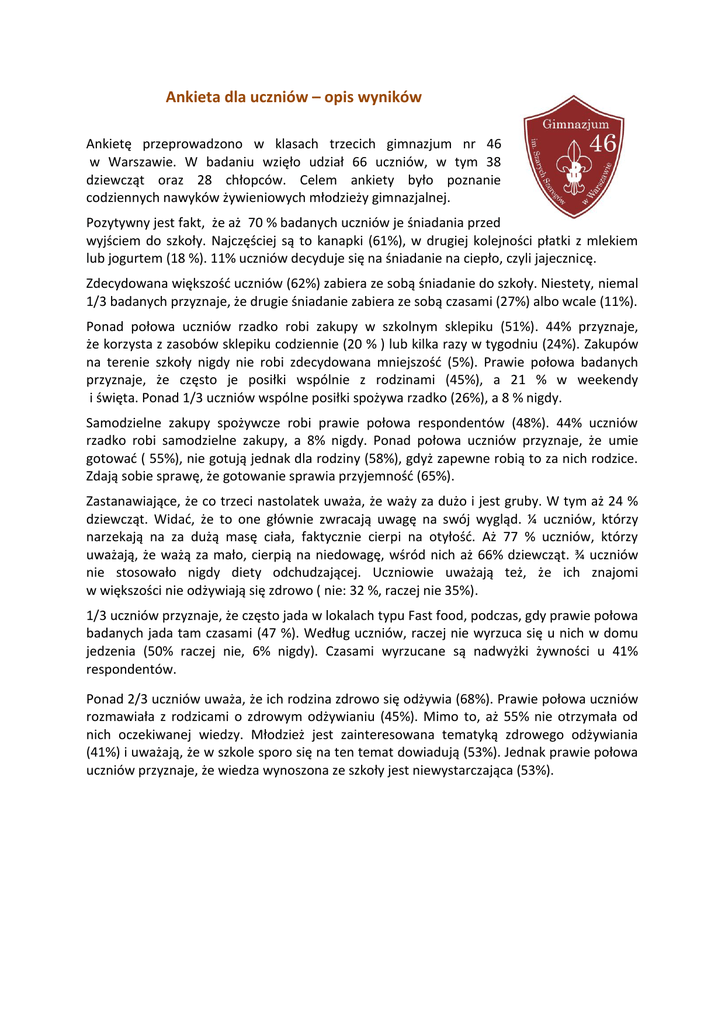 Ankieta dla uczniów – opis wyników Ankietę przeprowadzono w klasach trzecich gimnazjum nr 46 w Warszawie. W badaniu wzięło udział 66 uczniów, w tym 38 dziewcząt oraz 28 chłopców. Celem ankiety było poznanie codziennych nawyków żywieniowych młodzieży gimnazjalnej. Pozytywny jest fakt, że aż 70 % badanych uczniów je śniadania przed wyjściem do szkoły. Najczęściej są to kanapki (61%), w drugiej kolejności płatki z mlekiem lub jogurtem (18 %). 11% uczniów decyduje się na śniadanie na ciepło, czyli jajecznicę. Zdecydowana większośd uczniów (62%) zabiera ze sobą śniadanie do szkoły. Niestety, niemal 1/3 badanych przyznaje, że drugie śniadanie zabiera ze sobą czasami (27%) albo wcale (11%). Ponad połowa uczniów rzadko robi zakupy w szkolnym sklepiku (51%). 44% przyznaje, że korzysta z zasobów sklepiku codziennie (20 % ) lub kilka razy w tygodniu (24%). Zakupów na terenie szkoły nigdy nie robi zdecydowana mniejszośd (5%). Prawie połowa badanych przyznaje, że często je posiłki wspólnie z rodzinami (45%), a 21 % w weekendy i święta. Ponad 1/3 uczniów wspólne posiłki spożywa rzadko (26%), a 8 % nigdy. Samodzielne zakupy spożywcze robi prawie połowa respondentów (48%). 44% uczniów rzadko robi samodzielne zakupy, a 8% nigdy. Ponad połowa uczniów przyznaje, że umie gotowad ( 55%), nie gotują jednak dla rodziny (58%), gdyż zapewne robią to za nich rodzice. Zdają sobie sprawę, że gotowanie sprawia przyjemnośd (65%). Zastanawiające, że co trzeci nastolatek uważa, że waży za dużo i jest gruby. W tym aż 24 % dziewcząt. Widad, że to one głównie zwracają uwagę na swój wygląd. ¼ uczniów, którzy narzekają na za dużą masę ciała, faktycznie cierpi na otyłośd. Aż 77 % uczniów, którzy uważają, że ważą za mało, cierpią na niedowagę, wśród nich aż 66% dziewcząt. ¾ uczniów nie stosowało nigdy diety odchudzającej. Uczniowie uważają też, że ich znajomi w większości nie odżywiają się zdrowo ( nie: 32 %, raczej nie 35%). 1/3 uczniów przyznaje, że często jada w lokalach typu Fast food, podczas, gdy prawie połowa badanych jada tam czasami (47 %). Według uczniów, raczej nie wyrzuca się u nich w domu jedzenia (50% raczej nie, 6% nigdy). Czasami wyrzucane są nadwyżki żywności u 41% respondentów. Ponad 2/3 uczniów uważa, że ich rodzina zdrowo się odżywia (68%). Prawie połowa uczniów rozmawiała z rodzicami o zdrowym odżywianiu (45%). Mimo to, aż 55% nie otrzymała od nich oczekiwanej wiedzy. Młodzież jest zainteresowana tematyką zdrowego odżywiania (41%) i uważają, że w szkole sporo się na ten temat dowiadują (53%). Jednak prawie połowa uczniów przyznaje, że wiedza wynoszona ze szkoły jest niewystarczająca (53%). Ankieta dla uczniów Pytania oraz wyniki ankiety w ujęciu procentowym: 1. Czy jesz rano śniadanie? a. Tak 70 % badanych b. Nie 30 % 2. Jeżeli tak, to jak najczęściej wygląda Twoje śniadanie (wybierz zestaw najbardziej przybliżony do tego co jesz)? a. Płatki z owocami z mlekiem, jogurtem – 18 % b. Jajecznica 11 % c. Kanapki 61 % 3. Czy zabierasz ze sobą do szkoły drugie śniadanie? a. Tak 62 % b. Nie 11 % c. Czasami 27 % 4. Jak często robisz zakupy w szkolnym sklepiku? a. Codziennie 20 % b. Kilka razy w tygodniu 24 % c. Rzadko, 51 % d. Nigdy 5 % 5. Czy jadasz posiłki wspólnie z rodziną? a. Tak, często 45 % b. Tylko w weekendy i święta 21 % c. Rzadko 26 % d. Nigdy 8% 6. Czy robisz samodzielnie zakupy spożywcze? a. Tak 48 % b. Rzadko 44 % c. Nigdy 8 % 7. Czy umiesz gotowad? a. Tak 55 % b. Słabo 42 % c. Nie 3 % 8. Czy zdarza Ci się gotowad dla rodziny? a. Tak 42 % b. Nie 58 % 9. Czy gotowanie sprawie Ci przyjemnośd? a. Tak 65 % b. Nie 35 % 10. Czy uważasz, że Twoja rodzina zdrowo się odżywia? a. Tak 68 % b. Nie 32 % 11. Czy rodzice rozmawiali z Toba kiedykolwiek o zdrowym odżywianiu? a. Tak 45 % b. Nie 55 % 12. Ile masz wzrostu i ile ważysz? a. Wzrost b. Waga 13. Czy uważasz, że Twoja waga jest prawidłowa? a. Tak 47 % w tym dziewczyn 16 % b. Nie 9 % całości badanych w tym dziewczyn 6 % c. Jestem za gruby/gruba 30 % w tym dziewczyn 24 % d. Jestem za chudy/chuda 14 % w tym dziewczyn 11 % 25 % osób spośród tych, które uważają się za grube faktycznie cierpi na otyłośd - BMI wynosi pomiędzy 24,4 do 29 (20 % osoby to dziewczyny, 5 % chłopcy). 77 % osób spośród twierdzących że są za chude faktycznie ma niedowagę - BMI pomiędzy 16 a 18 (66 % osób to dziewczyny). 14. Czy kiedykolwiek stosowałeś/stosowałaś dietę odchudzającą? a. Tak 24 % b. Nie 76 % 15. Czy uważasz, że Twoi rówieśnicy zdrowo się odżywiają? a. Tak 4 % w tym dziewczyn 1,5 % b. Nie 32 % w tym dziewczyn 17 % c. Raczej tak 29 % d. Raczej nie 35 % 16. Czy zdarza Ci się rozmawiad z rówieśnikami na temat zdrowego odżywiania? a. Tak 41 % w tym dziewczyn 32 % b. Nie 59 % 17. Czy uważasz, że w szkole dowiadujesz się dużo o zdrowym odżywianiu? a. Tak 47 % b. Nie 53 % 18. Czy jadasz w lokalach typu Fast Food? a. Tak, często 30 % b. Czasami 47 % c. Rzadko 17 % d. Staram się unikad 6 % 19. Czy zdarza Ci się/Twojej rodzinie wyrzucad jedzenie, bo się zepsuło/kupiliście za dużo? a. Tak, często 3 % b. Czasami 41 % c. Raczej nie 50 % d. Nigdy 6 %