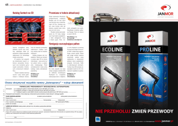 48 | AKTUALNOŚCI | NOWOŚCI NA RYNKU Katalog Sentech na CD Przemiana w trakcie aktualizacji Dzięki najnowszej aktualizacji oprogramowania urządzenie Navigon serii 33 oraz 4310 max zamienia się w model Navigon 40 Plus. Uzyskuje przy tym nowe funkcje, takie jak aktywny asystent pasa ruchu weski, portugalski oraz czeski. oraz one-click menu. Aktualizację umożliwia aplika- Ponadto możliwe jest zwiększenie do 44 liczby dostępnych map krajów europejskich, a także wzbogacenie menu o kolejne języki: fiński, nor- cja Navigon Fresk do nabycia w cenie € 69.95. Komsa Polska sp. z o.o. tel. 71 331 19 99 www.ekomsa.pl, www.navigon.com Nawigacja oszczędzająca paliwo Zawiera opisy, listw do zestawów przewodów w ruchu drogowym za pomocą dokładne rysunki oraz cross- szczegółowe zapłonowych (indeksy Lxxx) firmowej technologii Communi- listy, ułatwiające dobór od oraz zestawy kabli do wózków ty Traffic i układa trasę, optyma- powiednich wiązek przewodów widłowych. lizując zużycie paliwa. Bierze zapłonowych do konkretnego modelu samochodu. Katalog dostępny jest nie- pod uwagę wartości spalania odpłatnie. Można go zamówić samochodu w postaci płyty CD na stronie użytkownika w ustawieniach się kilkadziesiąt nowych re- internetowej www.sentech.pl aplikacji i dane o prędkościach ferencji przewodów ferryto- lub pobrać online w postaci przejazdu Community Traffic wych oraz kompletna gama pliku na alternatywnych odcinkach. wiązek przewodów miedzia- zainstalowaniem nowej wersji nych, oznaczonych indeksem katalogu należy odinstalować Na rynku pojawiła się nowa oszczędzić nawet do 10% mie- 9xxx. poprzednią. wersja nawigacji osobistej GPS sięcznych wydatków na paliwo. W wydaniu tym pojawiło Osobne rozdziały stanowią rysunki i opisy cewek zapłonowych o indeksach SCxxxx, instalacyjnego. GG Profits sp. z o.o. tel. 42 214 51 50 www.sentech.pl Przed podane przez Funkcja trasy ECO pozwala za- do telefonów NaviExpert komórkowych 6.1. Urządzenie wykorzystuje dane o natężeniu NaviExpert sp. z o.o. tel. 61 852 33 11 www.naviexpert.pl Chcesz otrzymy wać wszystkie numery „Autonapraw y” – w ykup abonament! Zamawiam ❏ 11 kolejnych wydań w cenie 61,00 zł brutto (w tym VAT 22%) od numeru ........................ ❏ 6 kolejnych numerów w cenie 42,70 zł brutto (w tym VAT 22%) od numeru .................... ❏ 11 kolejnych wydań w cenie 36,60 zł brutto w prenumeracie dla szkół (w tym VAT 22%) od numeru ........................ Czasopismo jest bezpłatne. Cena obejmuje umieszczenie prenumeratora w bazie danych i obsługę wysyłek. DANE ZAMAWIAJĄCEGO: ❏ Jestem prenumeratorem ❏ Nie jestem prenumeratorem Nazwa firmy .................................................................................................................................................................................................................... ulica i numer domu ................................................................................ kod pocztowy ................. miejscowość ..................................................... Imię i nazwisko zamawiającego ................................................................................................. NIP (ewentualnie PESEL) ........................................ telefon do kontaktu ................................., e-mail ................................................................................................. ADRES DO WYSYŁKI (należy podać, jeśli jest inny niż podany wyżej adres płatnika): Odbiorca ......................................................................................................................................................................................................................... ulica i numer domu ................................................................................ kod pocztowy ................. miejscowość ..................................................... Faktura VAT zostanie dołączona do najbliższej wysyłki zamówionych czasopism. Upoważniam Wydawnictwo Technotransfer do wystawienia faktury VAT bez podpisu odbiorcy oraz umieszczenia moich danych w bazie adresowej wydawnictwa. ....................................................... (data) Autonaprawa | Styczeń 2011 .................................................................... (podpis) Fot. Naviexpert, Navigon, Sentech faks 71 343 35 41 F O R M U L A R Z P R E N U M E R A T Y M I E S I Ę C Z N I K A A U T O N A P R A W A