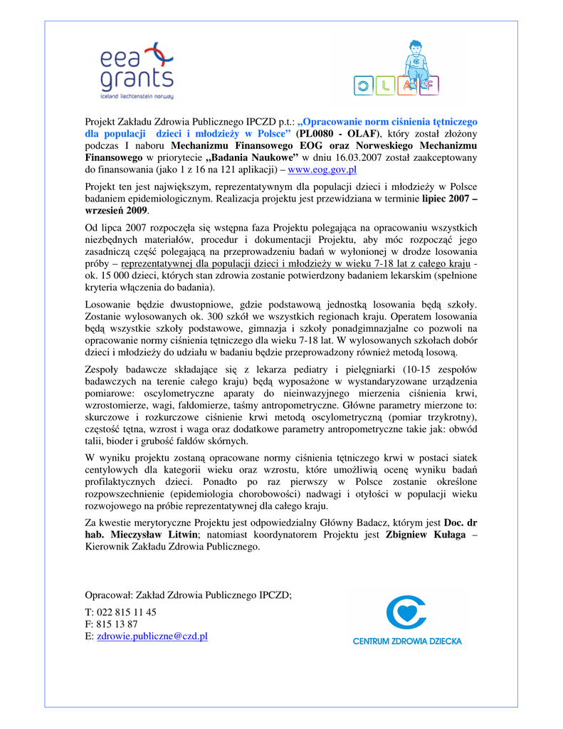 Projekt Zakładu Zdrowia Publicznego IPCZD p.t.: „Opracowanie norm ciśnienia tętniczego dla populacji dzieci i młodzieży w Polsce” (PL0080 - OLAF), który został złożony podczas I naboru Mechanizmu Finansowego EOG oraz Norweskiego Mechanizmu Finansowego w priorytecie „Badania Naukowe” w dniu 16.03.2007 został zaakceptowany do finansowania (jako 1 z 16 na 121 aplikacji) – www.eog.gov.pl Projekt ten jest największym, reprezentatywnym dla populacji dzieci i młodzieży w Polsce badaniem epidemiologicznym. Realizacja projektu jest przewidziana w terminie lipiec 2007 – wrzesień 2009. Od lipca 2007 rozpoczęła się wstępna faza Projektu polegająca na opracowaniu wszystkich niezbędnych materiałów, procedur i dokumentacji Projektu, aby móc rozpocząć jego zasadniczą część polegającą na przeprowadzeniu badań w wyłonionej w drodze losowania próby – reprezentatywnej dla populacji dzieci i młodzieży w wieku 7-18 lat z całego kraju ok. 15 000 dzieci, których stan zdrowia zostanie potwierdzony badaniem lekarskim (spełnione kryteria włączenia do badania). Losowanie będzie dwustopniowe, gdzie podstawową jednostką losowania będą szkoły. Zostanie wylosowanych ok. 300 szkół we wszystkich regionach kraju. Operatem losowania będą wszystkie szkoły podstawowe, gimnazja i szkoły ponadgimnazjalne co pozwoli na opracowanie normy ciśnienia tętniczego dla wieku 7-18 lat. W wylosowanych szkołach dobór dzieci i młodzieży do udziału w badaniu będzie przeprowadzony również metodą losową. Zespoły badawcze składające się z lekarza pediatry i pielęgniarki (10-15 zespołów badawczych na terenie całego kraju) będą wyposażone w wystandaryzowane urządzenia pomiarowe: oscylometryczne aparaty do nieinwazyjnego mierzenia ciśnienia krwi, wzrostomierze, wagi, fałdomierze, taśmy antropometryczne. Główne parametry mierzone to: skurczowe i rozkurczowe ciśnienie krwi metodą oscylometryczną (pomiar trzykrotny), częstość tętna, wzrost i waga oraz dodatkowe parametry antropometryczne takie jak: obwód talii, bioder i grubość fałdów skórnych. W wyniku projektu zostaną opracowane normy ciśnienia tętniczego krwi w postaci siatek centylowych dla kategorii wieku oraz wzrostu, które umożliwią ocenę wyniku badań profilaktycznych dzieci. Ponadto po raz pierwszy w Polsce zostanie określone rozpowszechnienie (epidemiologia chorobowości) nadwagi i otyłości w populacji wieku rozwojowego na próbie reprezentatywnej dla całego kraju. Za kwestie merytoryczne Projektu jest odpowiedzialny Główny Badacz, którym jest Doc. dr hab. Mieczysław Litwin; natomiast koordynatorem Projektu jest Zbigniew Kułaga – Kierownik Zakładu Zdrowia Publicznego. Opracował: Zakład Zdrowia Publicznego IPCZD; T: 022 815 11 45 F: 815 13 87 E: [email protected]