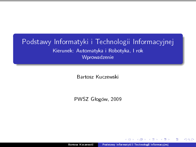 Podstawy Informatyki i Technologii Informacyjnej Kierunek: Automatyka i Robotyka, I rok Wprowadzenie Bartosz Kuczewski PWSZ Gªogów, 2009 Bartosz Kuczewski Podstawy Informatyki i Technologii Informacyjnej Plan wykªadów Wprowadzenie, podanie zagadnie«, poj¦cie informatyki i komputera, krótki rys historyczny rozwoju komputerów Architektura i organizacja komputerów - omówienie idei i istniej¡cych rozwi¡za« Komputery klasy PC - omówienie budowy, podzespoªów i sposobu dziaªania Systemy operacyjne i sieciowe - podziaª, koncepcje, przegl¡d istniej¡cych rozwi¡za« System operacyjny Windows - omówienie struktury i budowy systemu, monitorowanie wydajno±ci; System operacyjny UNIX podstawy Sieci komputerowe - klasykacja, architektura, protokoªy, sprz¦t i oprogramowanie sieciowe. Zasady pracy w sieciach i ochrona zasobów Oprogramowanie u»ytkowe - edytory tekstu - podziaª, zasady poprawnego skªadu tekstu, przykªady - Word, Latex Oprogramowanie u»ytkowe - arkusze kalkulacyjne w zastosowaniach in»ynierskich - Excel - analiza danych cz. I, cz.II, wizualizacja danych Bartosz Kuczewski Podstawy Informatyki i Technologii Informacyjnej Plan wykªadów Oprogramowanie u»ytkowe - aplikacje sªu»¡ce do tworzenia prezentacji multimedialnych Podstawy systemów bazodanowych cz I, cz II Internet - zasoby i ich eksploracja, podstawy statycznego HTML Bartosz Kuczewski Podstawy Informatyki i Technologii Informacyjnej Poj¦cia, denicje -`wyobra»enie', `wizerunek', `pomysª', ang. ) dziedzina nauki i techniki zajmuj¡ca si¦ przetwarzaniem informacji w tym technologiami przetwarzania informacji oraz technologiami wytwarzania systemów przetwarzaj¡cych informacje. Pierwotnie cz¦±¢ matematyki, zostaªa rozwini¦ta do osobnej dyscypliny nauki, pozostaje jednak nadal w ±cisªym zwi¡zku z matematyk¡, która dostarcza jej podstaw teoretycznych. [¹ródªo: Wikipedia] Informatyka (ªac. informatio computer science, informatics Podziaª: Analiza obejmuje analizowanie informacji przepªywaj¡cych w ±wiecie rzeczywistym - m.in. tworzenie i konstrukcja modeli analitycznych, np. j¦zyk UML Tworzenie oraz u»ywanie systemów sªu»¡cych do przetwarzania informacji, co obejmuje: projektowanie systemów informatycznych, programowanie oraz korzystanie z systemów informatycznych. Bartosz Kuczewski Podstawy Informatyki i Technologii Informacyjnej Poj¦cia, denicje (z ang. computer od ªac. computare oblicza¢, dawne nazwy: mózg elektronowy, elektroniczna maszyna cyfrowa, maszyna matematyczna) urz¡dzenie elektroniczne sªu»¡ce do przetwarzania wszelkich informacji, które da si¦ zapisa¢ w formie ci¡gu cyfr albo sygnaªu ci¡gªego (komputer cyfrowy/analogowy). [¹ródªo: Wikipedia] Komputer Bartosz Kuczewski Podstawy Informatyki i Technologii Informacyjnej Komputer i obliczenia - rys historyczny Pierwsze urz¡dzenia uªatwiaj¡ce obliczenia znamy ze staro»ytno±ci, np. abakus u»ywany Rzymie i Grecji od ok. 440 p.n.e. jego nast¦pcy to ró»nego rodzaju liczydªa, a tak»e suwak logarytmiczny Bartosz Kuczewski Podstawy Informatyki i Technologii Informacyjnej Komputer i obliczenia - rys historyczny do XVIII wieku - manufaktury 'ludzi-komputerów' grup rachmistrzów r¦cznie wypeªniaj¡cych tablice astronomiczne i inne Maszyna ró»nicowa Charles'a Babbage'a (17911871) z 1832 roku jej nast¦pcy to ró»nego rodzaju liczydªa mechaniczne i elektromechaniczne Charles Babbage i idea maszyny analitycznej (1833) - koncepcyjnie b¦d¡cej mechanicznym odpowiednikiem dzisiejszego komputera Bartosz Kuczewski Podstawy Informatyki i Technologii Informacyjnej Komputer i obliczenia - rys historyczny Ada Lovelace (Augusta Ada King, hrabina Lovelace ) 18151852 córka lorda Byrona, uwa»ana za twórczyni¦ koncepcji programu i pierwszego programist¦ - tworzyªa programy dla maszyny analitycznej Babbage'a (18421843) Bartosz Kuczewski Podstawy Informatyki i Technologii Informacyjnej Komputer i obliczenia - rys historyczny Maszyna tkacka sterowana kartami perforowanymi (krosno »akardowe) 1805 Joseph Marie Jacquard (1752 1834) pierwsza programowalna maszyna Bartosz Kuczewski Podstawy Informatyki i Technologii Informacyjnej Sygnaªy - podziaª Bartosz Kuczewski Podstawy Informatyki i Technologii Informacyjnej Komputer i obliczenia - rys historyczny Komputery analogowe mechaniczne, np. analizator ró»niczkowy (wynaleziony przez Jamesa Thomsona w 1876), w u»yciu do lat 50-tych XX w. Bartosz Kuczewski Podstawy Informatyki i Technologii Informacyjnej Komputer i obliczenia - rys historyczny Komputery analogowe elektroniczne, zªo»one ze wzmacniaczy operacyjnych i pasywnych elementów RLC, w u»yciu do lat 80-tych XX w., np. polski AKAT-1 (poni»ej) 7 brak uniwersalno±ci - maszyna rozwi¡zywaªa konkretny problem daj¡cy sie modelowa¢ równaniami ró»niczkowymi zwyczajnymi - w zasadzie jedynie caªkowaªa równania ró»niczkowe ; wynik w postaci wykresu lub przebiegu na ekranie oscyloskopu 7 st¡d ograniczona precyzja rozwi¡zania 4 szybko dawaªa rozwi¡zanie w zasadzie bez wykonywania »adnych oblicze« numerycznych Bartosz Kuczewski Podstawy Informatyki i Technologii Informacyjnej Komputer i obliczenia - rys historyczny Komputery cyfrowe ZUSE Z3 (1941, Niemcy) Konrada Zusego - pierwszy komputer cyfrowy (binarny) sterowany programowo (program na karcie perforowanej) ENIAC (1946, Stany Zjednoczone) - cyfrowy komputer reprogramowalny (decymalny) program zaszyty w poª¡czeniach kablowych i ustawieniach przeª¡czników maszyny Kopia Zuse Z3 w Deutsche Museum w Monachium Bartosz Kuczewski Programowanie Eniaca Podstawy Informatyki i Technologii Informacyjnej Komputer i obliczenia - rys historyczny Komputery cyfrowe EDSAC (1949, Wlk. Brytania) - pierwszy komputer cyfrowy (binarny) w tzw. architekturze von Neumanna (przechowuj¡cy program w pami¦ci czyli tak, jak wspóªczesne komputery) Bartosz Kuczewski Podstawy Informatyki i Technologii Informacyjnej Komputer i obliczenia - rys historyczny Architektura vo