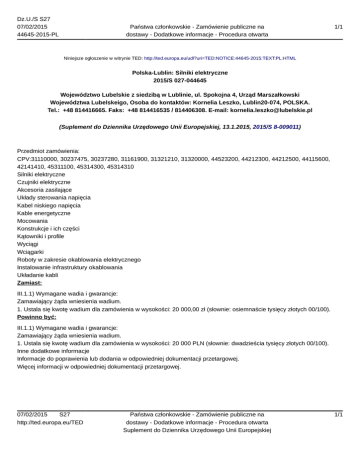 Dz.U./S S27 07/02/2015 44645-2015-PL Państwa członkowskie - Zamówienie publiczne na dostawy - Dodatkowe informacje - Procedura otwarta 1/1 Niniejsze ogłoszenie w witrynie TED: http://ted.europa.eu/udl?uri=TED:NOTICE:44645-2015:TEXT:PL:HTML Polska-Lublin: Silniki elektryczne 2015/S 027-044645 Województwo Lubelskie z siedzibą w Lublinie, ul. Spokojna 4, Urząd Marszałkowski Województwa Lubelskeigo, Osoba do kontaktów: Kornelia Leszko, Lublin20-074, POLSKA. Tel.: +48 814416665. Faks: +48 814416535 / 814406308. E-mail: [email protected] (Suplement do Dziennika Urzędowego Unii Europejskiej, 13.1.2015, 2015/S 8-009011) Przedmiot zamówienia: CPV:31110000, 30237475, 30237280, 31161900, 31321210, 31320000, 44523200, 44212300, 44212500, 44115600, 42141410, 45311100, 45314300, 45314310 Silniki elektryczne Czujniki elektryczne Akcesoria zasilające Układy sterowania napięcia Kabel niskiego napięcia Kable energetyczne Mocowania Konstrukcje i ich części Kątowniki i profile Wyciągi Wciągarki Roboty w zakresie okablowania elektrycznego Instalowanie infrastruktury okablowania Układanie kabli Zamiast: III.1.1) Wymagane wadia i gwarancje: Zamawiający żąda wniesienia wadium. 1. Ustala się kwotę wadium dla zamówienia w wysokości: 20 000,00 zł (słownie: osiemnaście tysięcy złotych 00/100). Powinno być: III.1.1) Wymagane wadia i gwarancje: Zamawiający żąda wniesienia wadium. 1. Ustala się kwotę wadium dla zamówienia w wysokości: 20 000 PLN (słownie: dwadzieścia tysięcy złotych 00/100). Inne dodatkowe informacje Informacje do poprawienia lub dodania w odpowiedniej dokumentacji przetargowej. Więcej informacji w odpowiedniej dokumentacji przetargowej. 07/02/2015 S27 http://ted.europa.eu/TED Państwa członkowskie - Zamówienie publiczne na dostawy - Dodatkowe informacje - Procedura otwarta Suplement do Dziennika Urzędowego Unii Europejskiej 1/1