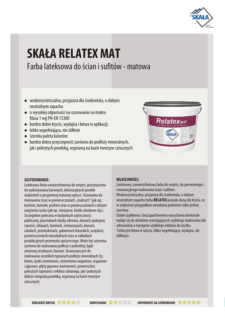 SKAŁA RELATEX MAT Farba lateksowa do ścian i sufitów - matowa l l l l l l wodorozcieńczalna, przyjazna dla środowiska, o słabym neutralnym zapachu o wysokiej odporności na szorowanie na mokro Klasa 1 wg PN-EN 13300 bardzo dobre krycie, wydajna i łatwa w aplikacji; lekko wypełniająca, nie żółknie szeroka paleta kolorów; bardzo dobra przyczepność zarówno do podłoży mineralnych, jak i pokrytych powłoką, wyprawą na bazie tworzyw sztucznych ZASTOSOWANIE: Lateksowa farba nawierzchniowa do wnętrz, przeznaczona do wykonywania barwnych, dekoracyjnych powłok malarskich o przyjemnej matowej optyce. Stosowana do malowania ścian w pomieszczeniach „mokrych” (jak np.: kuchnie, łazienki, pralnie) oraz w pomieszczeniach o dużym natężeniu ruchu (jak np.: korytarze, klatki schodowe itp.). Szczególnie polecana w budynkach użyteczności publicznej, placówkach służby zdrowia, domach spokojnej starości, sklepach, hotelach, restauracjach, biurach, szkołach, przedszkolach, gabinetach lekarskich, urzędach, pomieszczeniach mieszkalnych oraz w zakładach produkcyjnych przemysłu spożywczego. Może być używana zarówno do malowania podłoży o jednolitej, bądź zmiennej strukturze i barwie. Stosowana jest do malowania wszelkich typowych podłoży mineralnych (tj.: beton, tynki cementowe, cementowo-wapienne, wapienne i gipsowe, płyty gipsowo-kartonowe), powierzchni pokrytych tapetami z włókna szklanego, jak i pokrytych dobrze związaną powłoką, wyprawą na bazie tworzyw sztucznych. ZDOLNOŚĆ KRYCIA ODDYCHANIE WŁAŚCIWOŚCI: Lateksowa, nawierzchniowa farba do wnętrz, do pierwotnego i renowacyjnego malowania ścian i sufitów. Wodorozcieńczalna, przyjazna dla środowiska, o słabym neutralnym zapachu farba RELATEX posiada dużą siłę krycia, co w większości przypadków umożliwia położenie tylko jednej warstwy. Dzięki szybkiemu i bezzapachowemu wysychaniu doskonale nadaje się do obiektów wymagających szybkiego malowania lub odnawiania a następnie szybkiego oddania do użytku. Farba jest łatwa w użyciu, lekko wypełniająca, wydajna, nie żółknąca. ODPORNOŚĆ NA SZOROWANIE TECHNOLOGIA WYKONANIA: Przygotowanie podłoża: Podłoże musi być nośne, odtłuszczone, czyste i suche oraz wolne od plam i wykwitów pochodzenia biologicznego i chemicznego (solnych lub korozyjnych). W przypadku występowania porostu glonów i/lub grzybów należy zastosować preparat do usuwania skażenia biologicznego. Przebarwienia, plamy nikotynowe i wykwity po zaciekach wodnych należy wcześniej przemalować farbą izolującą. Wszelkie luźne, niezwiązane z podłożem warstwy (jak np.: odspojone tynki lub złuszczone powłoki malarskie) trzeba usunąć. W sytuacji, gdy nierówności podłoża są znaczne, ścianę należy wstępnie wyrównać zaprawą wyrównawczą, a następnie całą powierzchnię przeszpachlować gładzią szpachlową. Przy małych nierównościach można od razu zastosować gładź szpachlową. Zastosowanie wyżej wymienionych zapraw i gładzi powinno być zgodne z kartami technicznymi tych produktów. Podłoża chłonne przed nakładaniem gładzi szpachlowych i/lub zapraw wyrównawczych należy zagruntować preparatem SKAŁA PGU (GRUNTEX EKO), przypadku nanoszenia farby na nowo wykonanych podłożach mineralnych (tj.: beton, tynk wapienny, cementowo-wapienny i cementowy) należy zachować min. 2-tygodniowy okres sezonowania. Gruntowanie: Przed nanoszeniem farby podłoże chłonne lub pyliste (silnie kredujące) należy zagruntować preparatem SKAŁA PGU (GRUNTEX EKO). Podłoża gipsowe należy gruntować farbą SKAŁA PG (GRUNTEX NANO-HYDROSOL LF). Okres wysychania zastosowanego na podłożu preparatu lub farby w optymalnych warunkach (w temperaturze +20°C i wilgotności względnej powietrza 55%) wynosi ok. 3 godzin. Po całkowitym wyschnięciu naniesionego na podłoże preparatu można przystąpić do nanoszenia farby. Uwaga: Podłoży o niskiej chłonności (tj.: wyprawy tynkarskie na bazie tworzyw sztucznych lub dyspersyjne powłoki malarskie) nie należy gruntować, a jedynie zmyć wodą. Przygotowanie produktu: Opakowanie zawiera produkt gotowy do stosowania. W razie potrzeby farbę można rozcieńczyć niewielką ilością wody (dodając do pierwszego malowania max. 10% objętościowych, do drugiego max. 5%). Sposób nakładania: Farbę nanosić na podłoże w dwóch warstwach za pomocą pędzla malarskiego, wałka lub przez natrysk (w tym także metodą „airless”). Drugą warstwę farby nanosić dopiero po wyschnięciu pierwszej warstwy. WSKAZÓWKI WYKONAWCZE: W celu uniknięcia różnic kolorystycznych niezbędne jest wykonanie powierzchni stanowiącej odrębną całość architektoniczną w jednym cyklu roboczym. Podczas nanoszenia i wysychania farby powinna występować temperatura powietrza powyżej +5°C. ZUŻYCIE: Przy dwukrotnym malowaniu na gładkim podłożu: 0,22 L/m 2 CZYSZCZENIE NARZĘDZI PRACY: Bezpośrednio po zakończeniu prac, użyte narzędzia należy spłukać czystą wodą. UWAGA: Należy chronić oczy i skórę. W przypadku zatarcia oka, przepłukać je dużą ilością czystej wody a następnie skontaktować się z lekarzem. PRZECHOWYWANIE: Okres przydatności do użycia wynosi 18 miesięcy od daty produkcji. Przechowywać w oryginalnie zamkniętym opakowaniu, w temperaturze powyżej +5°C WYSYCHANIE: Czas schnięcia naniesionej na podłoże jednej warstwy farby (w temperaturze +20°C i przy wilgotności względnej powietrza 55%) wynosi ok. 3 godzin. Pomieszczenia zamknięte po malowaniu należy wietrzyć, aż do zaniku specyficznego zapachu. Uwaga: Niska temperatura i wysoka wilgotność powietrza wydłużają okres wysychania farby. Karta techniczna TDS-SKAŁA RELATEX MAT aktualizacja 27.12.2012 SKAŁA TYCHY Spółka z ograniczoną odpowiedzialnością Sp. K. ul. Towarowa 23, 43-100 Tychy www.skala.com.pl, [email protected] Niniejsza instrukcja określa zakres stosowania materiału i zalecany sposób prowadzenia 