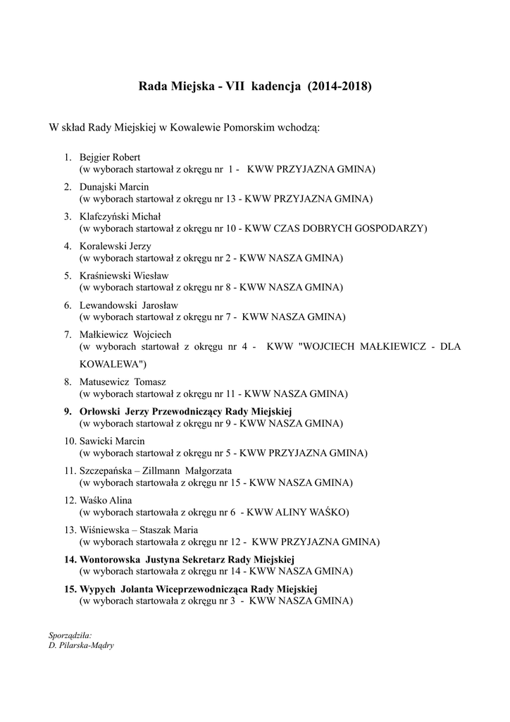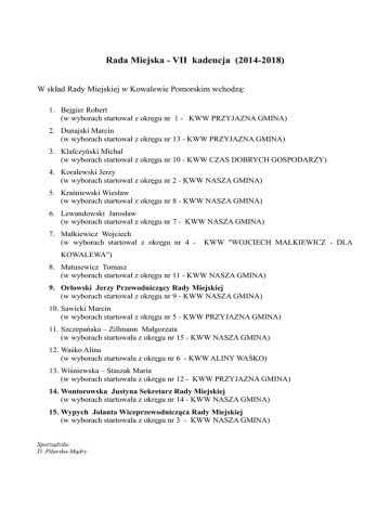 Rada Miejska - VII kadencja (2014-2018) W skład Rady Miejskiej w Kowalewie Pomorskim wchodzą: 1. Bejgier Robert (w wyborach startował z okręgu nr 1 - KWW PRZYJAZNA GMINA) 2. Dunajski Marcin (w wyborach startował z okręgu nr 13 - KWW PRZYJAZNA GMINA) 3. Klafczyński Michał (w wyborach startował z okręgu nr 10 - KWW CZAS DOBRYCH GOSPODARZY) 4. Koralewski Jerzy (w wyborach startował z okręgu nr 2 - KWW NASZA GMINA) 5. Kraśniewski Wiesław (w wyborach startował z okręgu nr 8 - KWW NASZA GMINA) 6. Lewandowski Jarosław (w wyborach startował z okręgu nr 7 - KWW NASZA GMINA) 7. Małkiewicz Wojciech (w wyborach startował z okręgu nr 4 - KWW "WOJCIECH MAŁKIEWICZ - DLA KOWALEWA") 8. Matusewicz Tomasz (w wyborach startował z okręgu nr 11 - KWW NASZA GMINA) 9. Orłowski Jerzy Przewodniczący Rady Miejskiej (w wyborach startował z okręgu nr 9 - KWW NASZA GMINA) 10. Sawicki Marcin (w wyborach startował z okręgu nr 5 - KWW PRZYJAZNA GMINA) 11. Szczepańska – Zillmann Małgorzata (w wyborach startowała z okręgu nr 15 - KWW NASZA GMINA) 12. Waśko Alina (w wyborach startowała z okręgu nr 6 - KWW ALINY WAŚKO) 13. Wiśniewska – Staszak Maria (w wyborach startowała z okręgu nr 12 - KWW PRZYJAZNA GMINA) 14. Wontorowska Justyna Sekretarz Rady Miejskiej (w wyborach startowała z okręgu nr 14 - KWW NASZA GMINA) 15. Wypych Jolanta Wiceprzewodnicząca Rady Miejskiej (w wyborach startowała z okręgu nr 3 - KWW NASZA GMINA) Sporządziła: D. Pilarska-Mądry