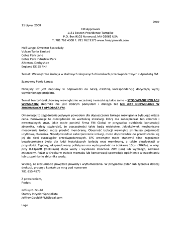 Logo 11 Lipiec 2008 FM Approvals 1151 Boston-Providence Turnpike P.O. Box 9102 Norwood, MA 02062 USA T: 781 762 4300 F: 781 762 9375 www.fmapprovals.com Neil Lange, Dyrektor Sprzedaży Vulcan Tanks Limited Cotes Park Lane Cotes Park Industrial Park Alfreton, Derbyshire England DE 55 4NJ Temat: Wewnętrzna izolacja w stalowych skręcanych zbiornikach przeciwpożarowych z Aprobatą FM Szanowny Panie Lange: Niniejszy list jest napisany w odpowiedzi na naszą ostatnią korespondencję dotyczącą wyżej wymienionego projektu. Temat ten był dyskutowany wewnętrznie wcześniej i wnioski są takie same – STOSOWANIE IZOLACJI WEWNĄTRZ zbiornika nie jest dobrym pomysłem i dlatego też NIE JEST DOZWOLONE W ZBIORNIKACH Z APROBATĄ FM. Omawiając to zagadnienie jedynym powodem dla dopuszczenia takiego rozwiązania była jego niższa cena. Porównując te oszczędności do wartością instalacji, którą ma zabezpieczać ten zbiornik i ewentualnych strat, jakie może ponieść firma FM Global w przypadku osłabienia konstrukcji zbiornika, należy stwierdzić, że oszczędności takie będą nieistotne. Jakiekolwiek mechaniczne mocowanie izolacji może przebić membranę. Obecność izolacji wewnątrz zmniejsza pojemność użytkową zbiornika. Nieodpowiednie zabezpieczenie izolacji, może doprowadzić do przedostania się jej do sieci rurociągów przeciwpożarowych. EPS wewnątrz może stanowić silne zagrożenie bezpieczeństwa życia dla ludzi instalujących izolację oraz membranę, a także eksploatacji w przyszłości. Typowy, ekspandowany polistyren ma wytrzymałość na ściskanie 10psi (70kPa), w więc przy 0.43psi/ft (9.8kPa/m) słupa wody i wysokości zbiornika 20ft (6m) lub wyższego, zostanie zniszczony. Pożar w środku w trakcie montażu lub konserwacji spowoduje opóźnienie w napełnianiu lub uzupełnianiu zbiornika wodą. Wierzę, że zrozumiecie powyższe powody i wytłumaczenia. W przypadku pytań lub życzenia dalszej dyskusji, proszę o kontakt ze mną pod numerem 781-255-4873 Z poważaniem, Podpis Jeffrey E. Gould Starszy Inżynier Specjalista [email protected] Logo